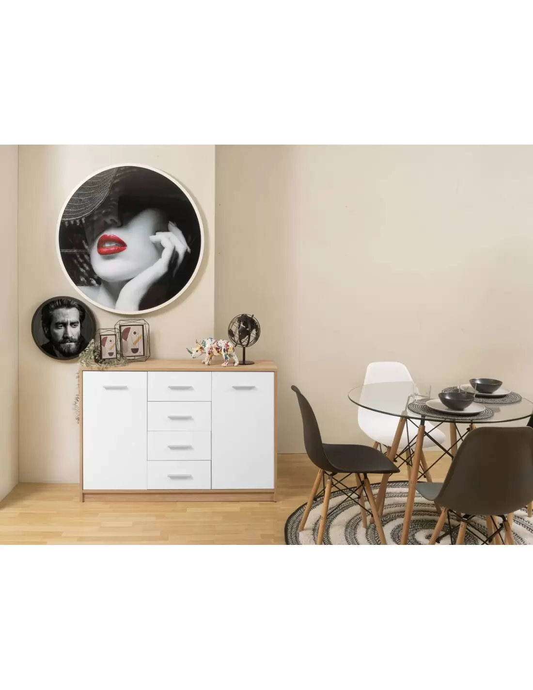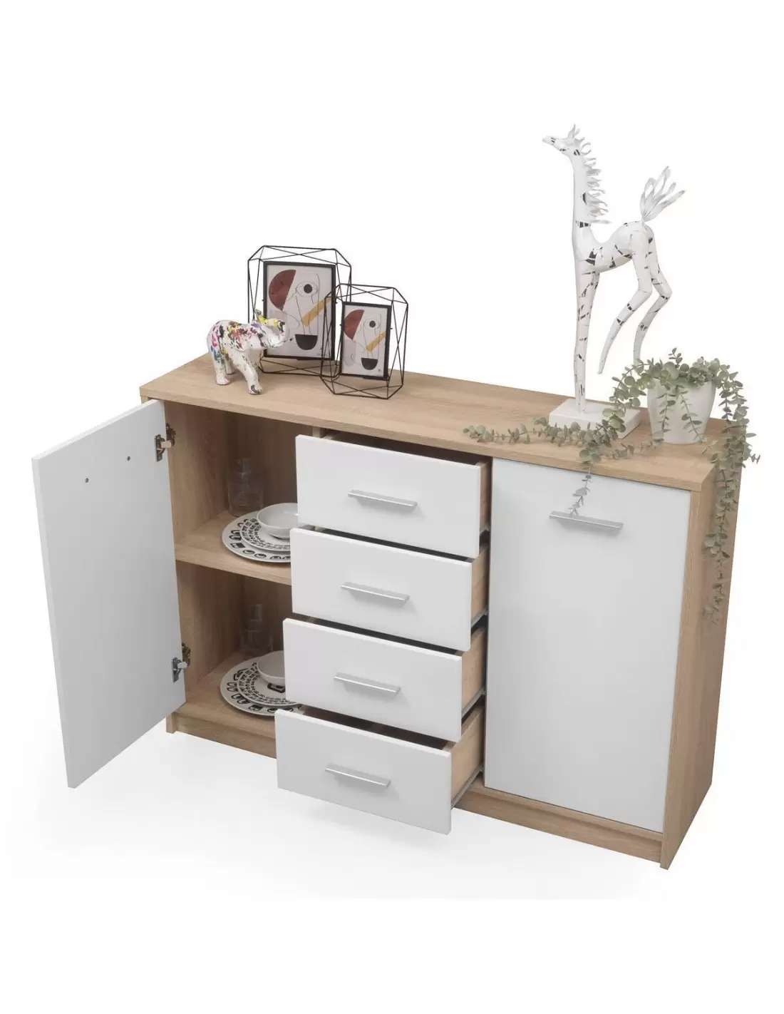 FORMENTERA es un mueble de salón modular funcional y actual.Disfruta de un salón con estilo y sin problemas de espacio con esta solución de gran versatilidad y dimensiones ajustadas.Compuesto por un mueble de tv, con puertas abatibles y un práctico hueco para tecnología, un mueble bajo con puerta y estantes, un mueble alto con puerta y vitrina con luz LED...