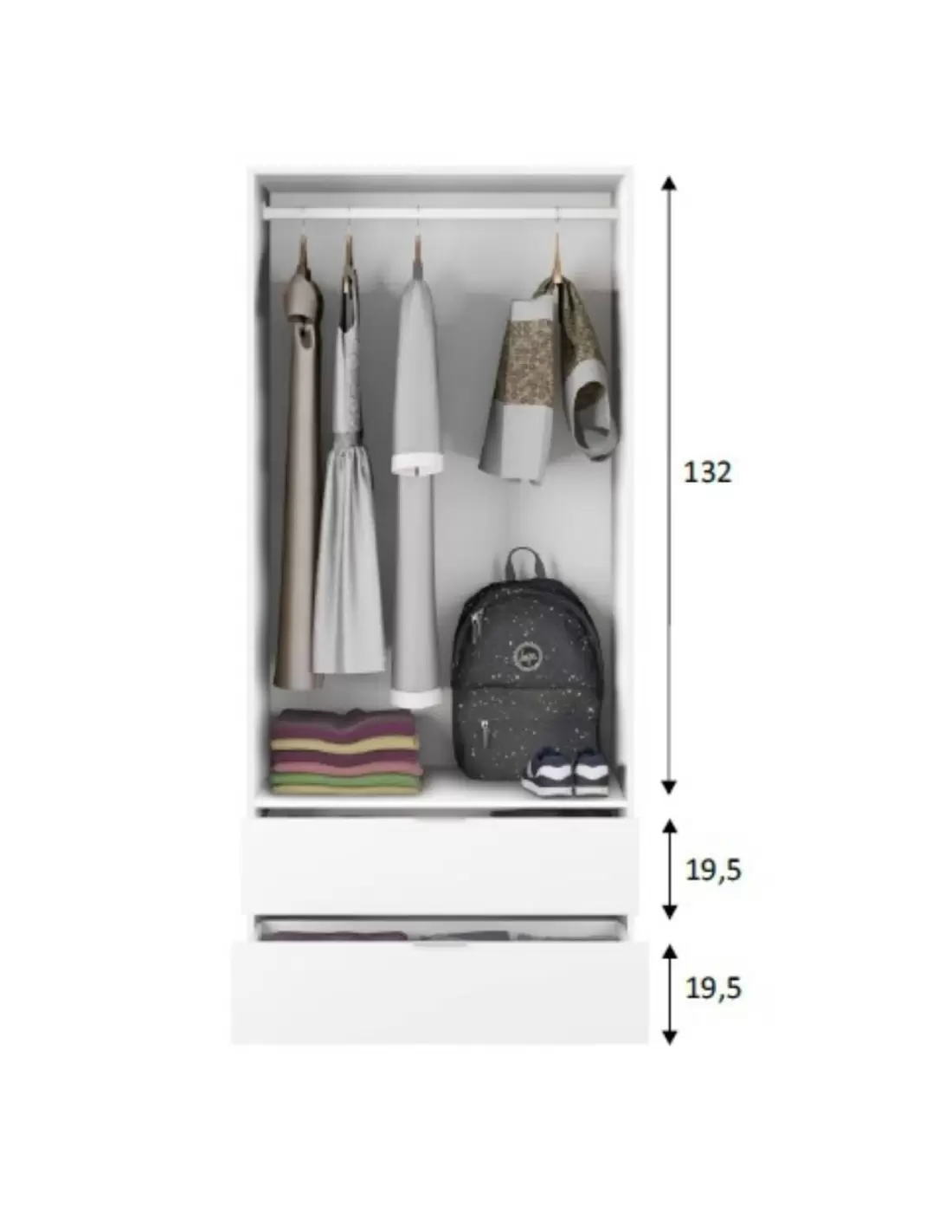 Este armario de 2 puertas incluye una barra de colgar en su interior y 2 cajones inferiores, lo que lo convierte en una opción versátil y funcional para organizar ropa y accesorios. Es ideal para dormitorios o vestidores que requieren una solución de almacenamiento completa.