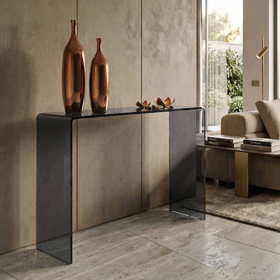 Su diseño de cristal curvado aporta una sensación de ligereza que resulta ideal en espacios de entrada, donde se busca un mueble funcional pero visualmente ligero.