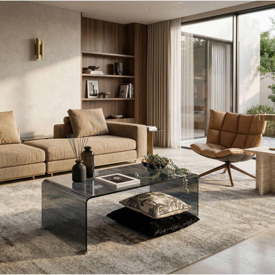 Para quienes buscan funcionalidad sin renunciar al diseño, la mesa de centro Coffee con ruedas es una opción ideal. Está fabricada en cristal curvado de una sola pieza y cuenta con ruedas discretas que permiten moverla fácilmente según las necesidades del espacio.