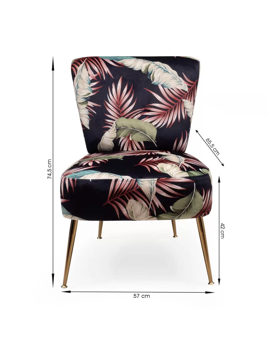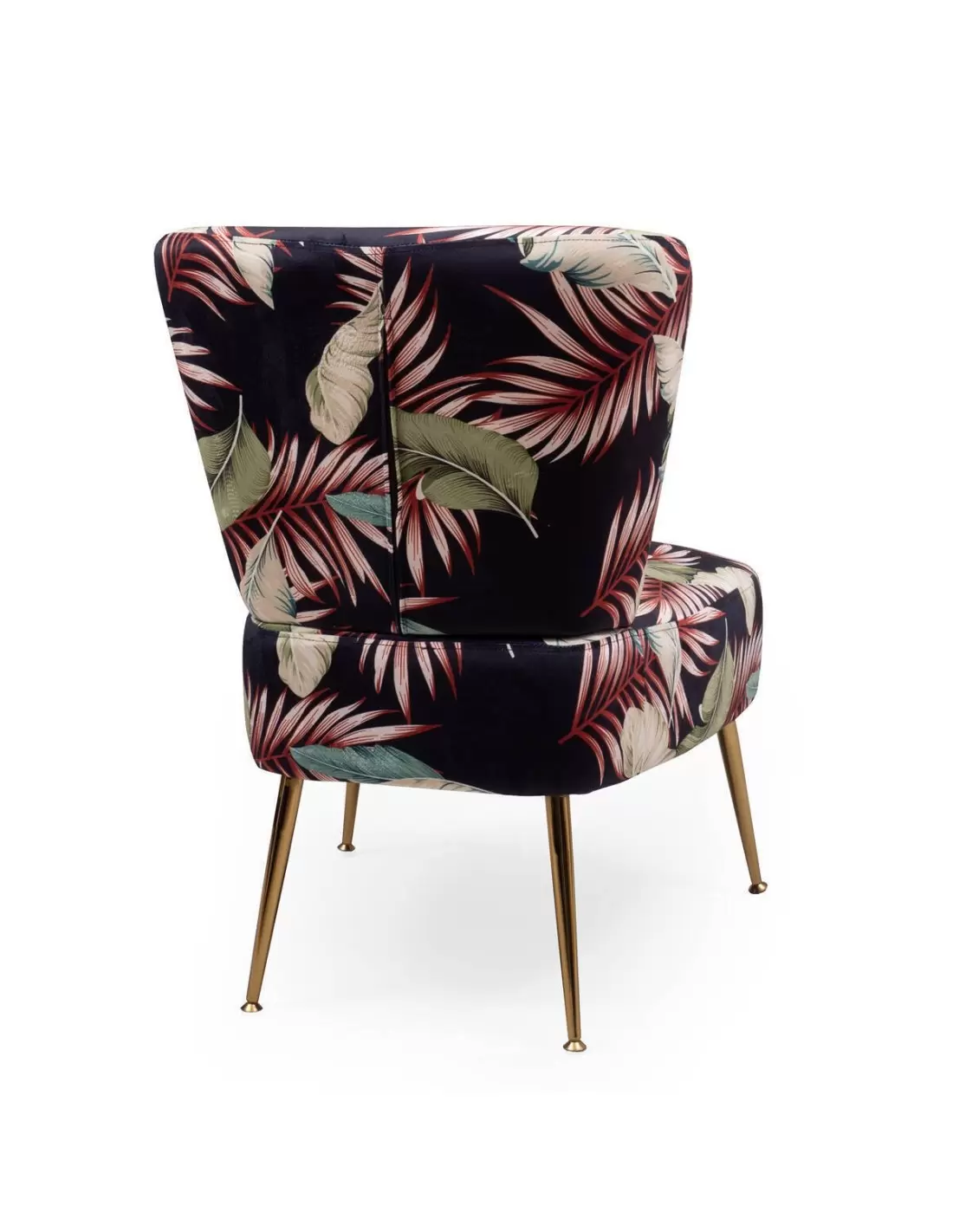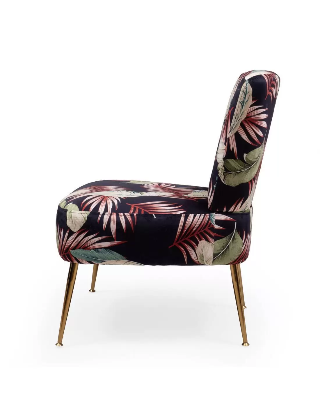 Butaca descalzadora DIVA AMAZÓNICA tapizada en tela estampada con patas metálicas en acabado dorado