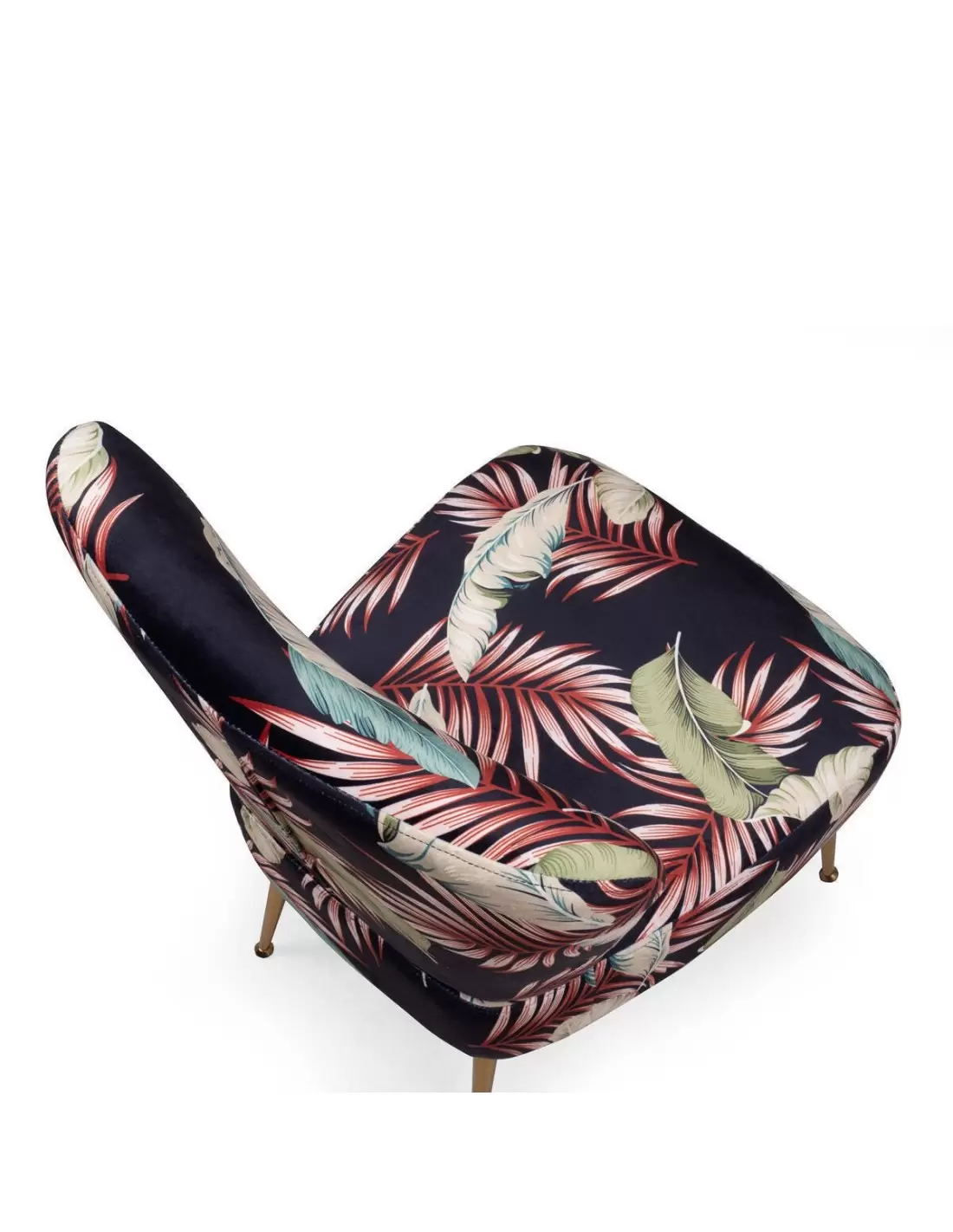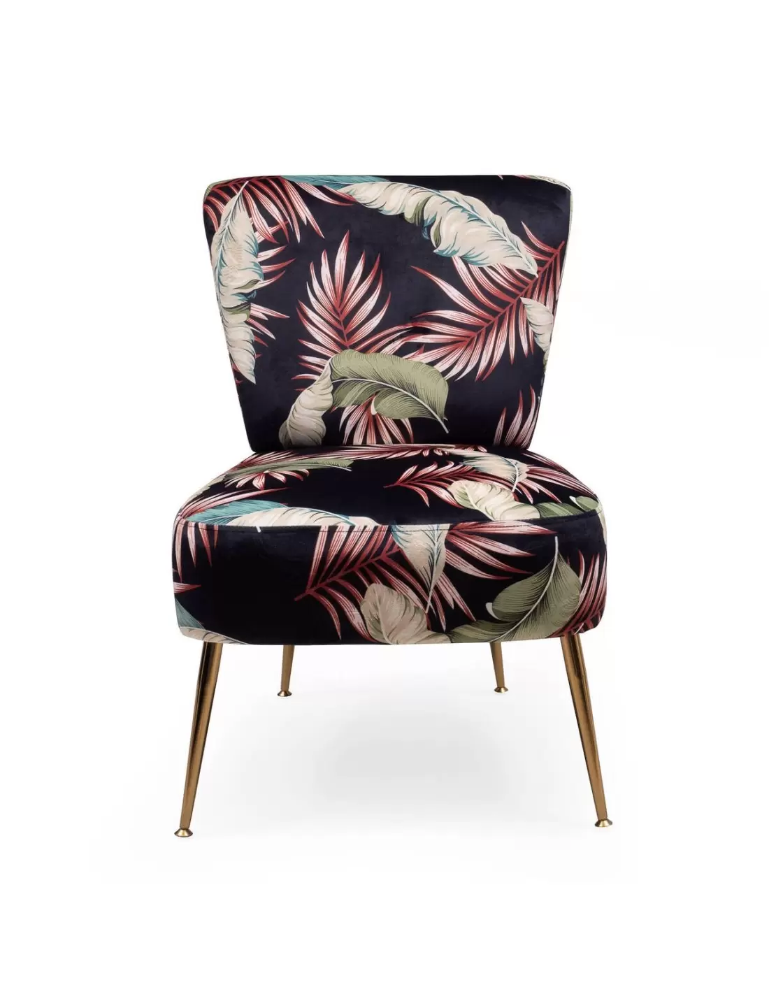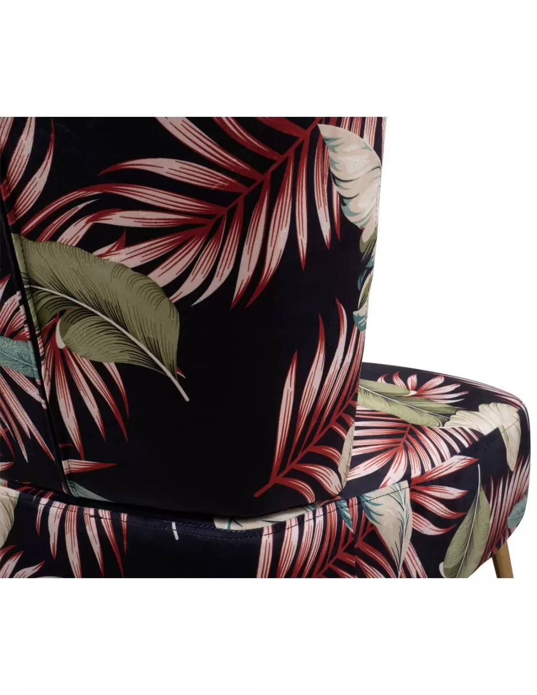 Butaca descalzadora DIVA AMAZÓNICA tapizada en tela estampada con patas metálicas en acabado dorado