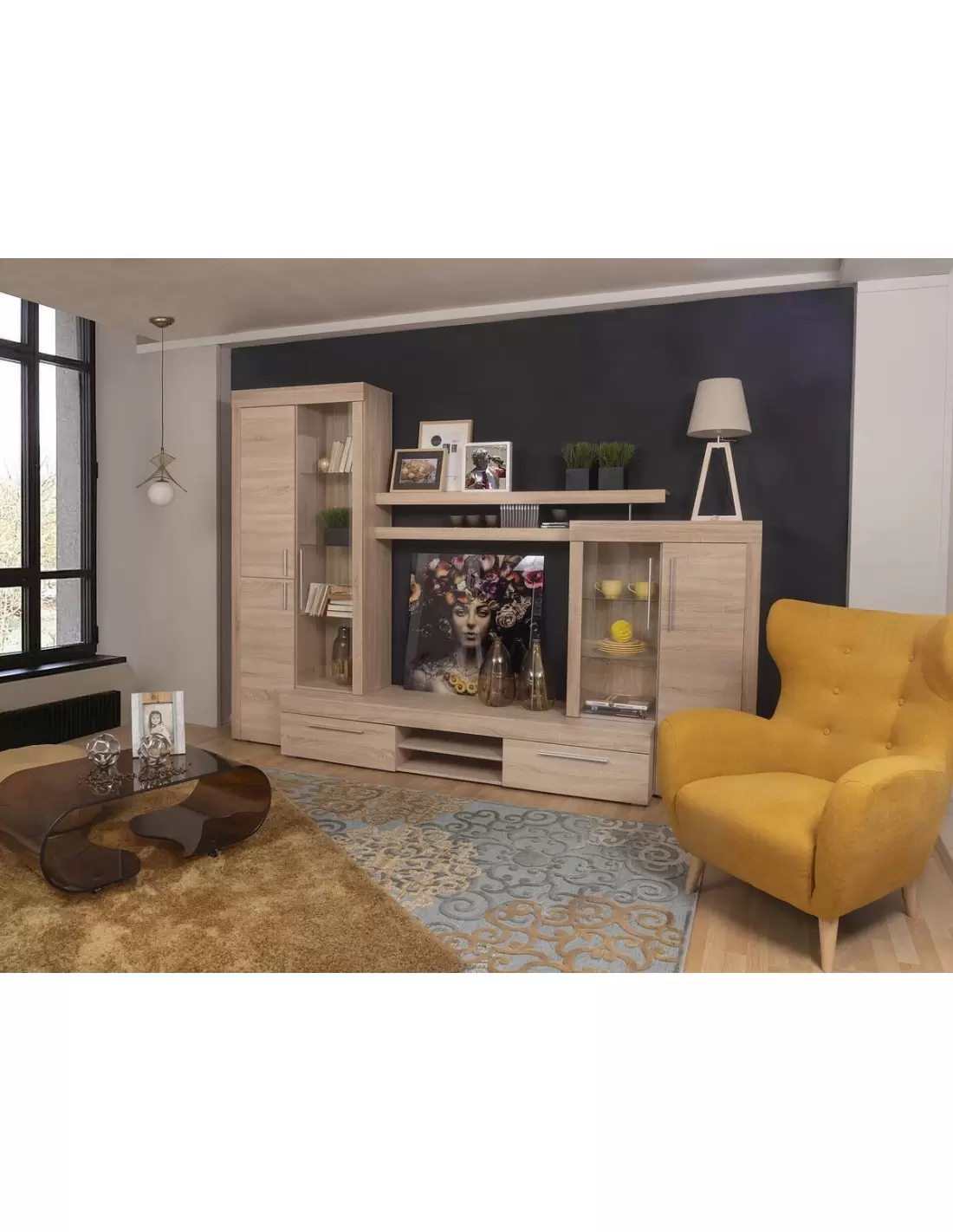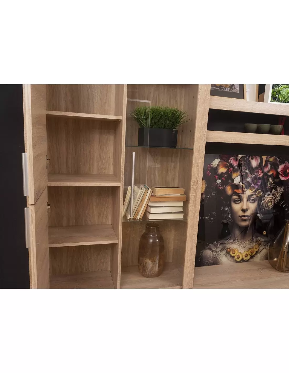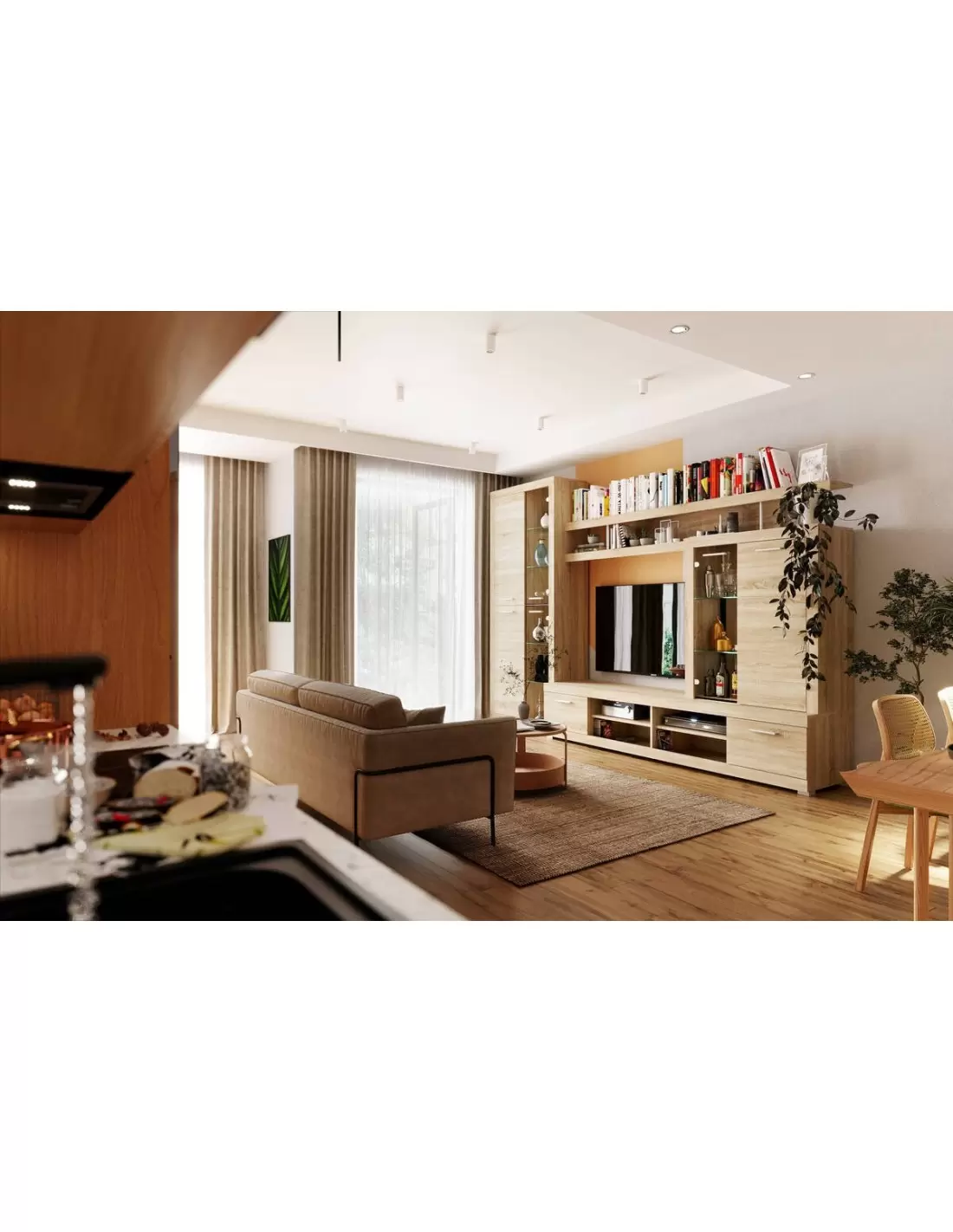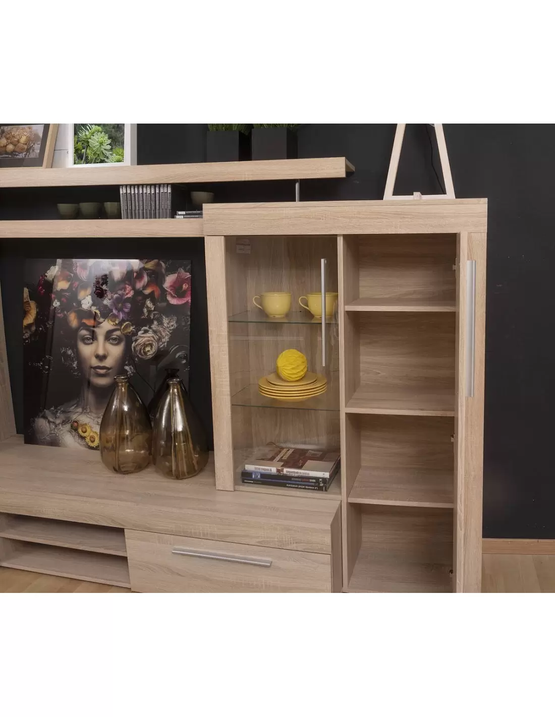 FORMENTERA es un mueble de salón modular funcional y actual.Disfruta de un salón con estilo y sin problemas de espacio con esta solución de gran versatilidad y dimensiones ajustadas.Compuesto por un mueble de tv, con puertas abatibles y un práctico hueco para tecnología, un mueble bajo con puerta y estantes, un mueble alto con puerta y vitrina con luz LED...