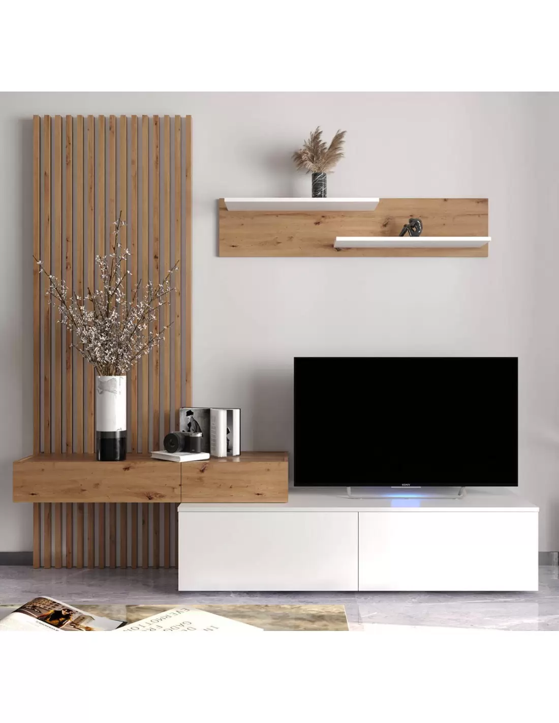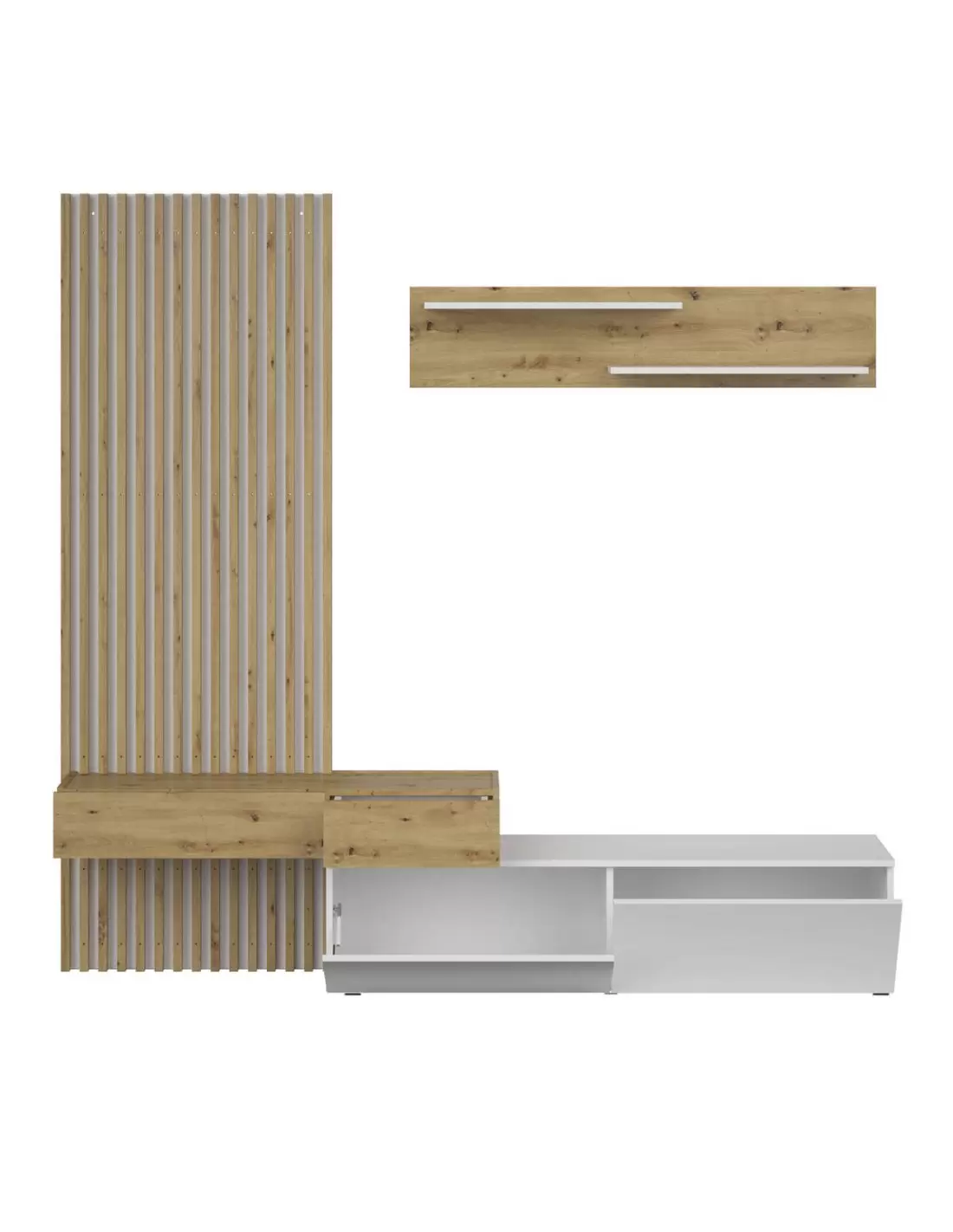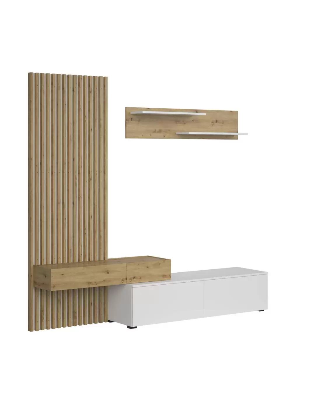 MENORCA es un mueble de salón modular elegante y actual.Disfruta de un salón con estilo y sin problemas de espacio con el mueble MENORCA.MENORCA está compuesto por un mueble de tv, dos vitrinas con luz LED para mostrar tus objetos personales y dos estanterías adosadas al conjunto.Está acabado en laminado sintético color roble sonoma, un color natural...