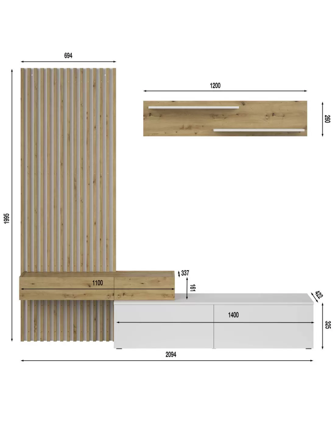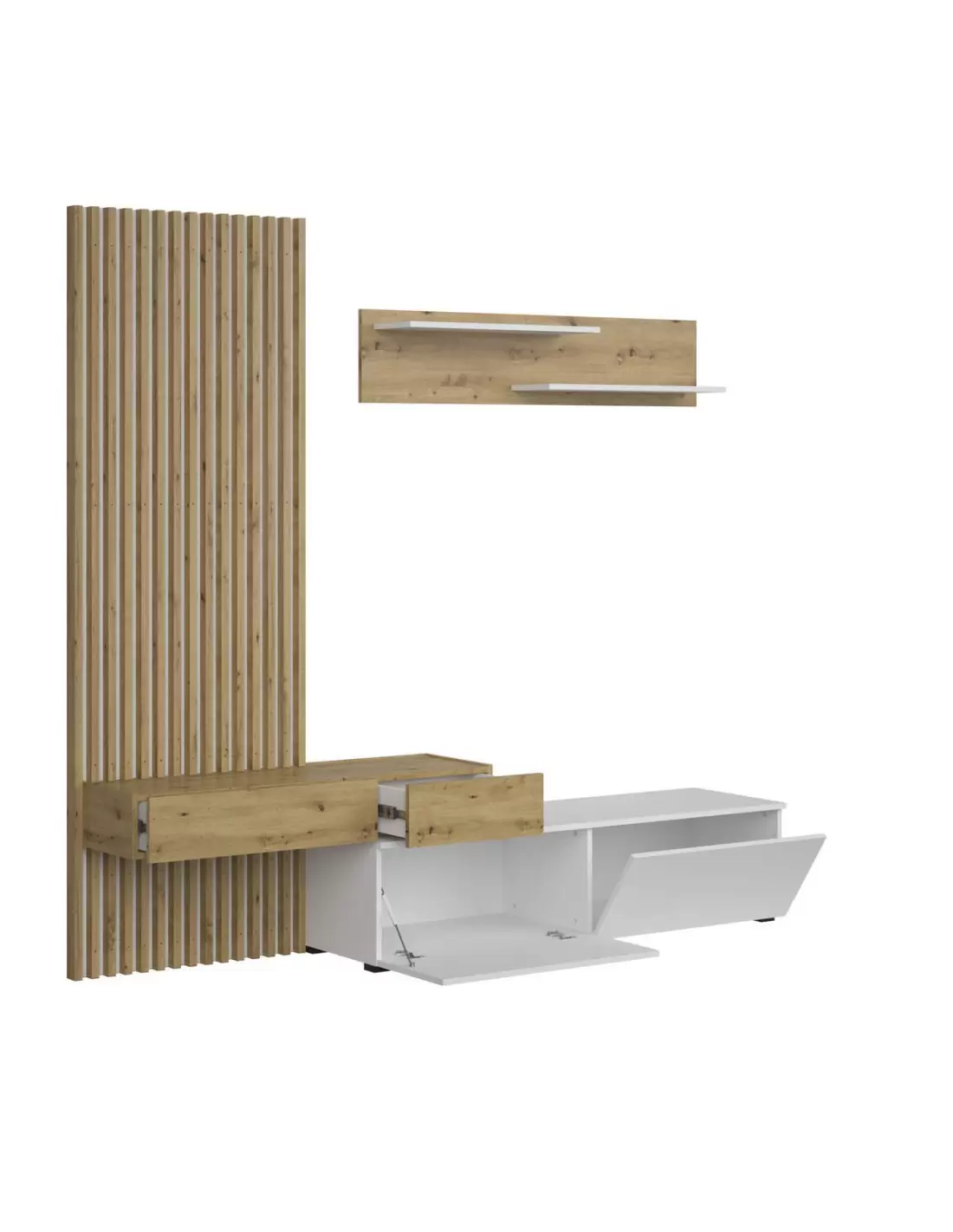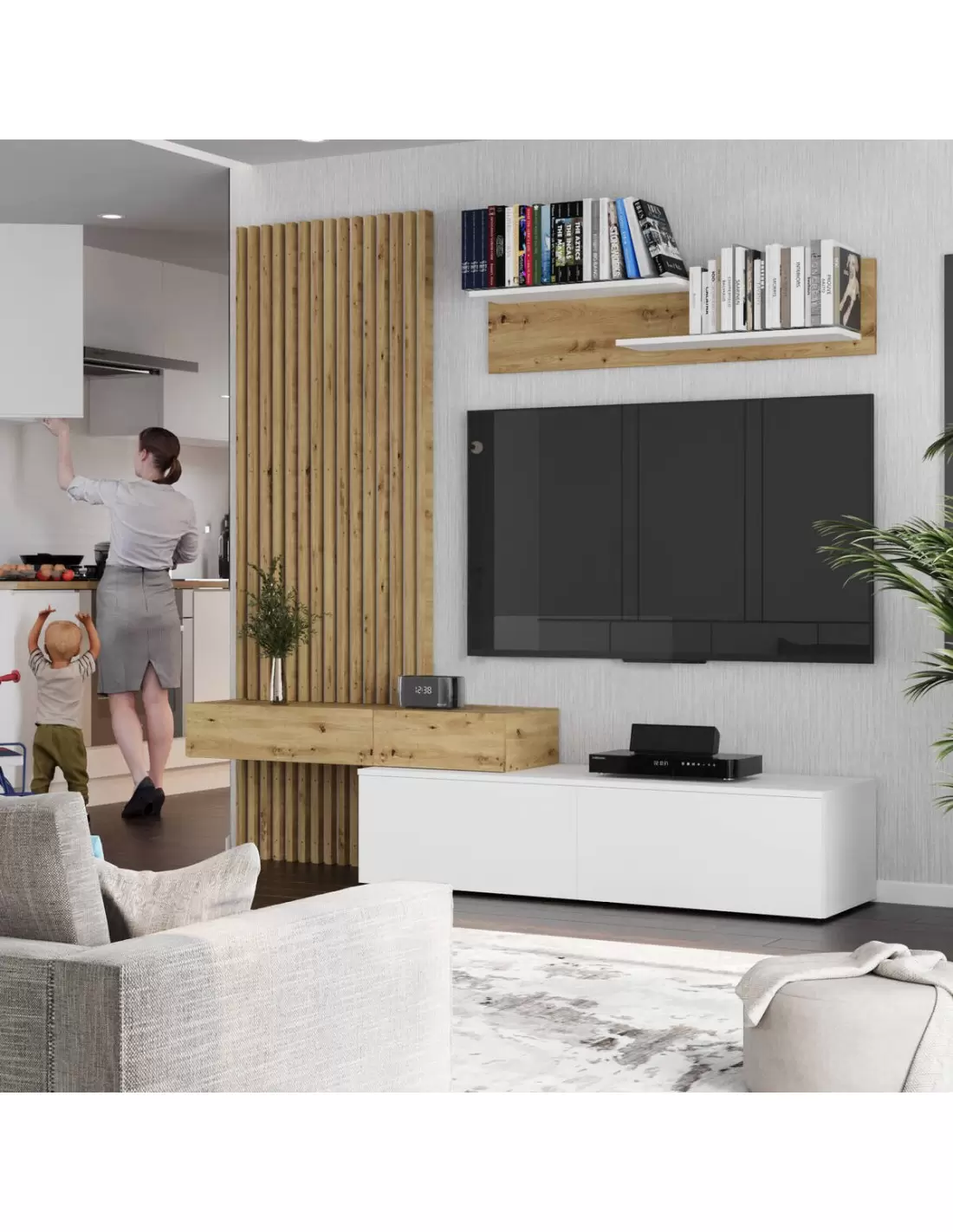 MENORCA es un mueble de salón modular elegante y actual.Disfruta de un salón con estilo y sin problemas de espacio con el mueble MENORCA.MENORCA está compuesto por un mueble de tv, dos vitrinas con luz LED para mostrar tus objetos personales y dos estanterías adosadas al conjunto.Está acabado en laminado sintético color roble sonoma, un color natural...