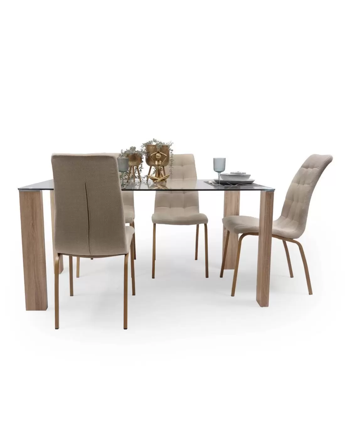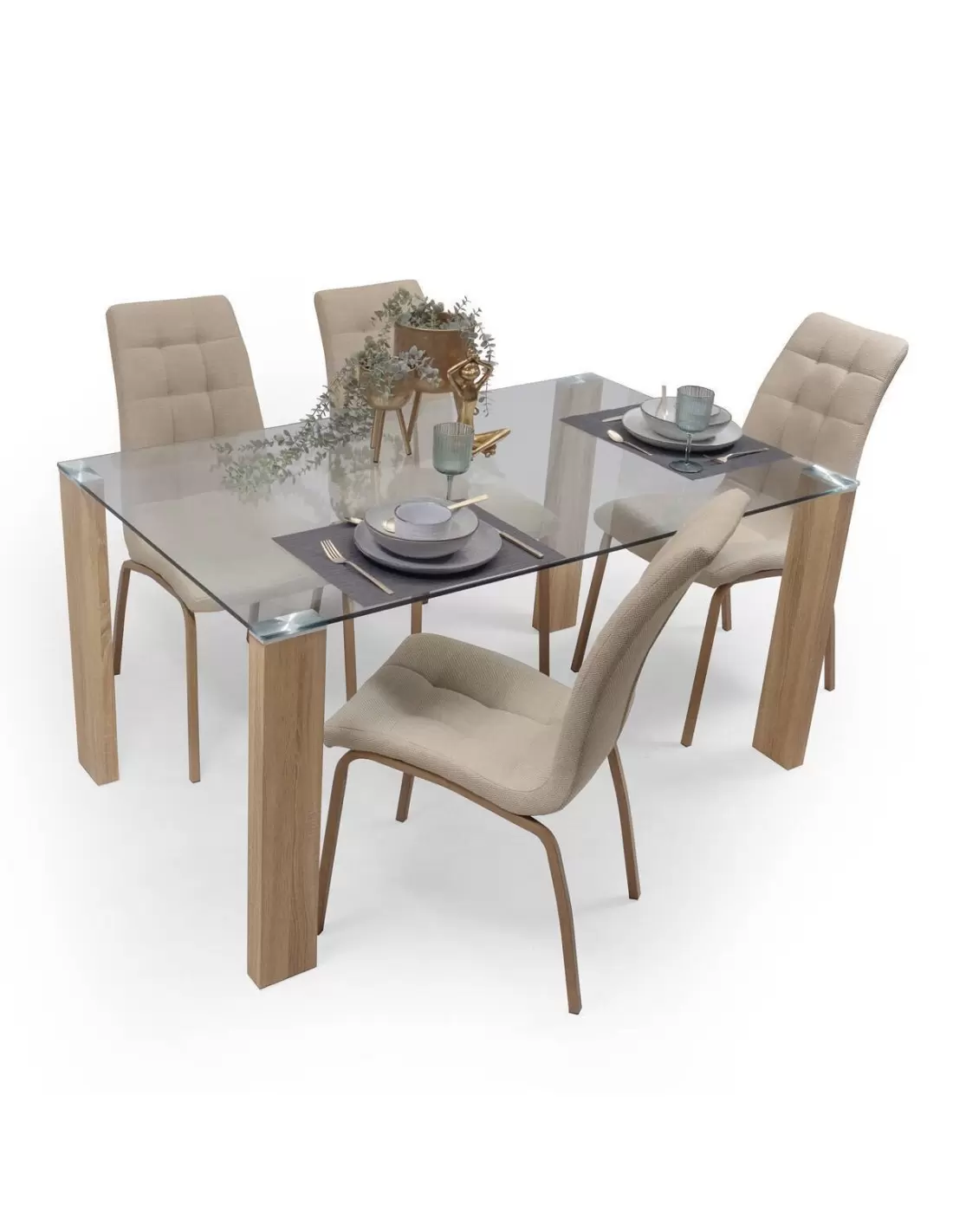 Conjunto de comedor GEMA ROSSET, mesa de cristal 140x90 cm, 4 sillas tapizadas color beige