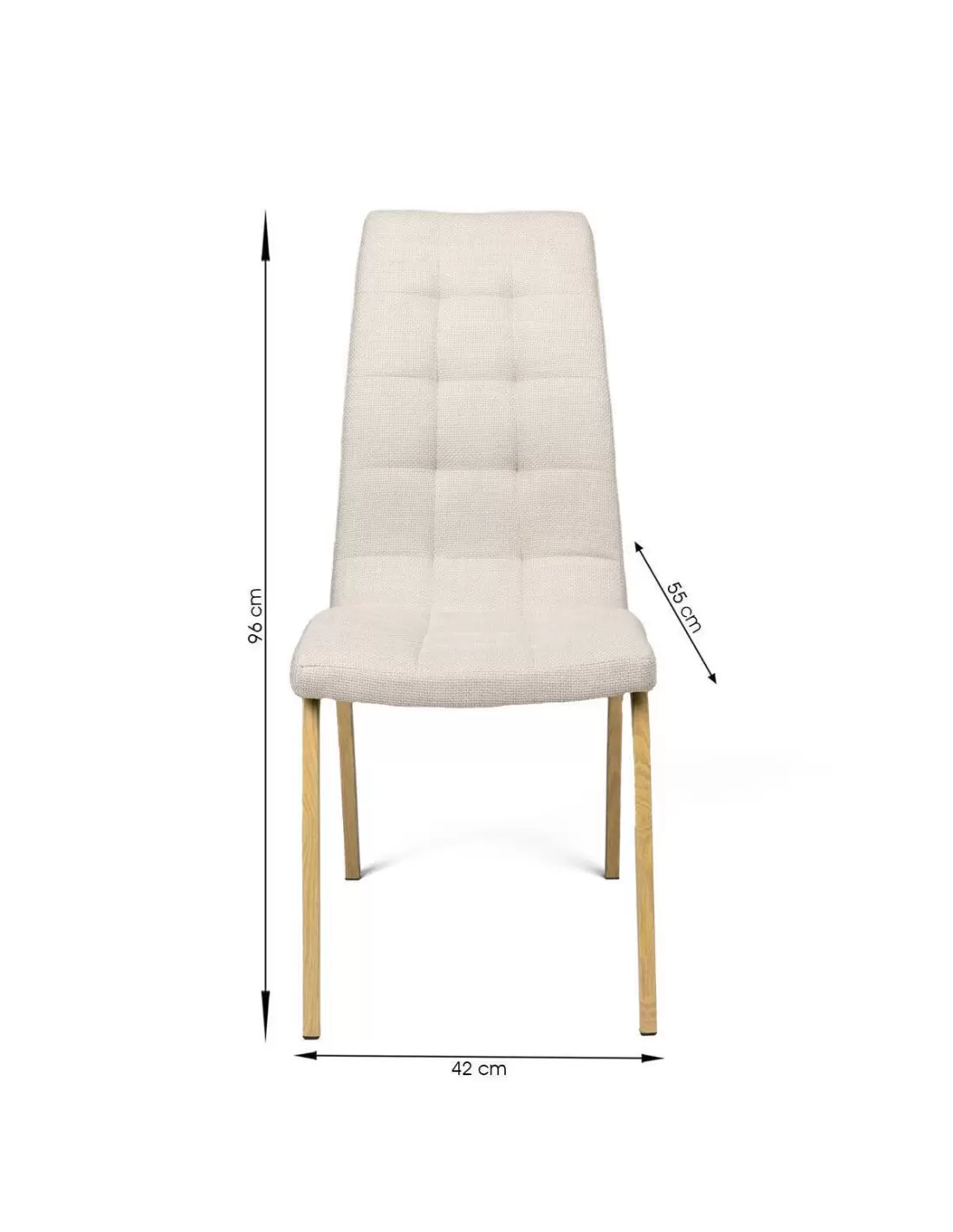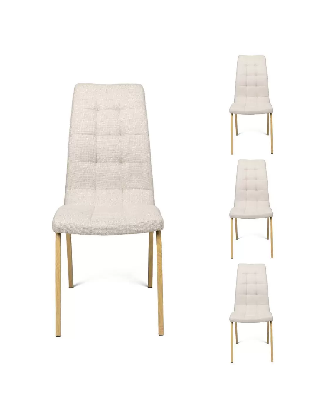 Las 4 sillas de comedor tapizadas GEMA destacan por su comodidad y original diseño. Su asiento está tapizado en tela en color beige a modo de capitoné. Las originales patas de diseño curvado son metálicas en acabado color madera.