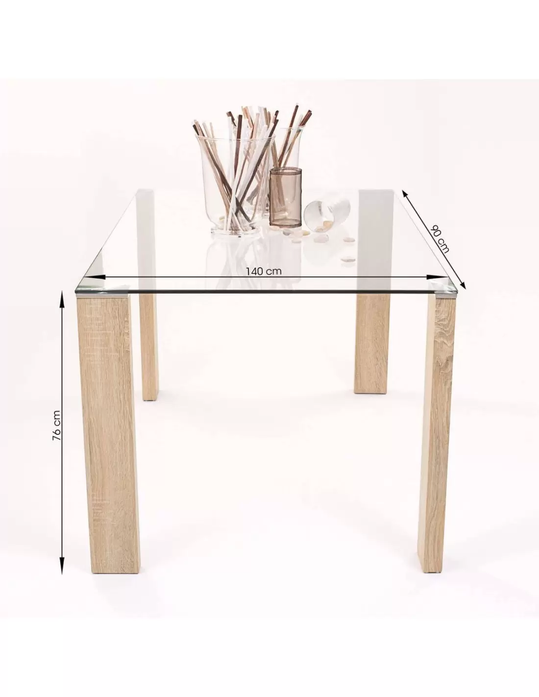 ROSSET es una mesa de comedor de diseño minimalista, ligera y elegante. Es ideal si buscas una mesa sencilla y funcional. Su sobre es de cristal templado transparente de 140x90 cm y 10 mm de grosor. Las patas son de MDF con terminación en un laminado color madera de roble acabado natural.