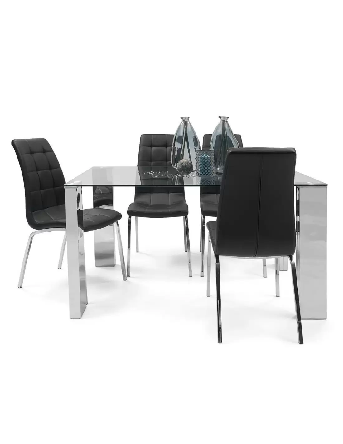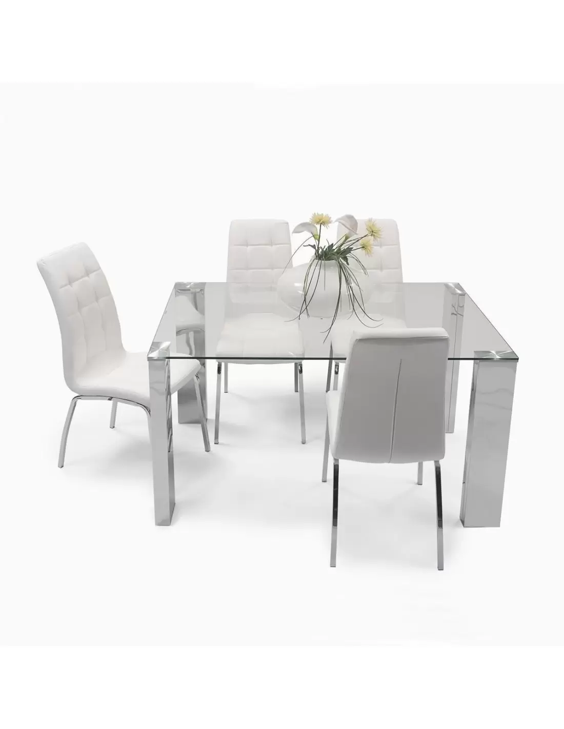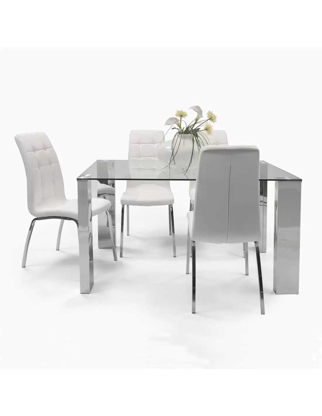 Conjunto de comedor KARINA II, mesa de cristal de 140x90 cm, 4 sillas tapizadas en polipiel o tela con patas de acero cromado
