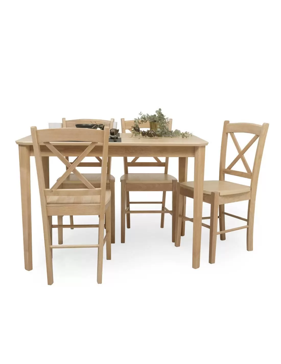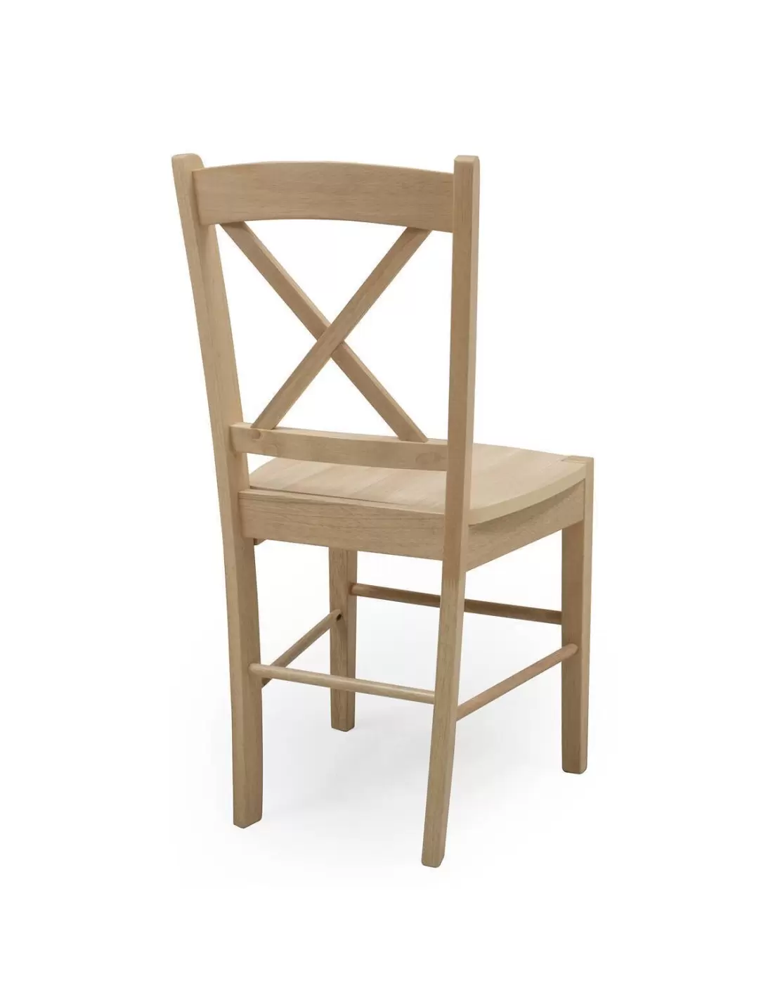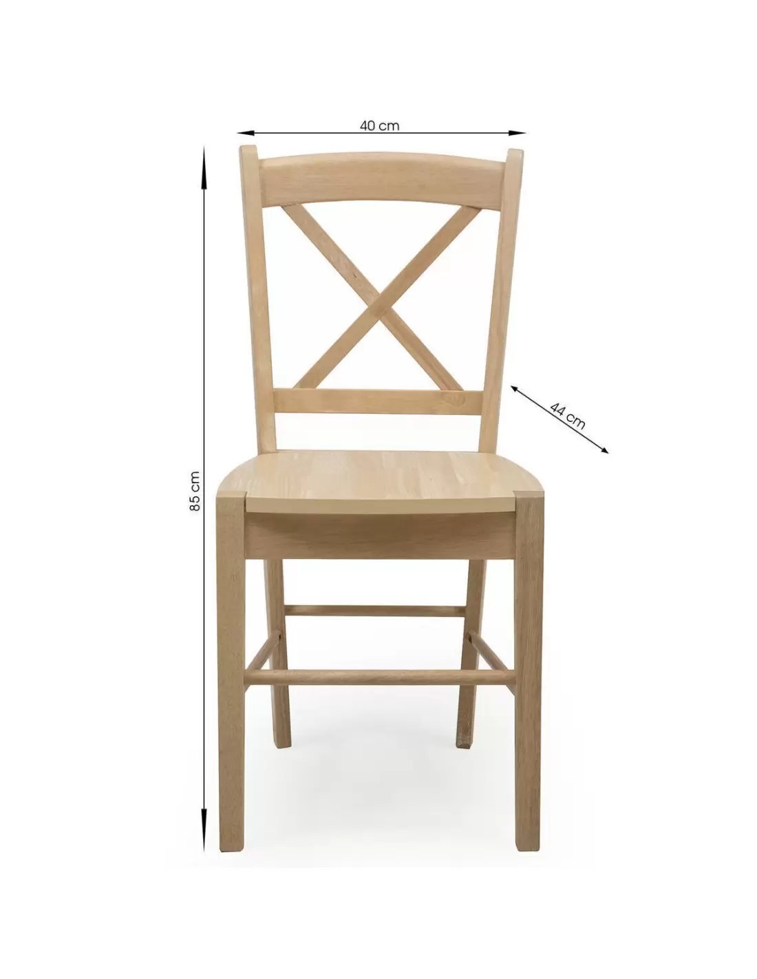 Las 4 sillas, de diseño clásico y sencillo, están hechas de madera y MDF y tienen un respaldo en forma de aspa con pala curva.