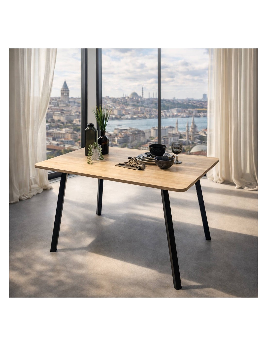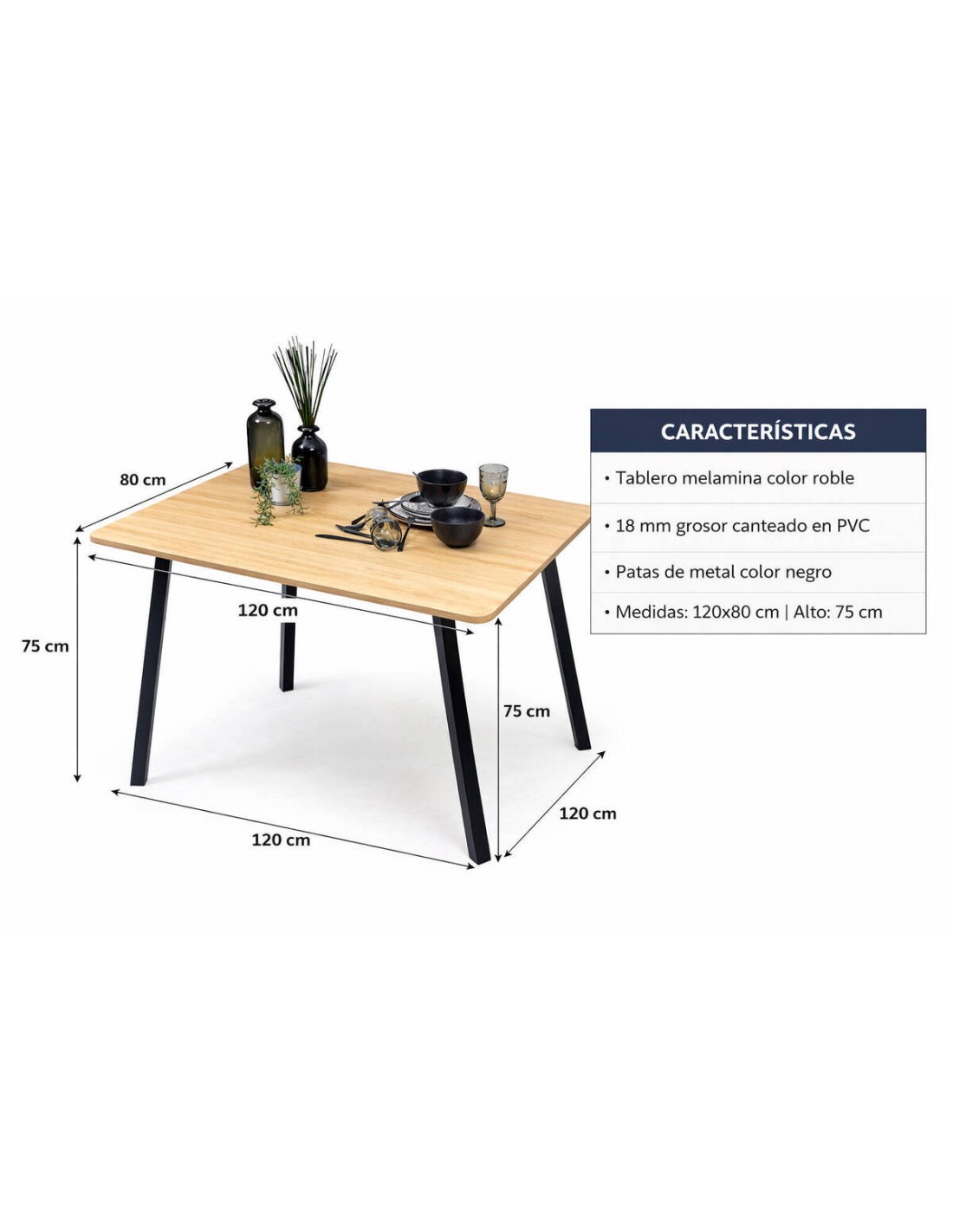 La mesa de comedor cuenta con tapa de melamina en color roble, combinada con una estructura metálica en negro mate, aportando un diseño actual y resistente.