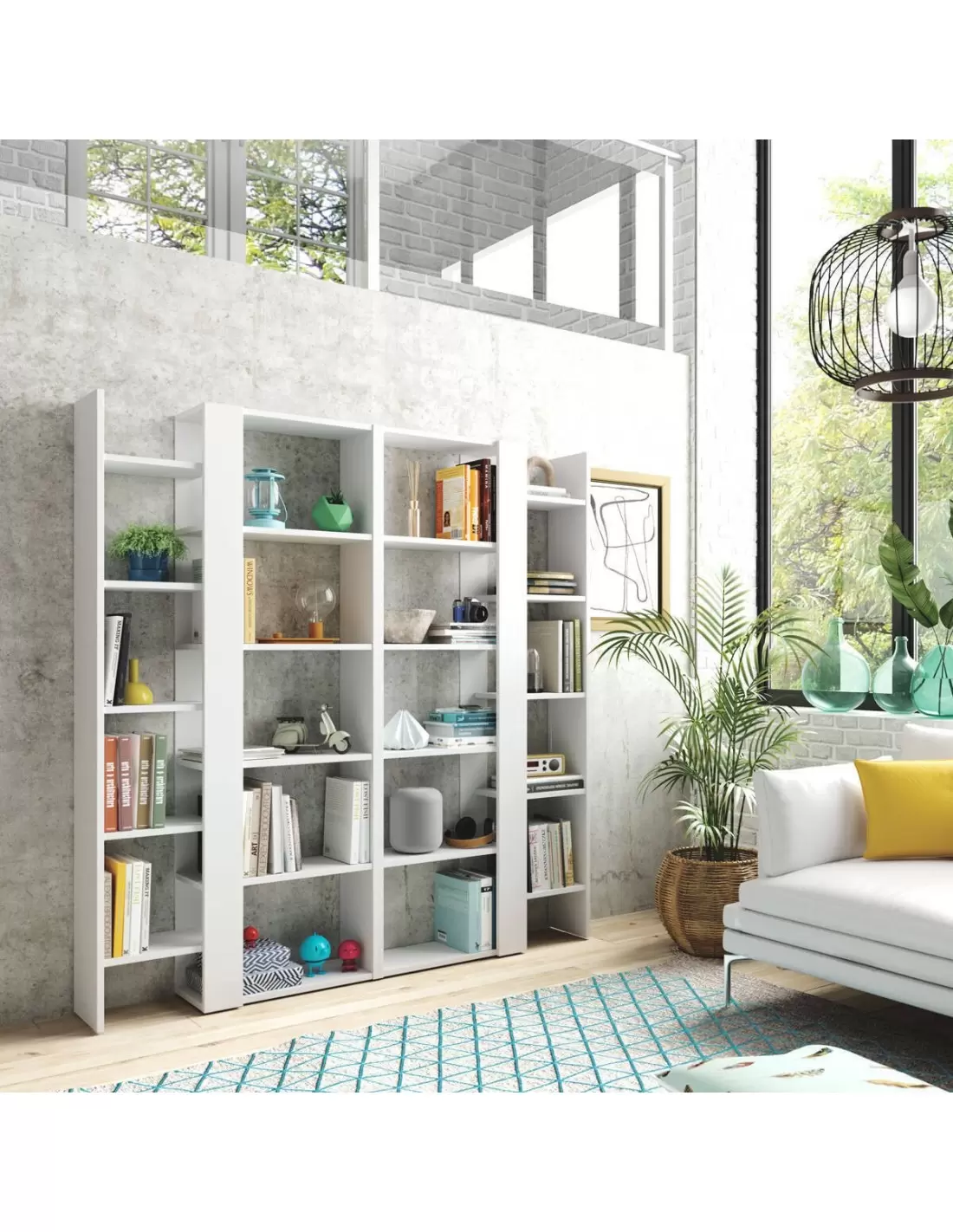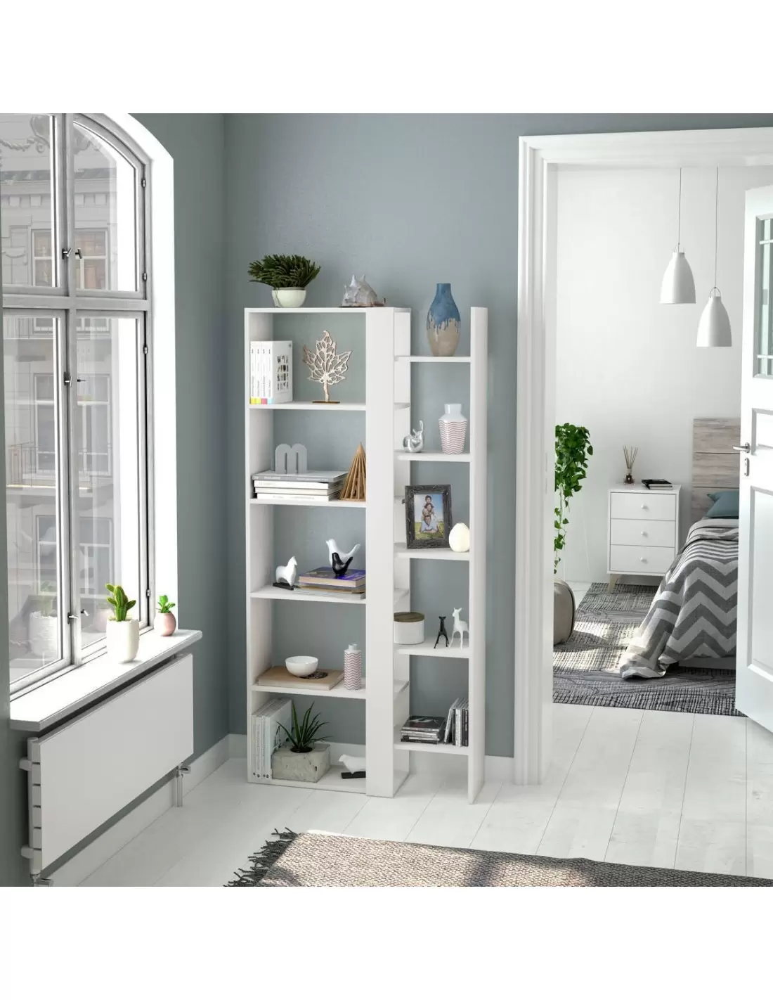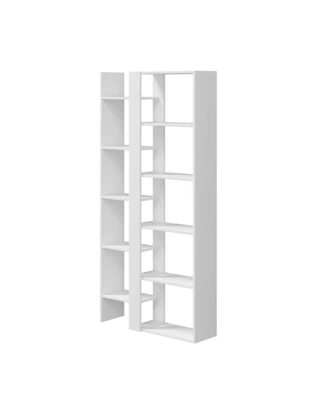 MYKONOS es una estantería alta de doble cuerpo diseño moderno en color blanco artik con once estantes práctica y moderna.