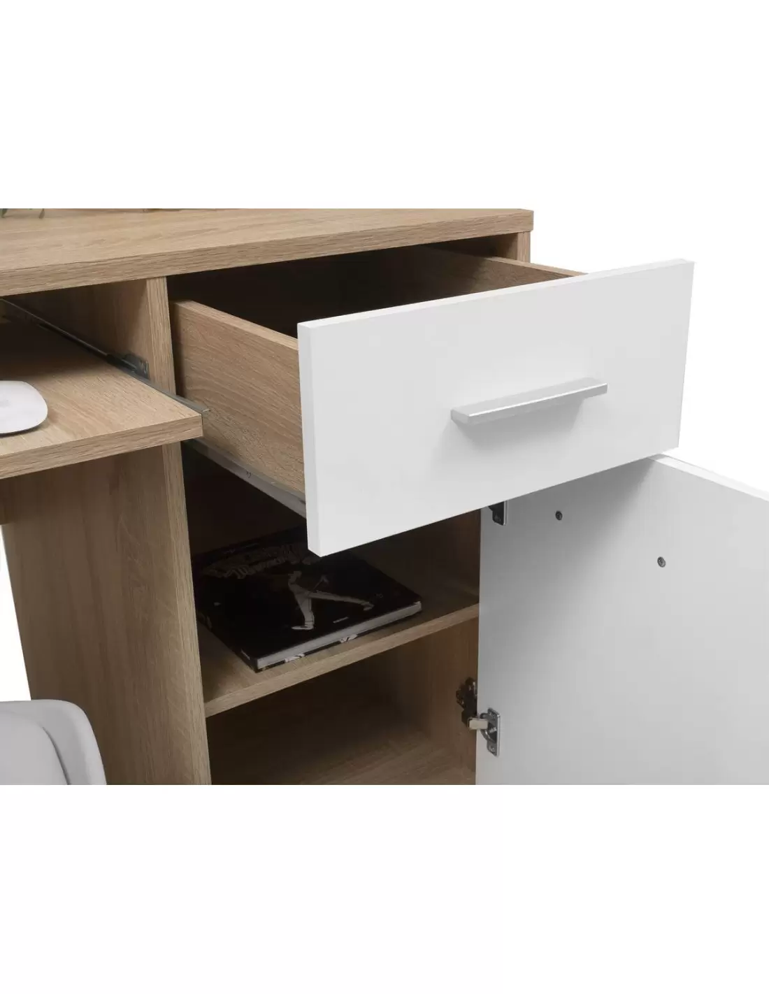 KENTO cuenta con un cajón y un armario con balda y puerta en su lateral para disponer de espacio extra en tu escritorio y de una bandeja extraíble para tu teclado.