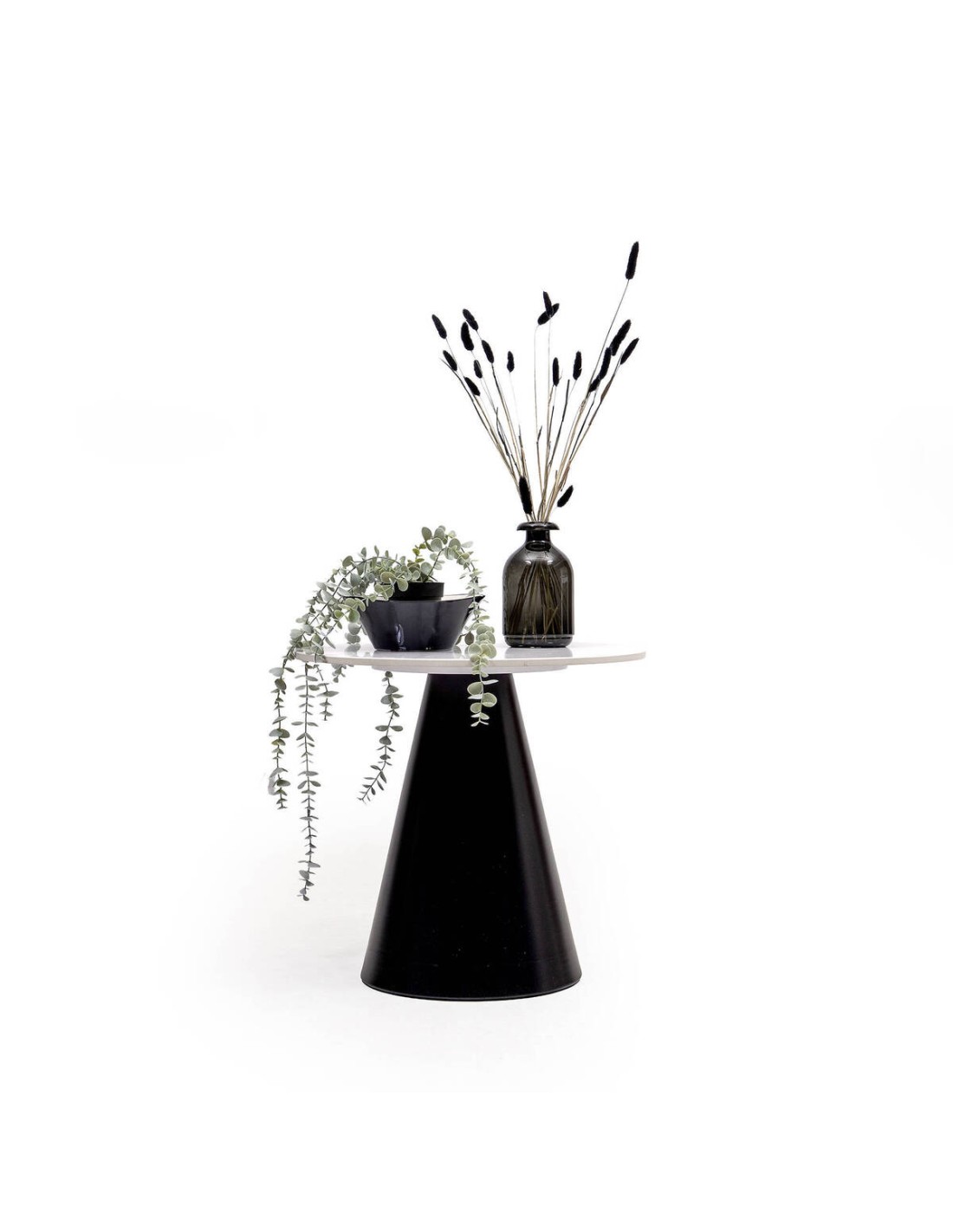 Mesas auxiliar redonda Lúmica de 50 cm. con tapa porcelánica mármol blanco y base metálica.