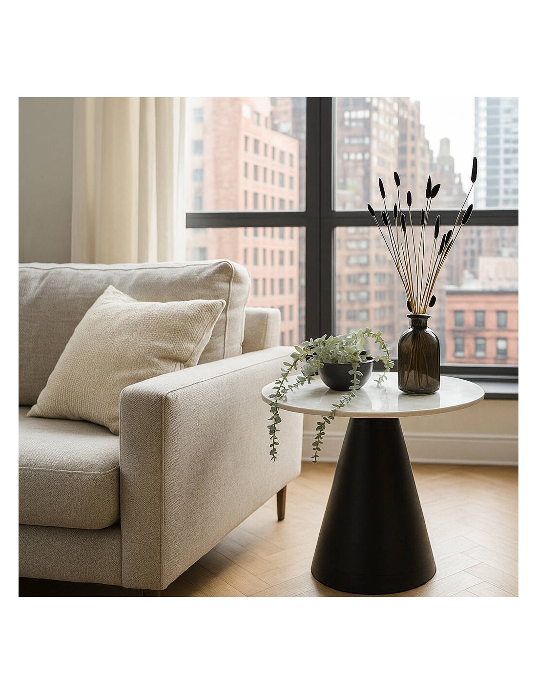 Su tapa porcelánica efecto mármol blanco aporta elegancia, sofisticación y resistencia, mientras que el pie central metálico aporta estabilidad y un estilo moderno de líneas limpias. Perfecta como mesa auxiliar colocada de manera independiente en distintos rincones, o junto a su hermana de 70 cm. Se adaptan a salones minimalistas, modernos o de lujo.