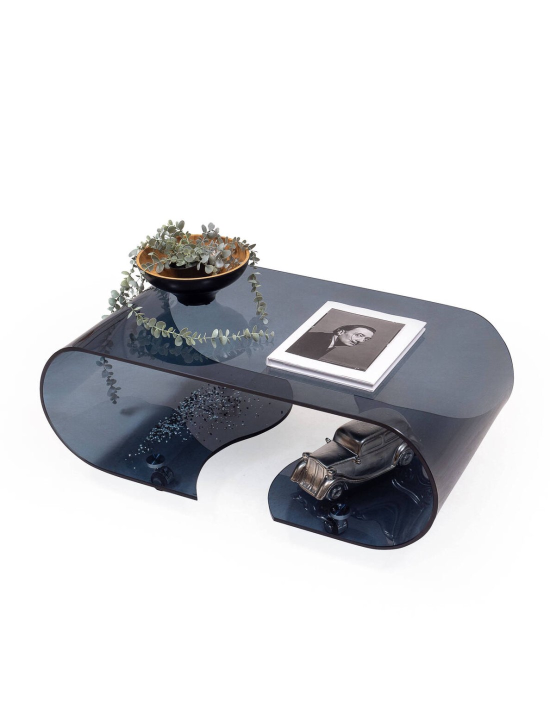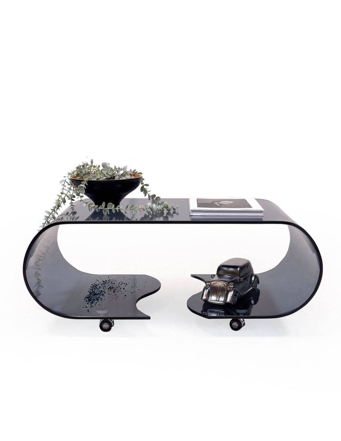 Mesa de centro con ruedas y cristal curvado de una pieza COFFEE SMOKE GRIS de 90x50x36,5 cm