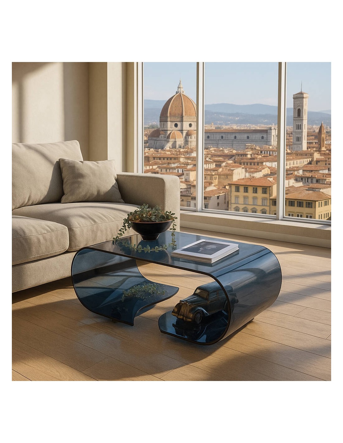COFFEE es una mesa de centro de cristal curvado transparente de 12 mm de grosor.