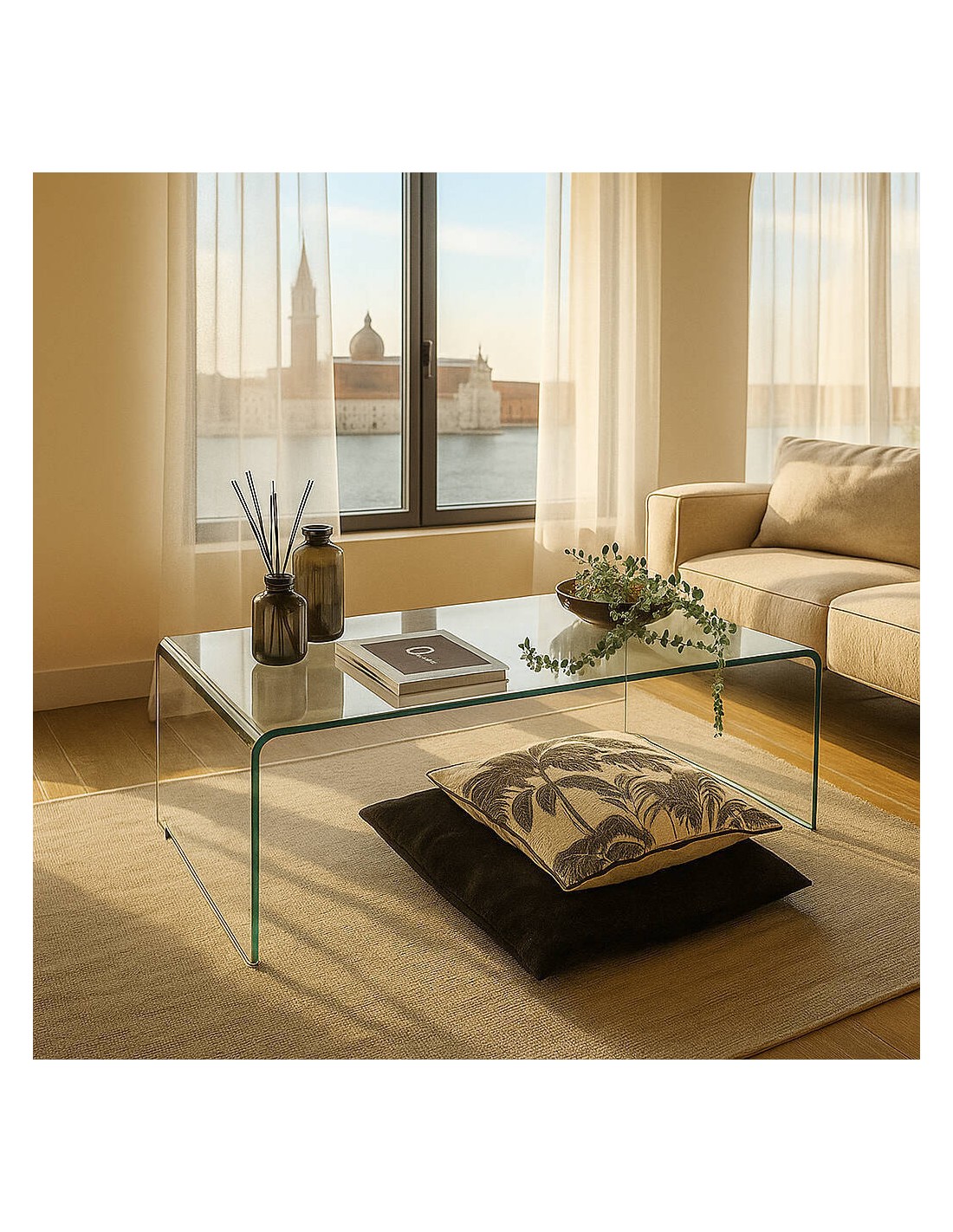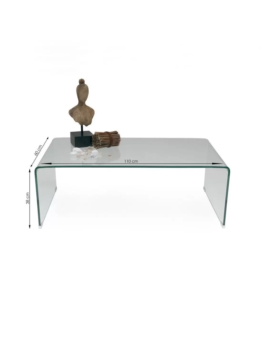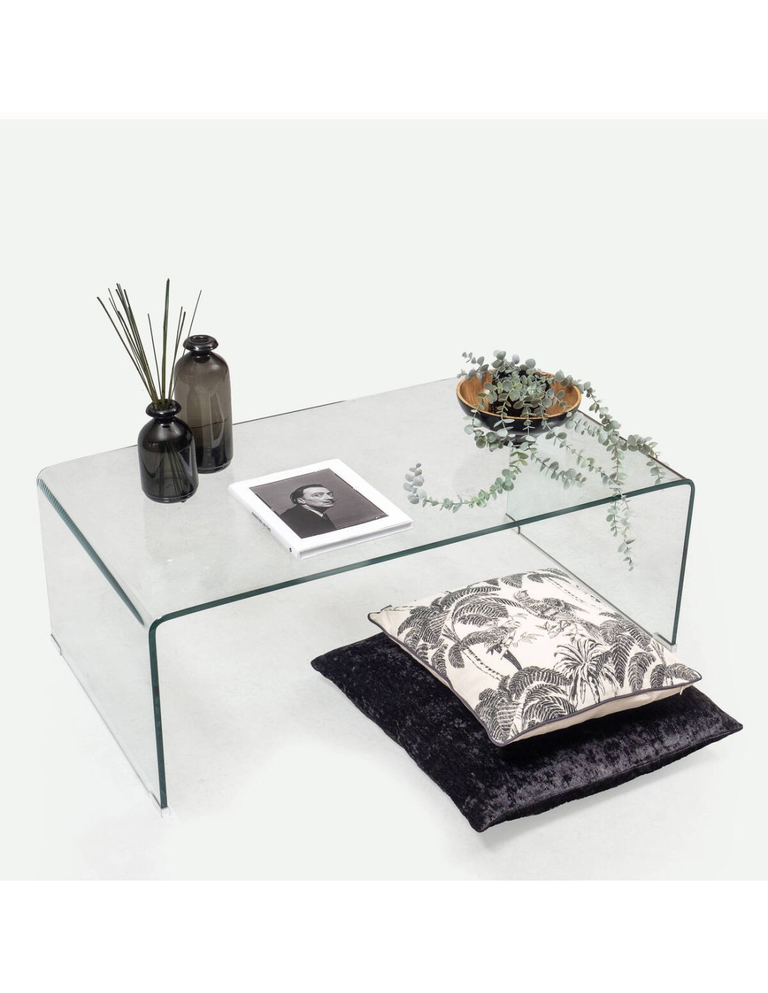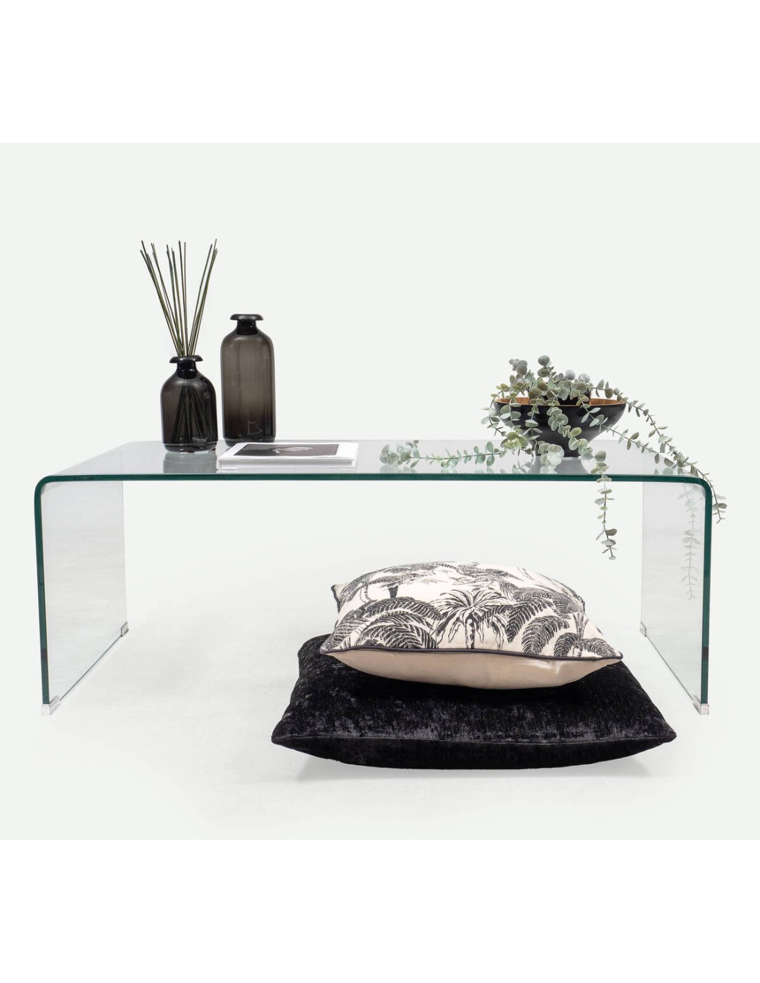 Mesa de centro de cristal curvado transparente de 12 mm con balda revistero de 110x60 cm.La ligereza visual y versatilidad decorativa son sus fuertes, y las formas curvas le dotan de una estética suave y acogedora.Ideal donde precisamos de un elemento que se integre en la decoración.