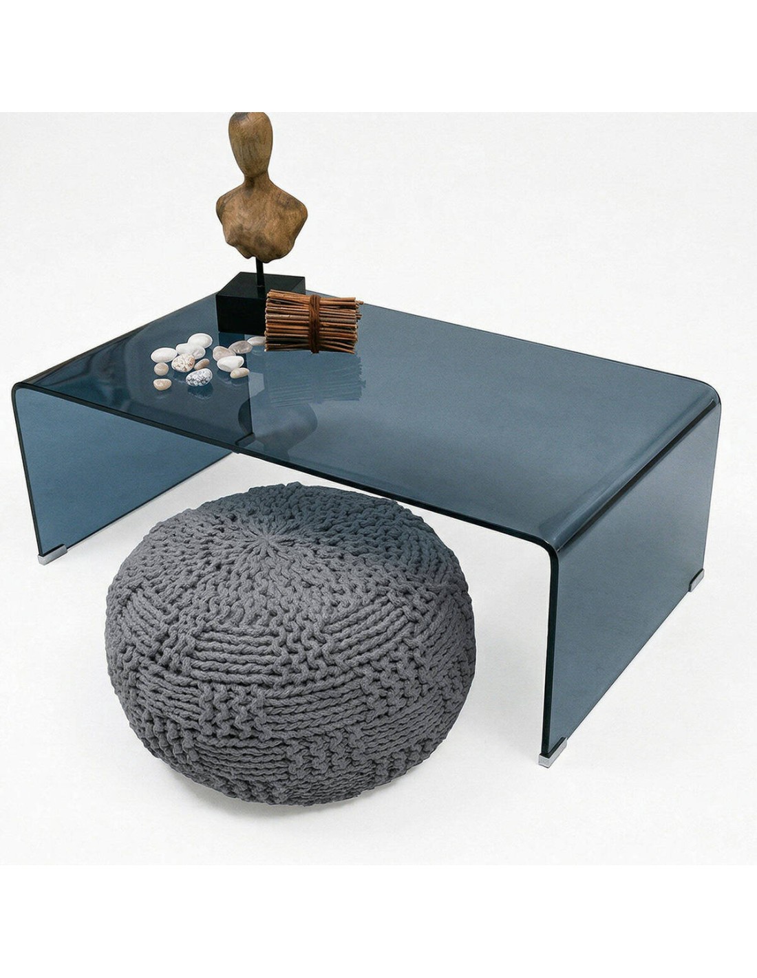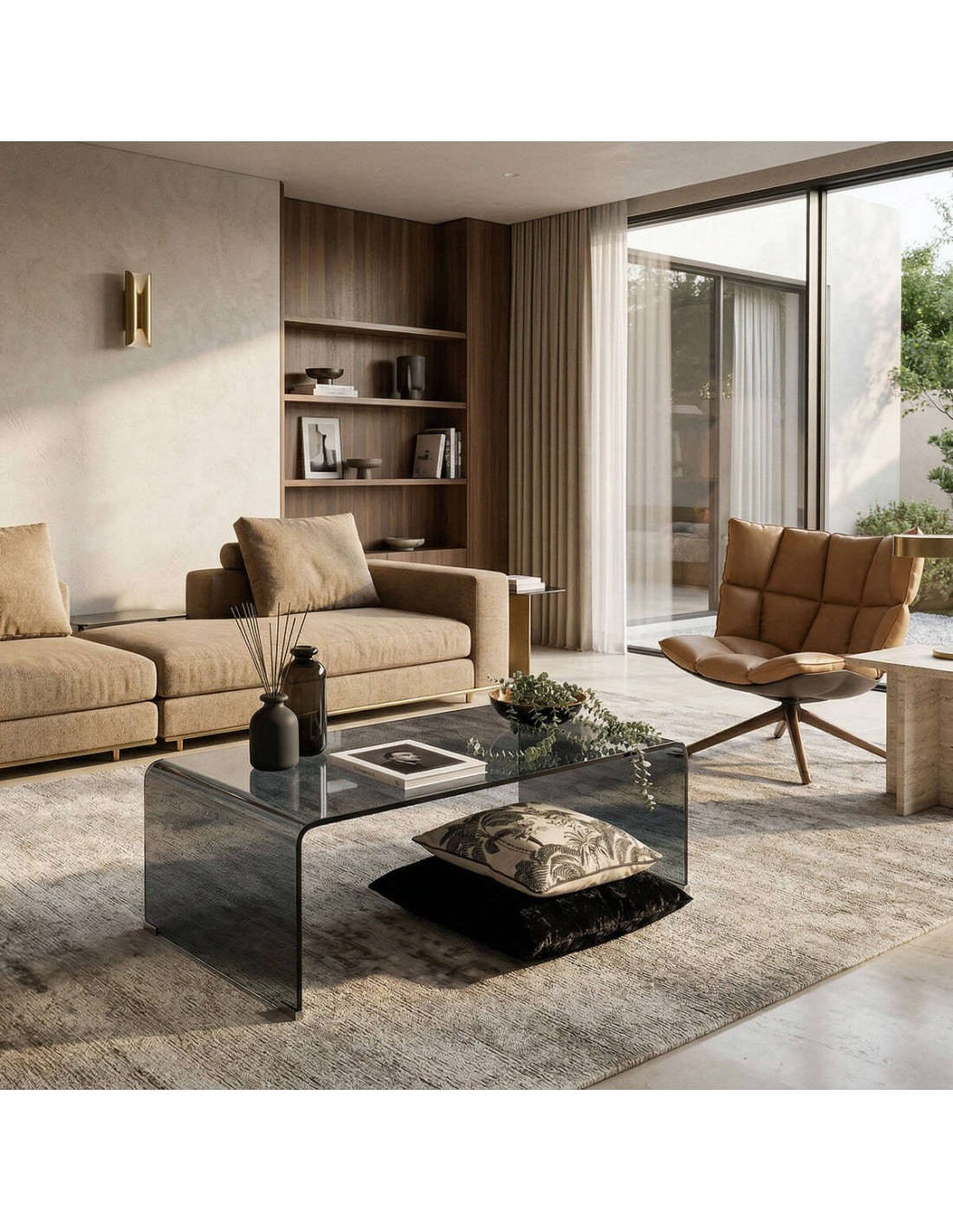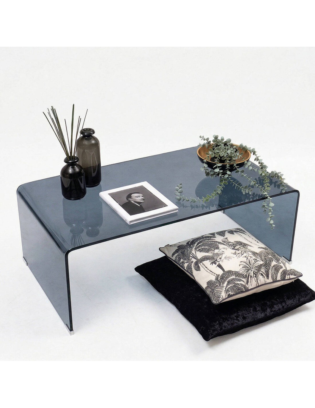 Mesa de centro de cristal curvado templado con diseño moderno y minimalista, ideal para colocar delante del sofá en salones contemporáneos. Su estructura de cristal tintado Gris aporta elegancia al espacio y nos da un aire sofisticado.