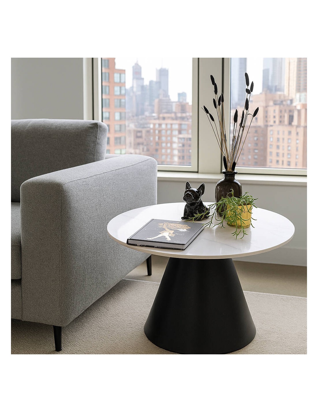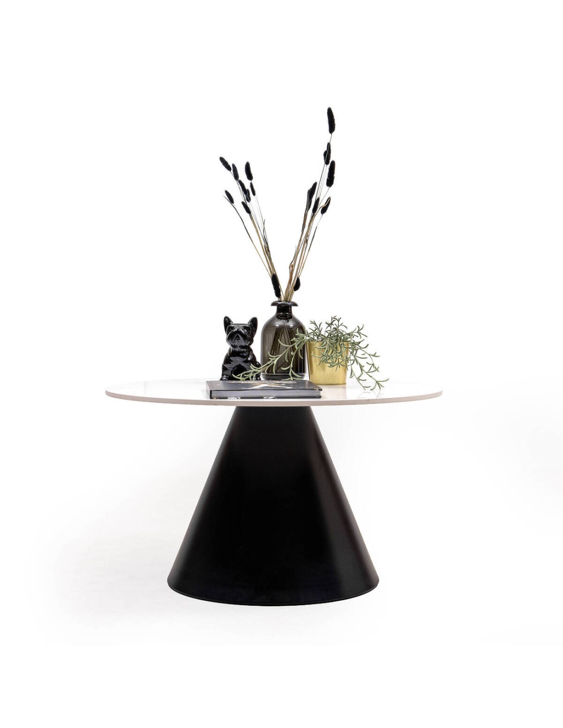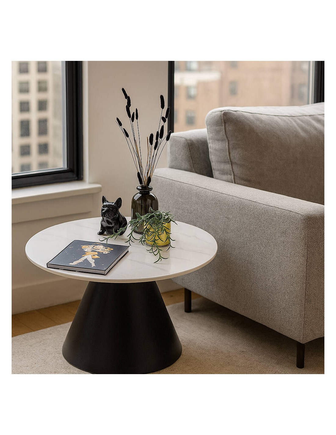 Su tapa porcelánica efecto mármol blanco aporta elegancia, sofisticación y resistencia, mientras que el pie central metálico aporta estabilidad y un estilo moderno de líneas limpias. Perfecta como mesa auxiliar colocada de manera independiente en distintos rincones, o junto a su hermana de 50 cm. Se adaptan a salones minimalistas, modernos o de lujo.