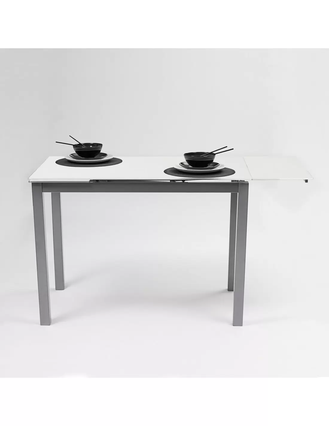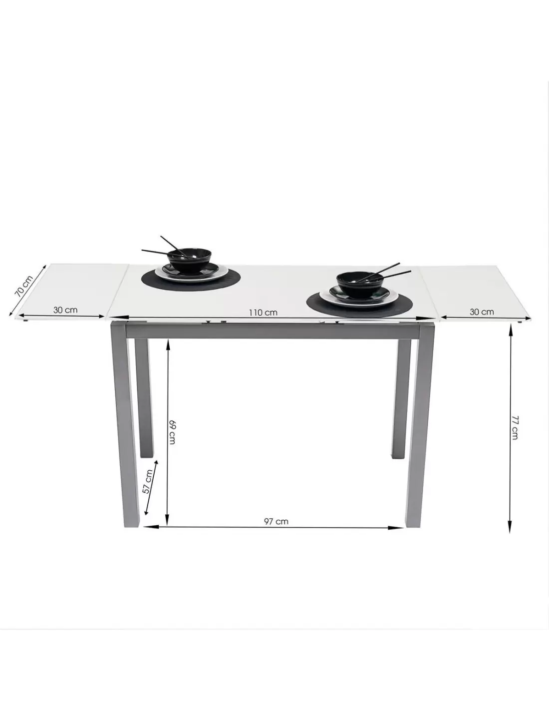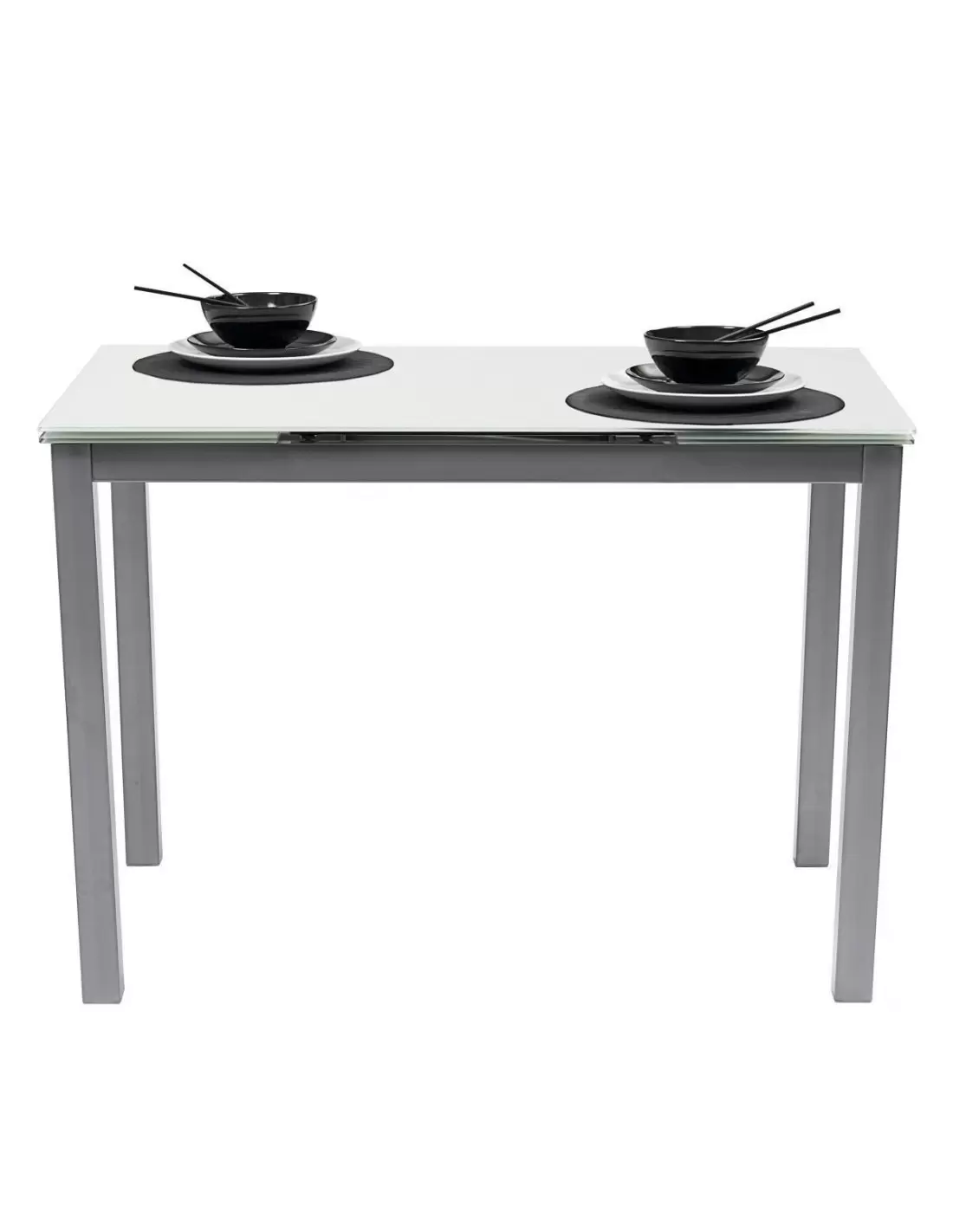 Mesa de cocina extensible PARIS ÓPTICO sobre de cristal blanco PURO y estructura en metal gris 110/170x70cm