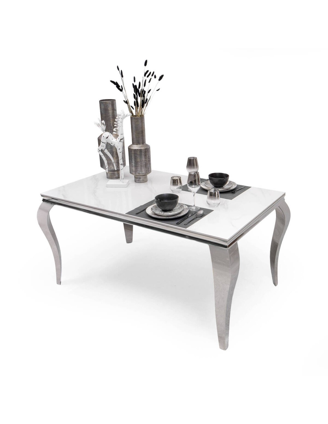 Diseño clásico renovado, materiales actuales y presencia sofisticada. Esta mesa de comedor de inspiración isabelina combina la belleza de las formas curvas tradicionales con la resistencia y elegancia del acero y la piedra sinterizada acabado mármol blanco.