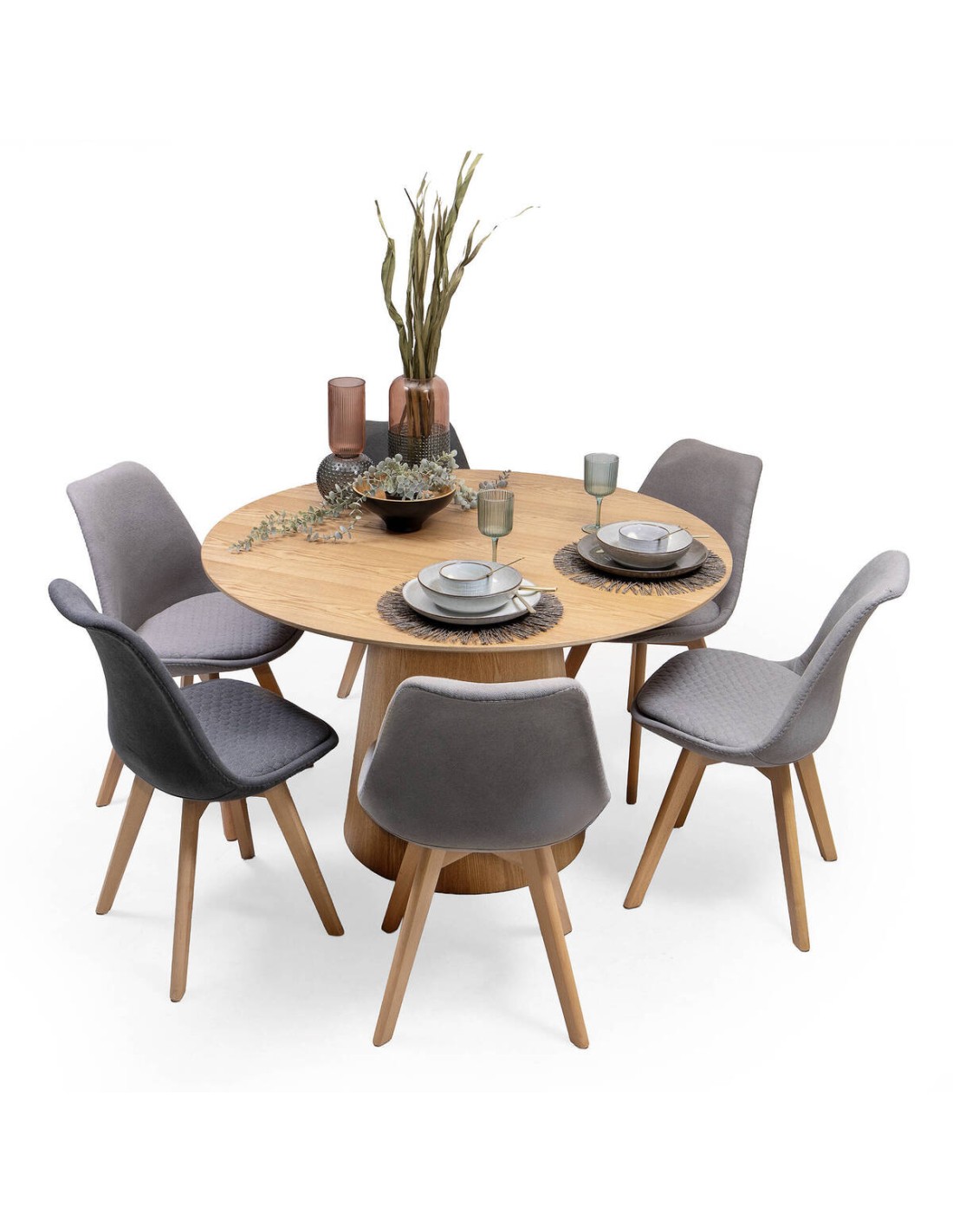 El acabado en chapa natural de fresno aporta textura, calidez y luminosidad, creando un ambiente acogedor y armónico. Gracias a su forma redonda, esta mesa fomenta la cercanía y la conversación, convirtiendo cada comida en un momento especial.