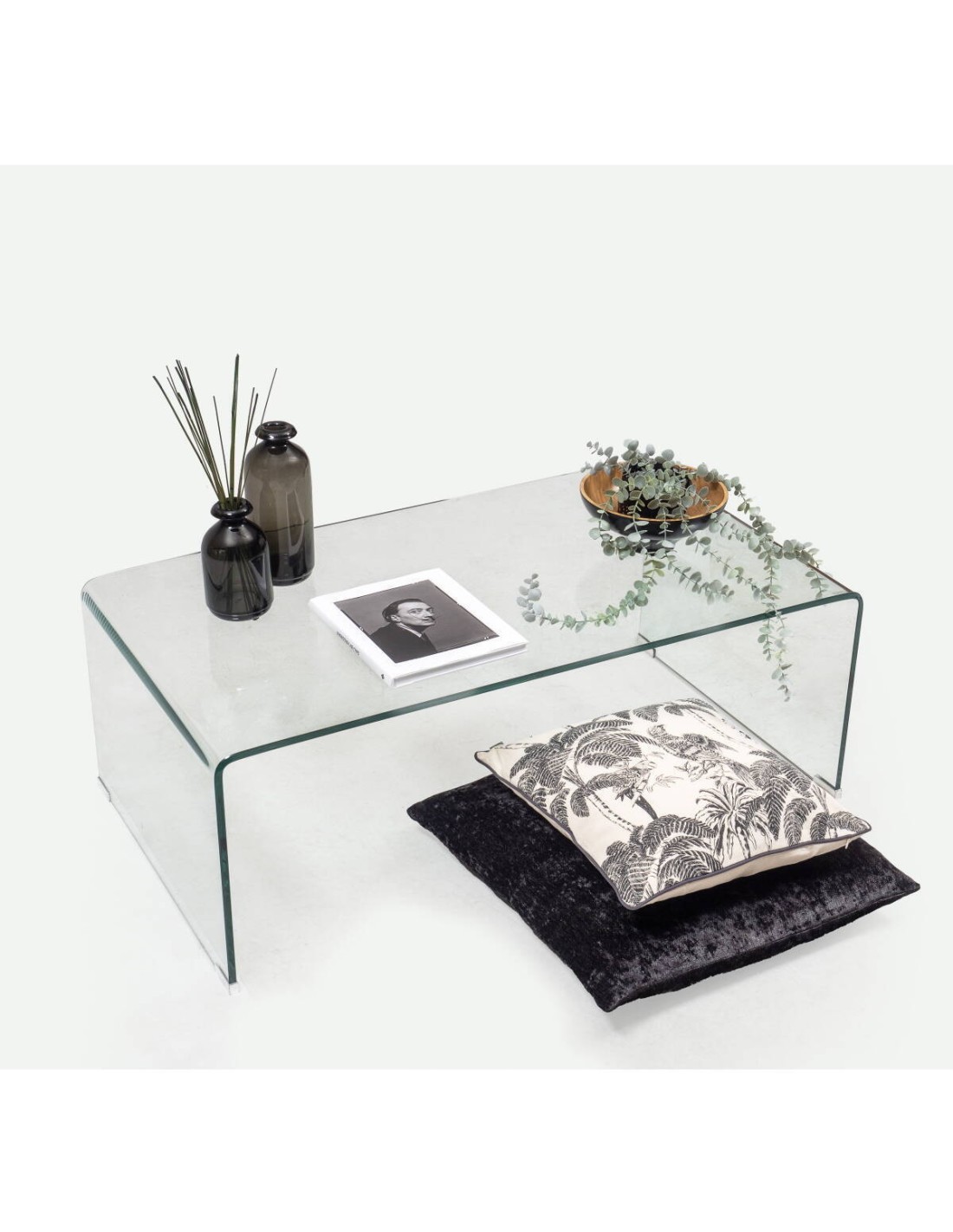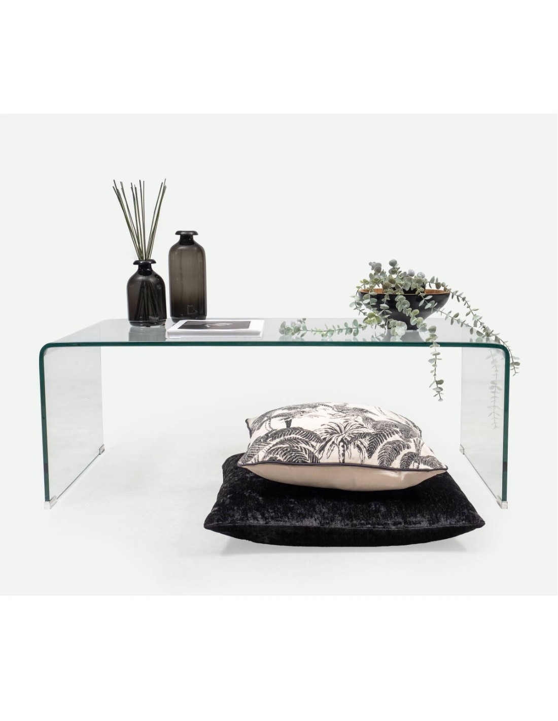 Mesa de centro de cristal curvado transparente de 12 mm con balda revistero de 110x60 cm.La ligereza visual y versatilidad decorativa son sus fuertes, y las formas curvas le dotan de una estética suave y acogedora.Ideal donde precisamos de un elemento que se integre en la decoración.