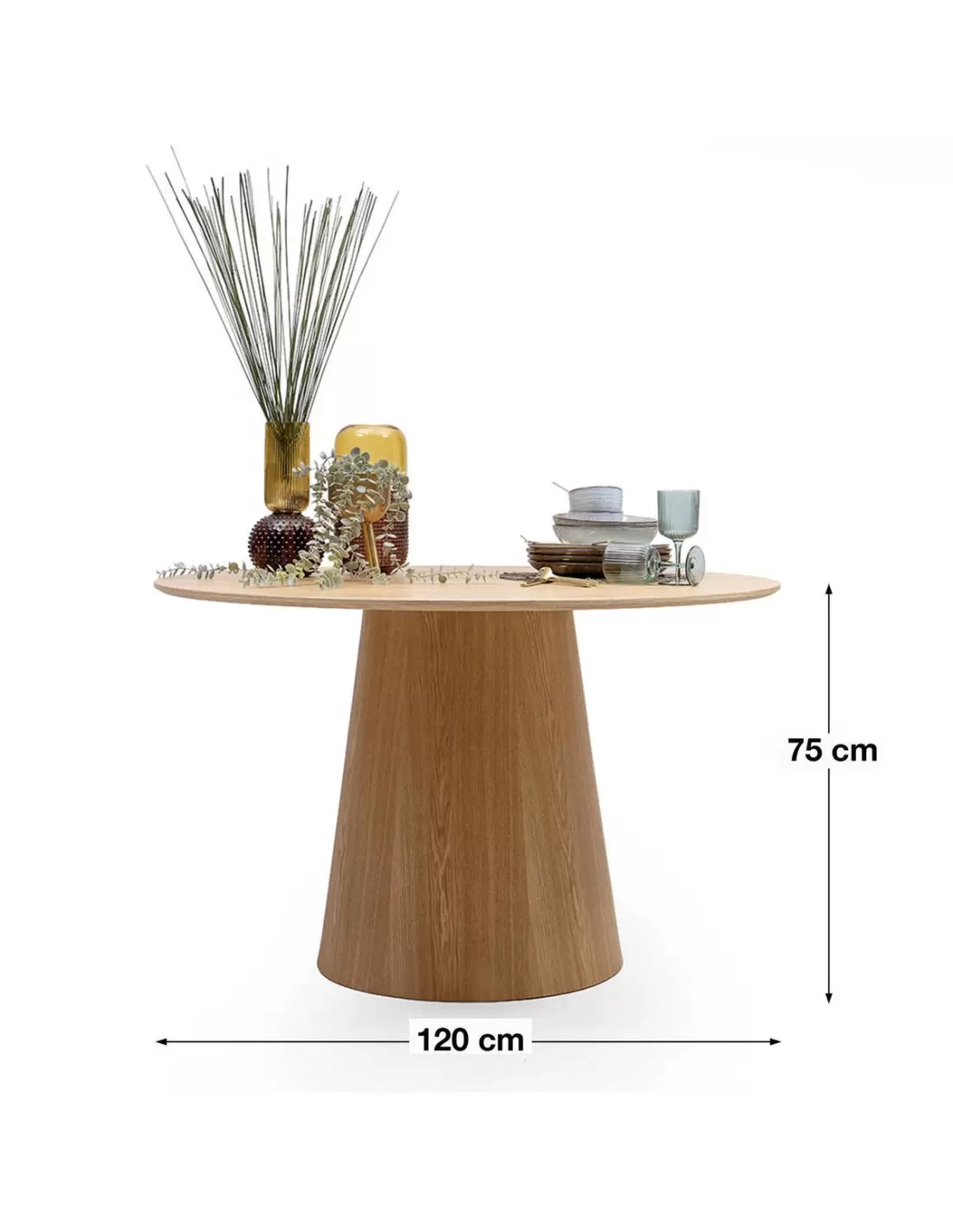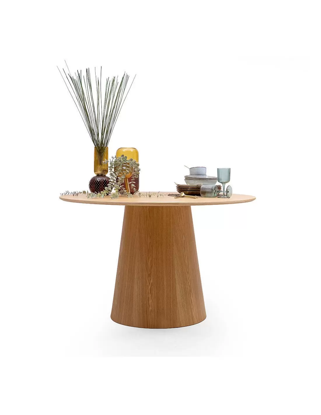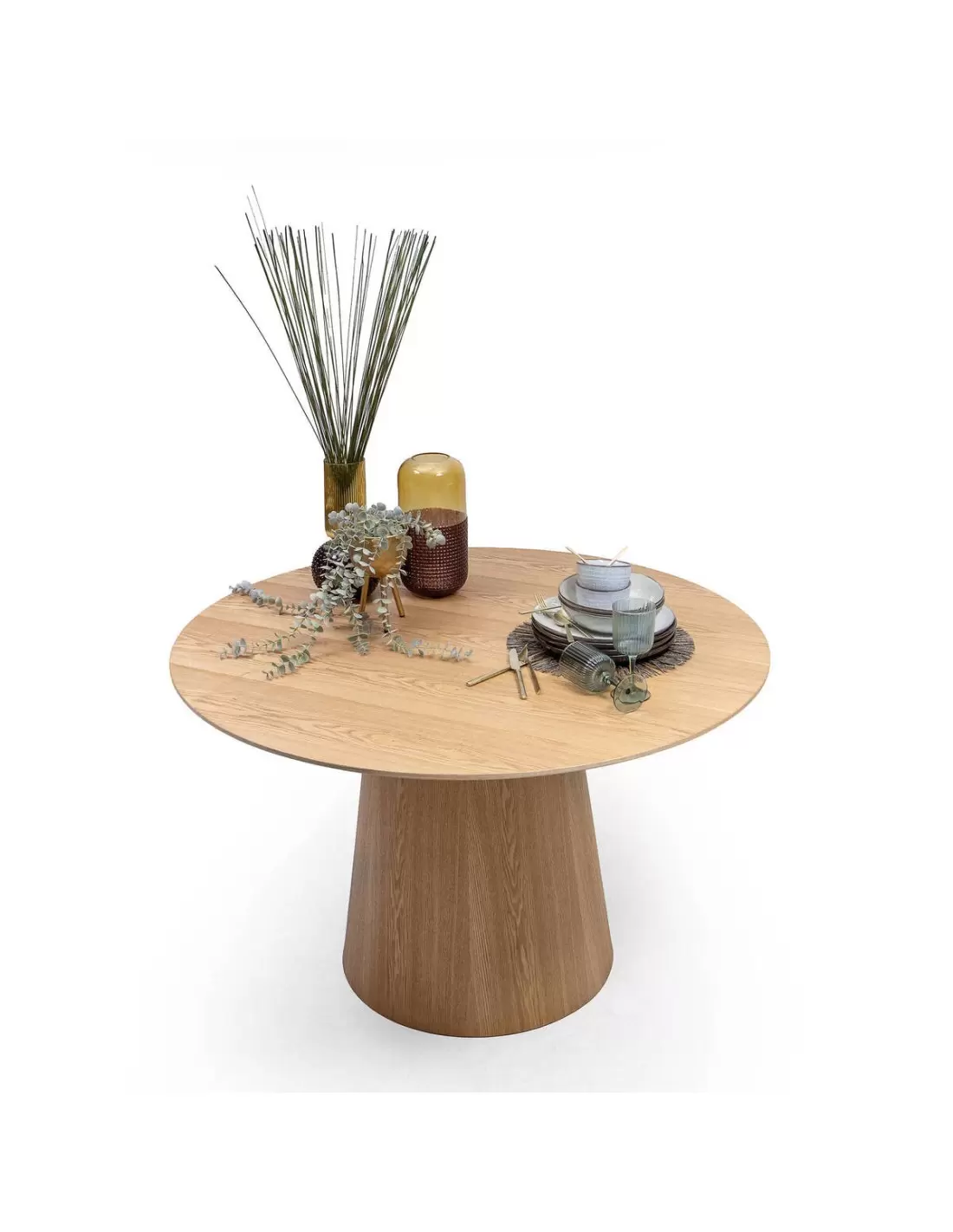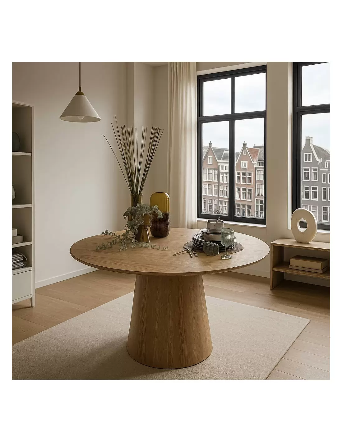Mesa de comedor FREJA redonda de 120 cm. Chapa de fresno estilo nórdico y pie cental