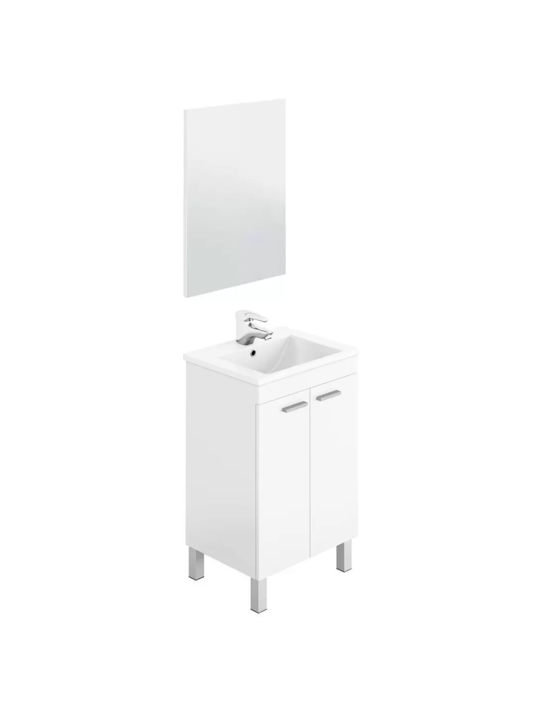 Conjunto de mueble de baño de diseño moderno en color blanco brillo, con 2 puertas y 4 patas y espejo del mismo acabado.