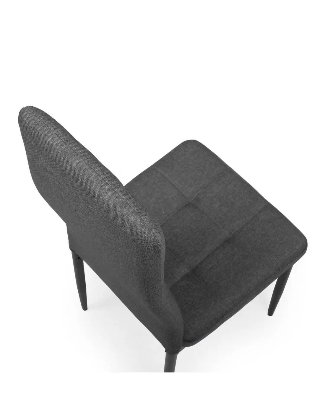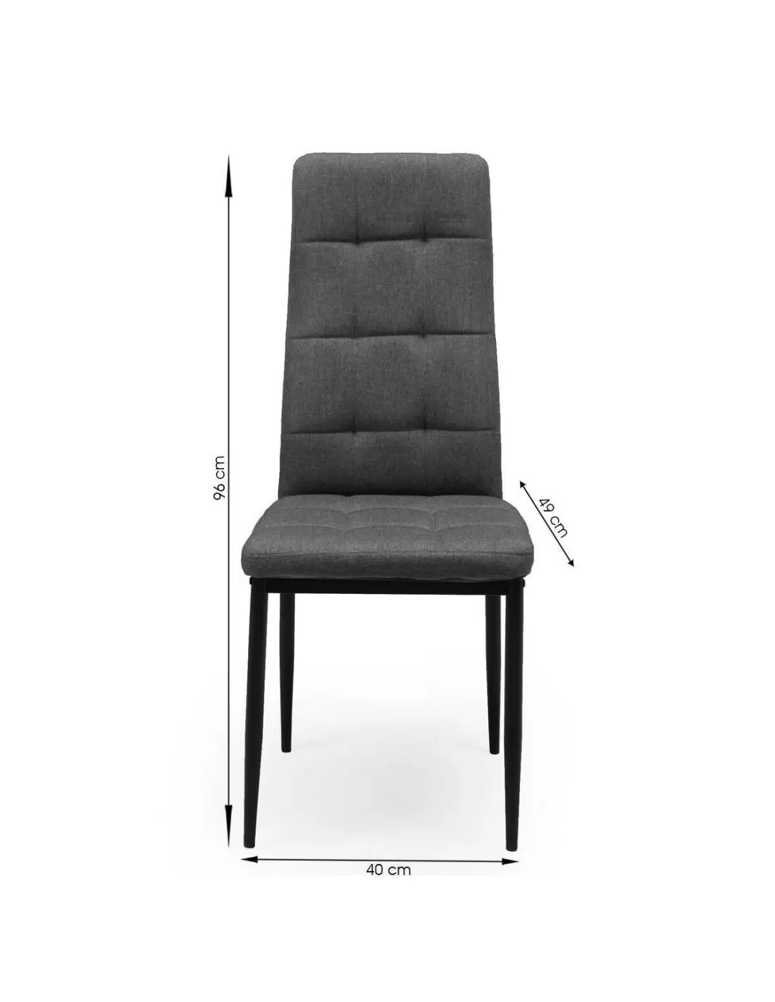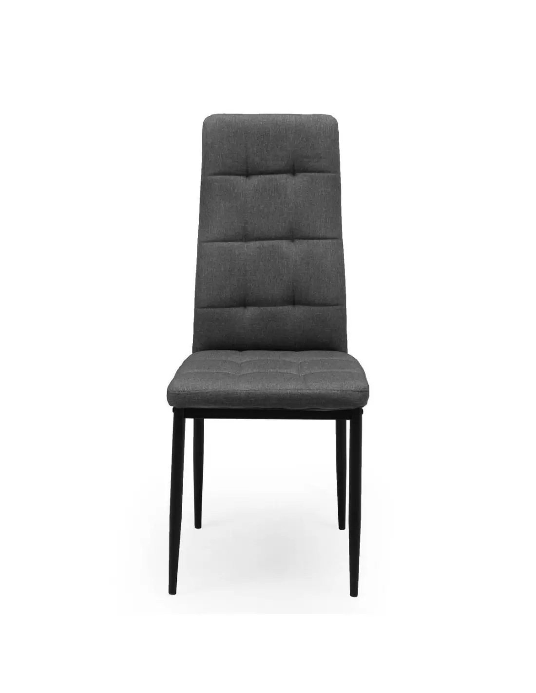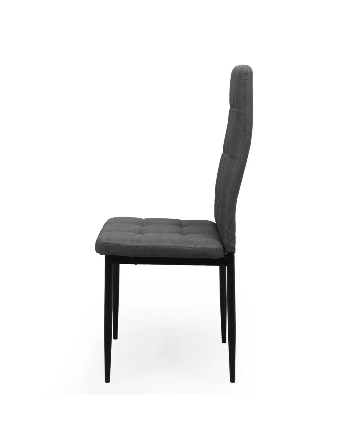 El juego de 6 sillas ZUNI tienen un respaldo y un asiento acolchados con espuma de calidad, para que disfrutes de unas sillas cómodas y bonitas. Están tapizadas en una tela en color gris oscuro con diseño capitoné. Su estructura ligera y moderna es metálica acabada en color negro.