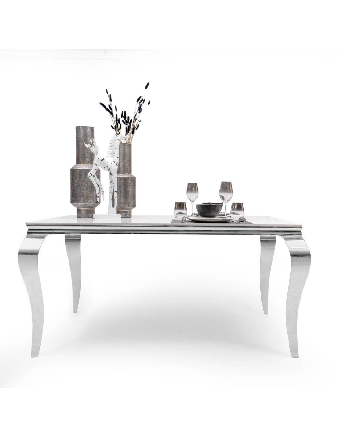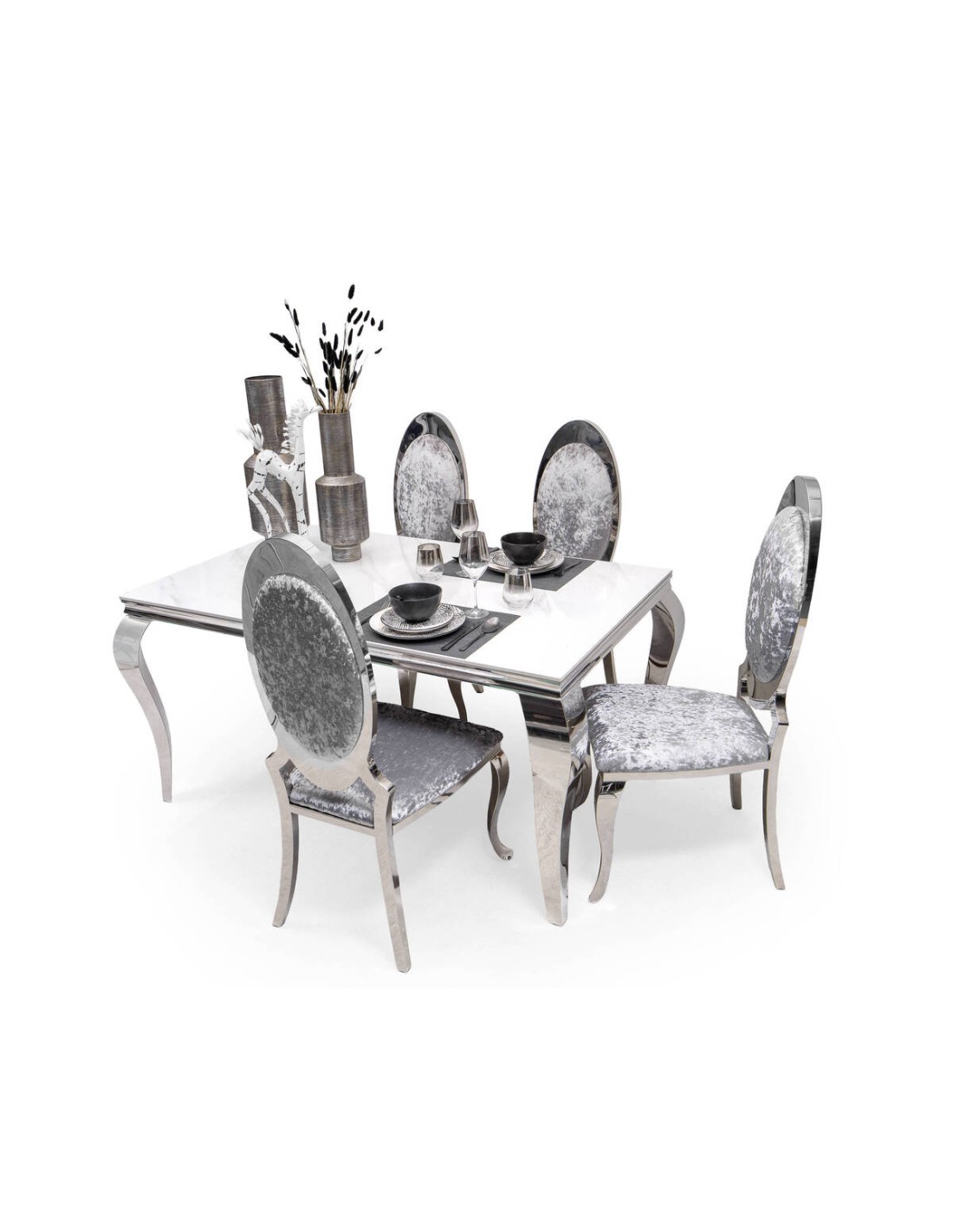 Pack de Mesa comedor + 4 sillas. Mesa fija 150*90 cm con tapa piedra acabado marmol.Patas metálicas acabado cromo. RAMSES ESTAN