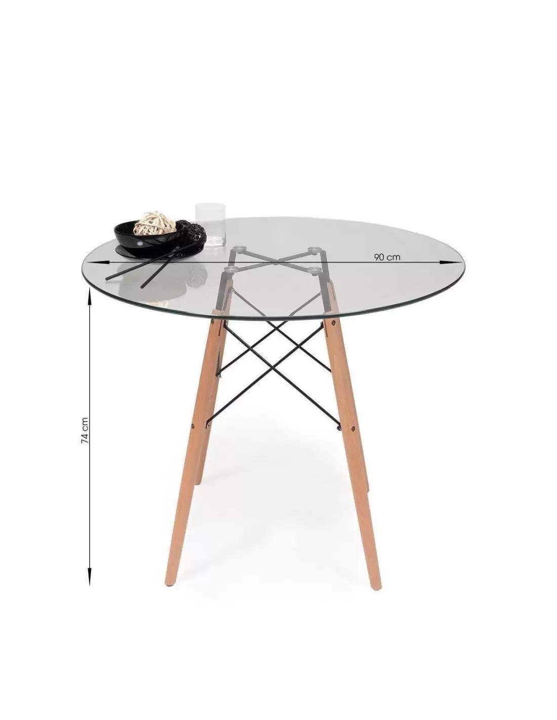 Conjunto de comedor CALAS TOWER CRISTAL 90, mesa de cristal redonda de 90 cm, 4 sillas de diseño nórdico