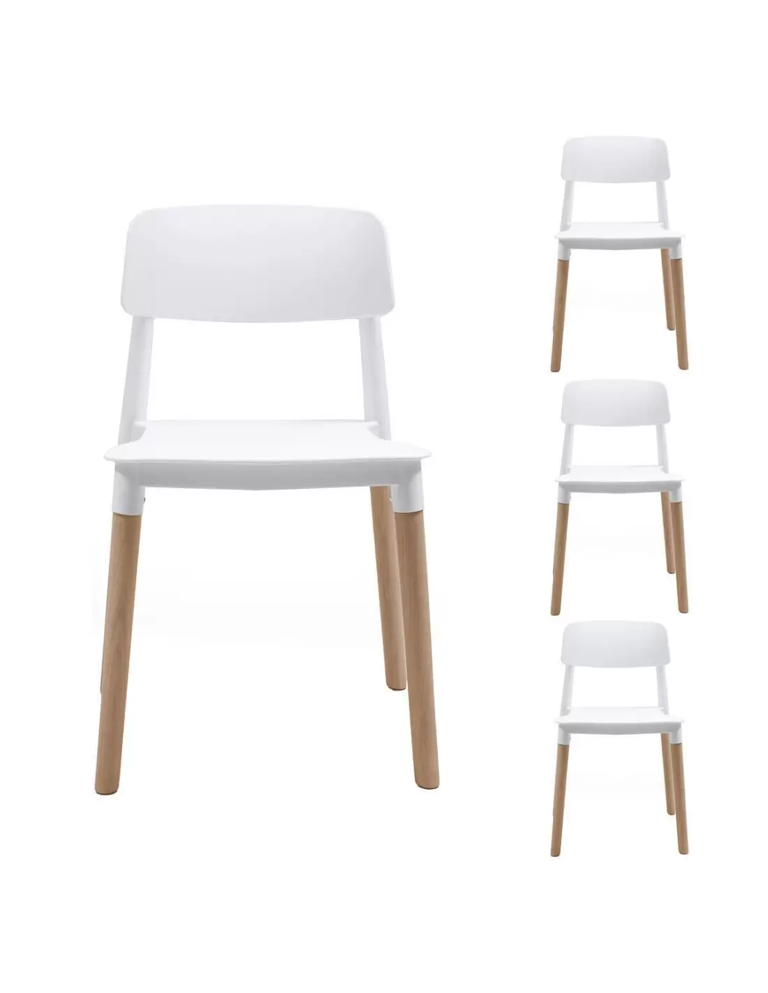 Las 4 sillas CALAS están creadas con un gusto muy especial, con un diseño fresco y práctico con aires nórdicos. Tienen un original asiento de polipropileno de una pieza en color blanco y cuatro patas de madera de haya.