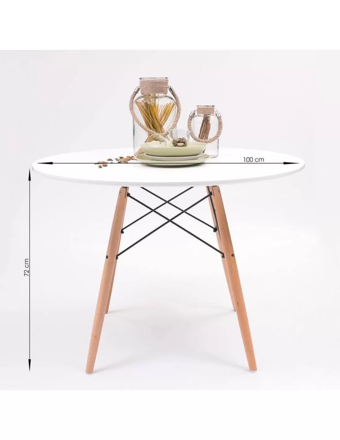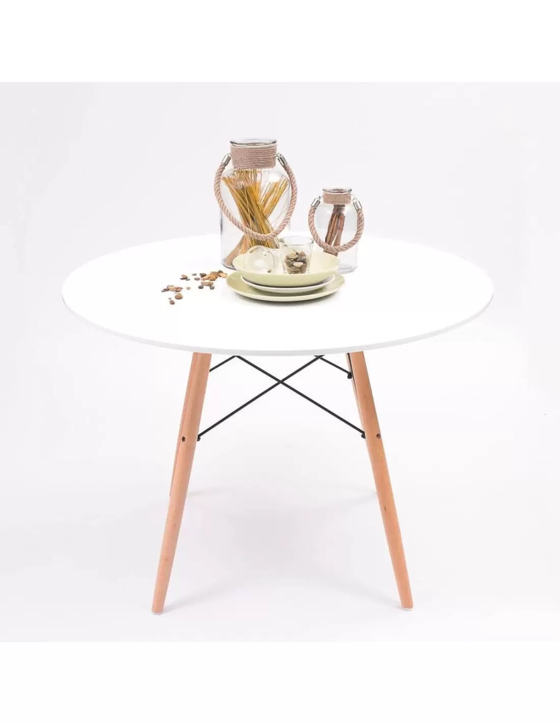 La mesa TOWER WHITE 100 tiene un sobre redondo de MDF lacado en color blanco de 100 cm de diámetro y unas patas de madera de haya, reforzadas con baritas metálicas entrelazadas en color negro.