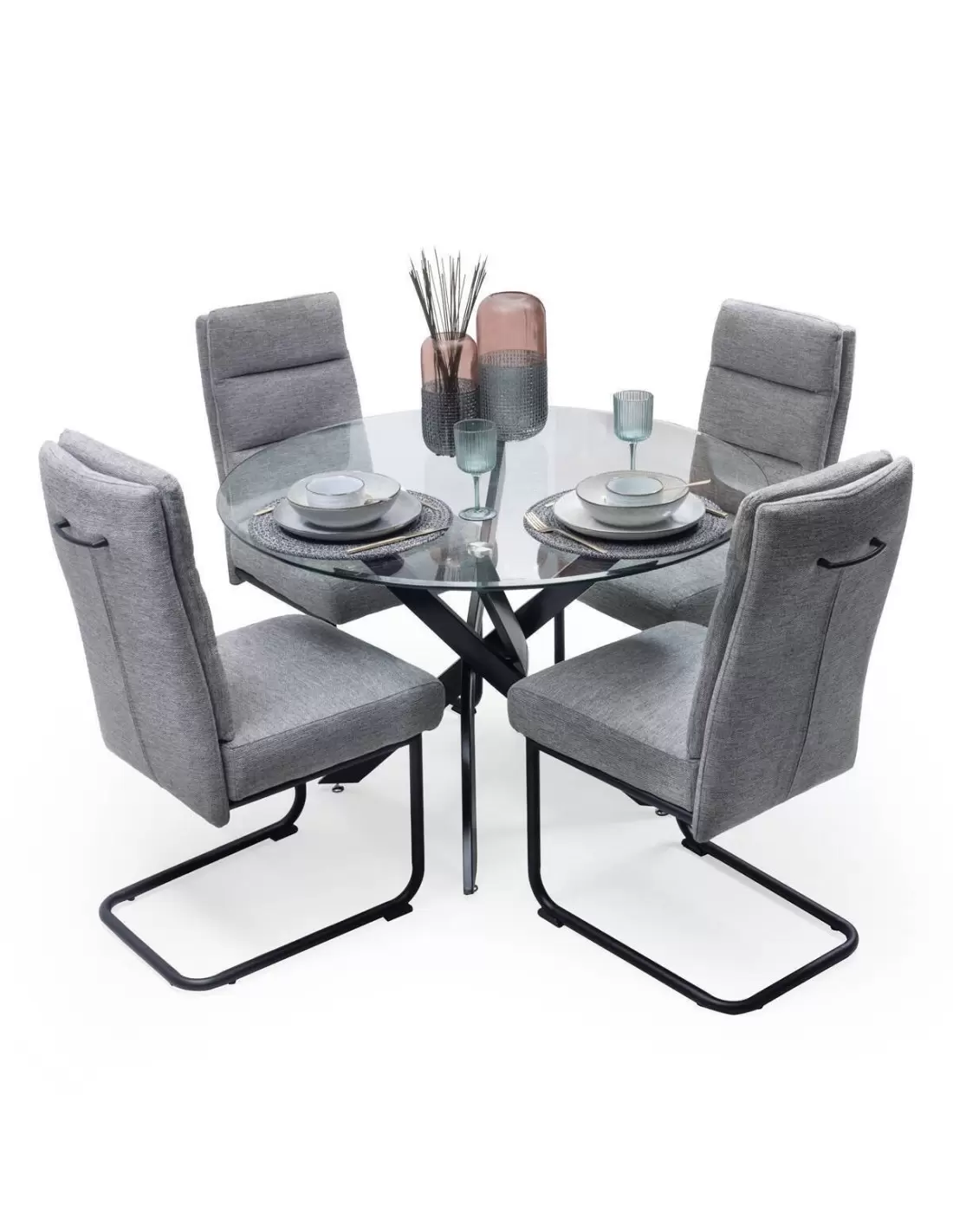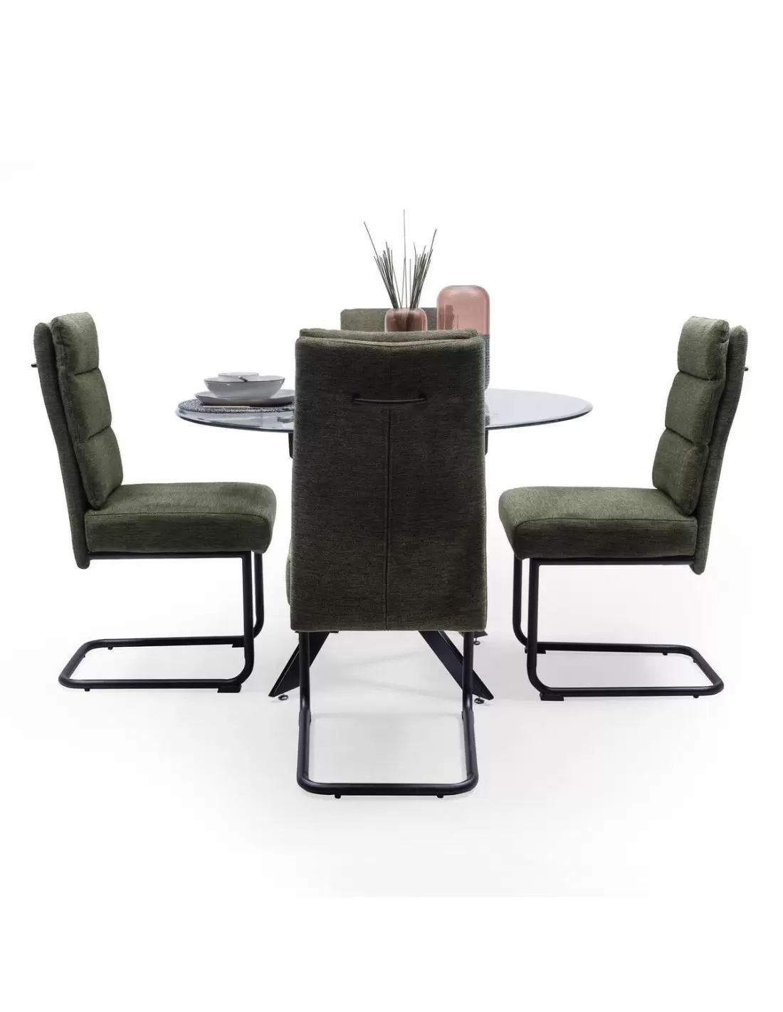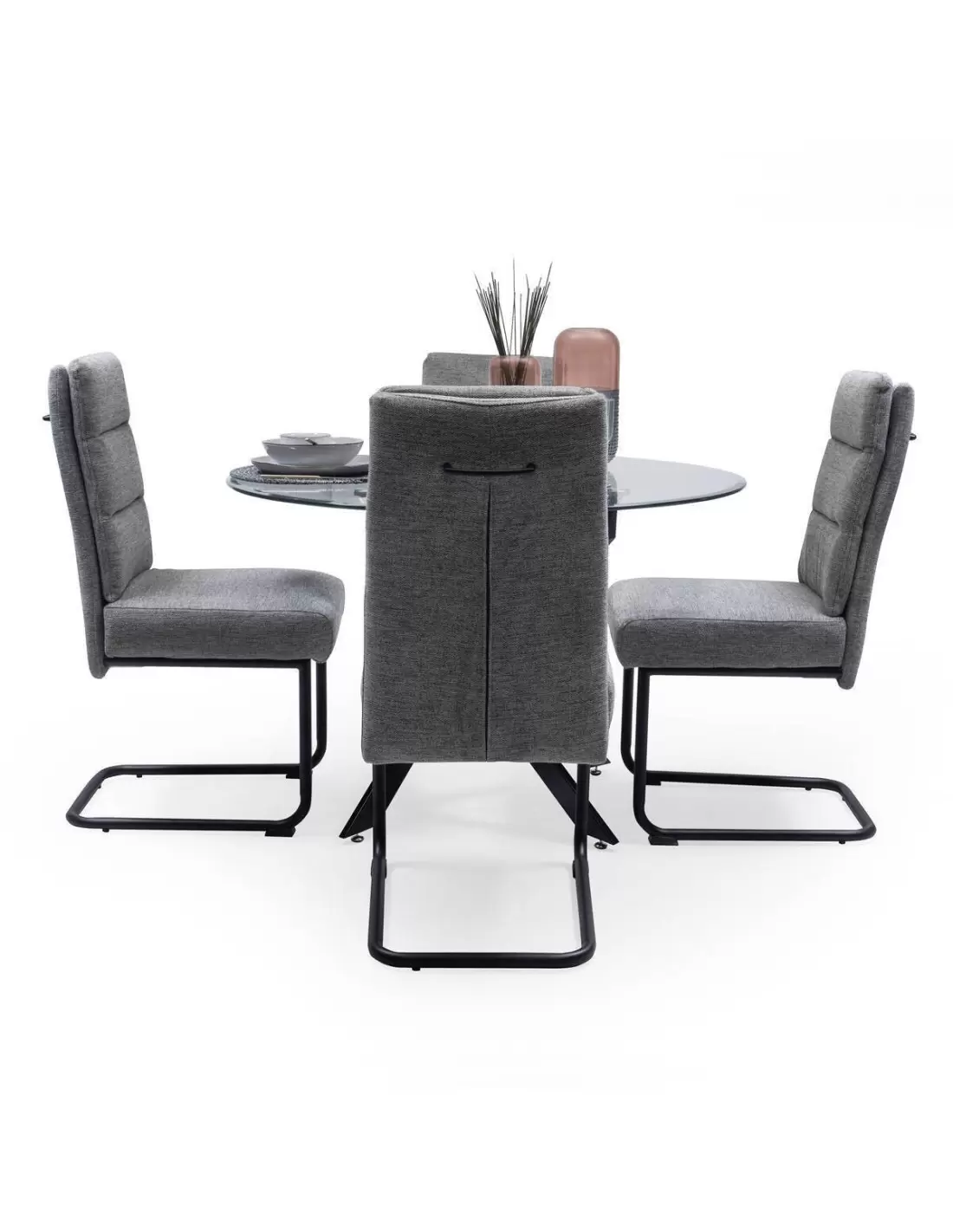 Está formado por 4 sillas tapizadas en una bonita tela jaspeada disponible en dos colores, gris y verde, con un asiento acolchado extra con bloque de muelles y respaldo con topper también acolchado y pata omega en color negro mate, y una mesa de comedor de cristal redondo de 110 cm de diámetro y 10 mm de grosor, con una base metálica en acabado color negro que juega con las formas curvas, dotándola de una estética suave y acogedora.