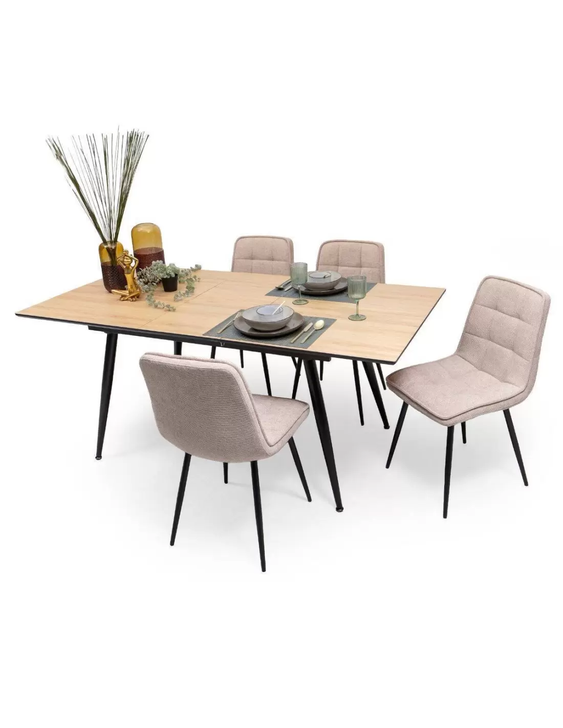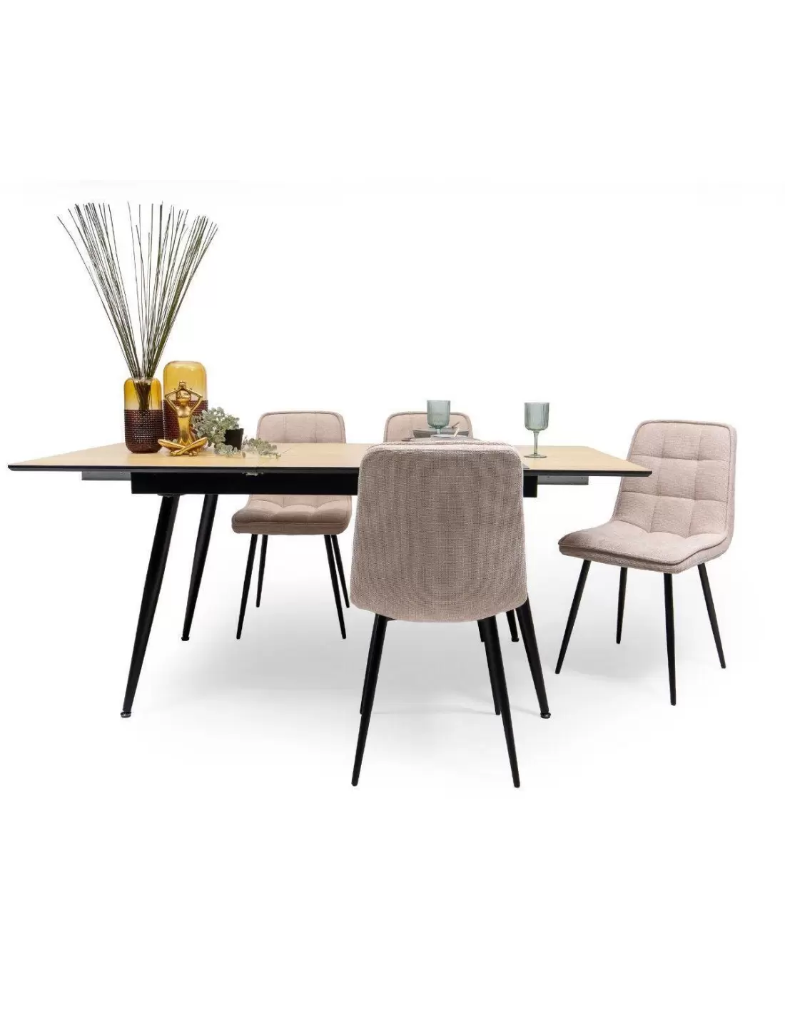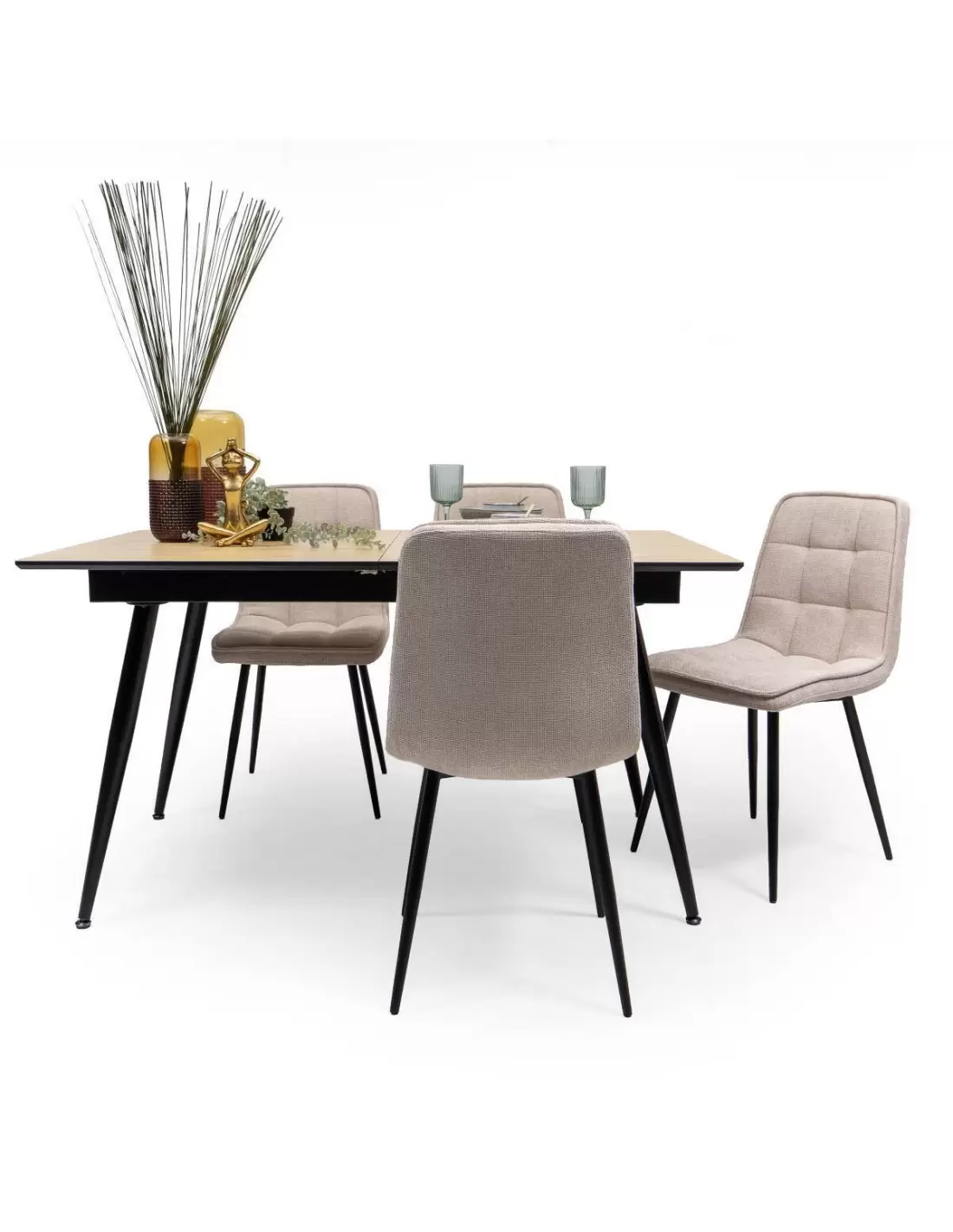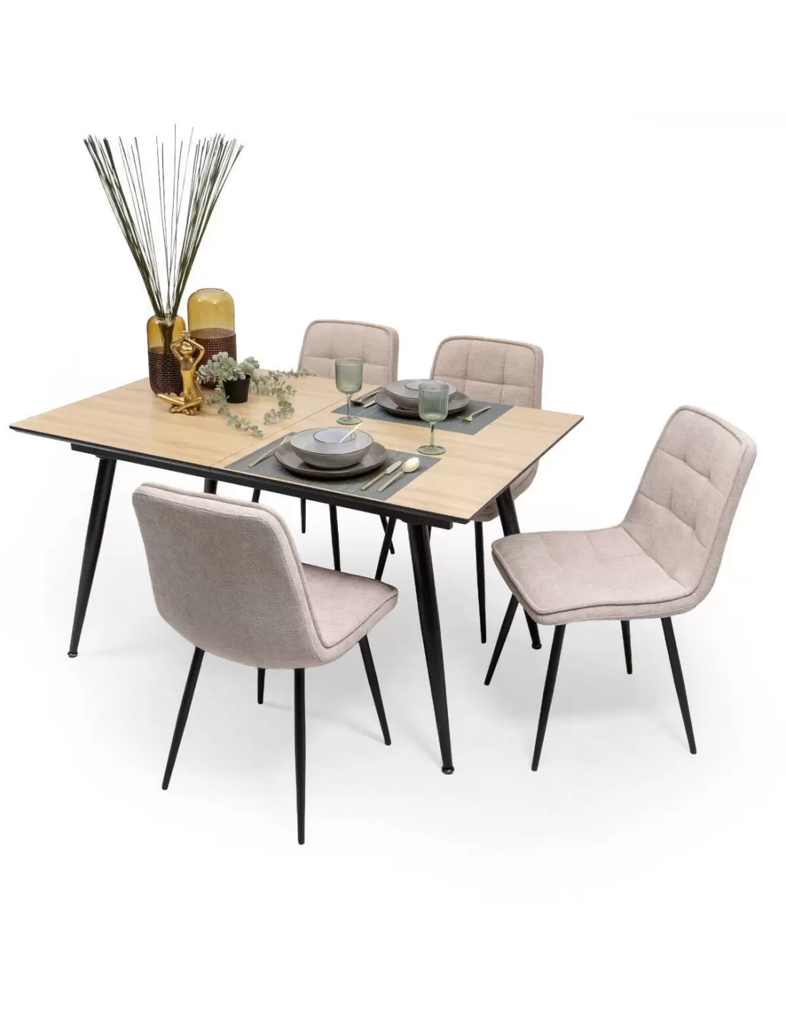 Conjunto de Comedor Extensible NELA/SALA – Mesa de 140 a 180 cm + 4 Sillas Tapizadas con Patas Metálicas Negras