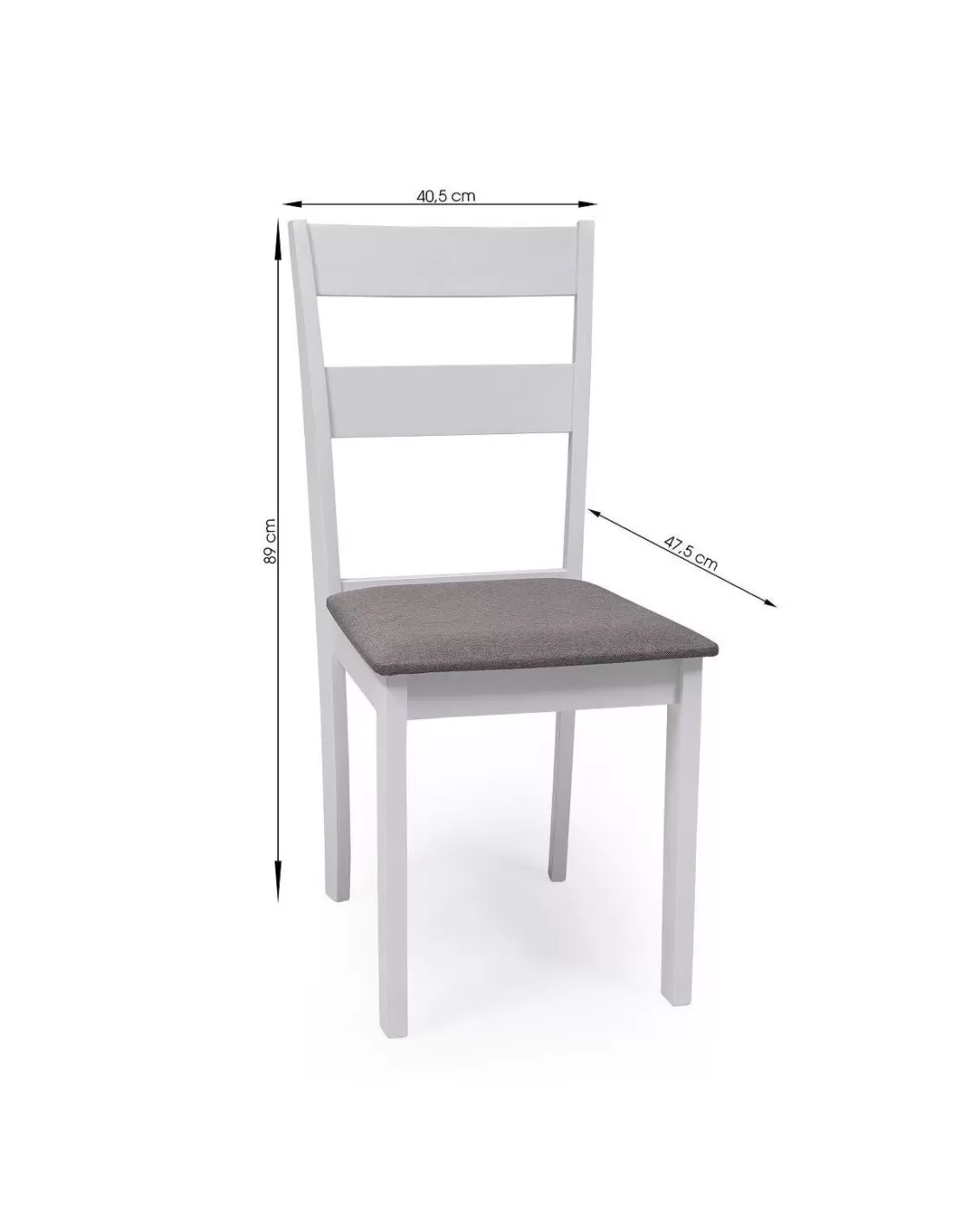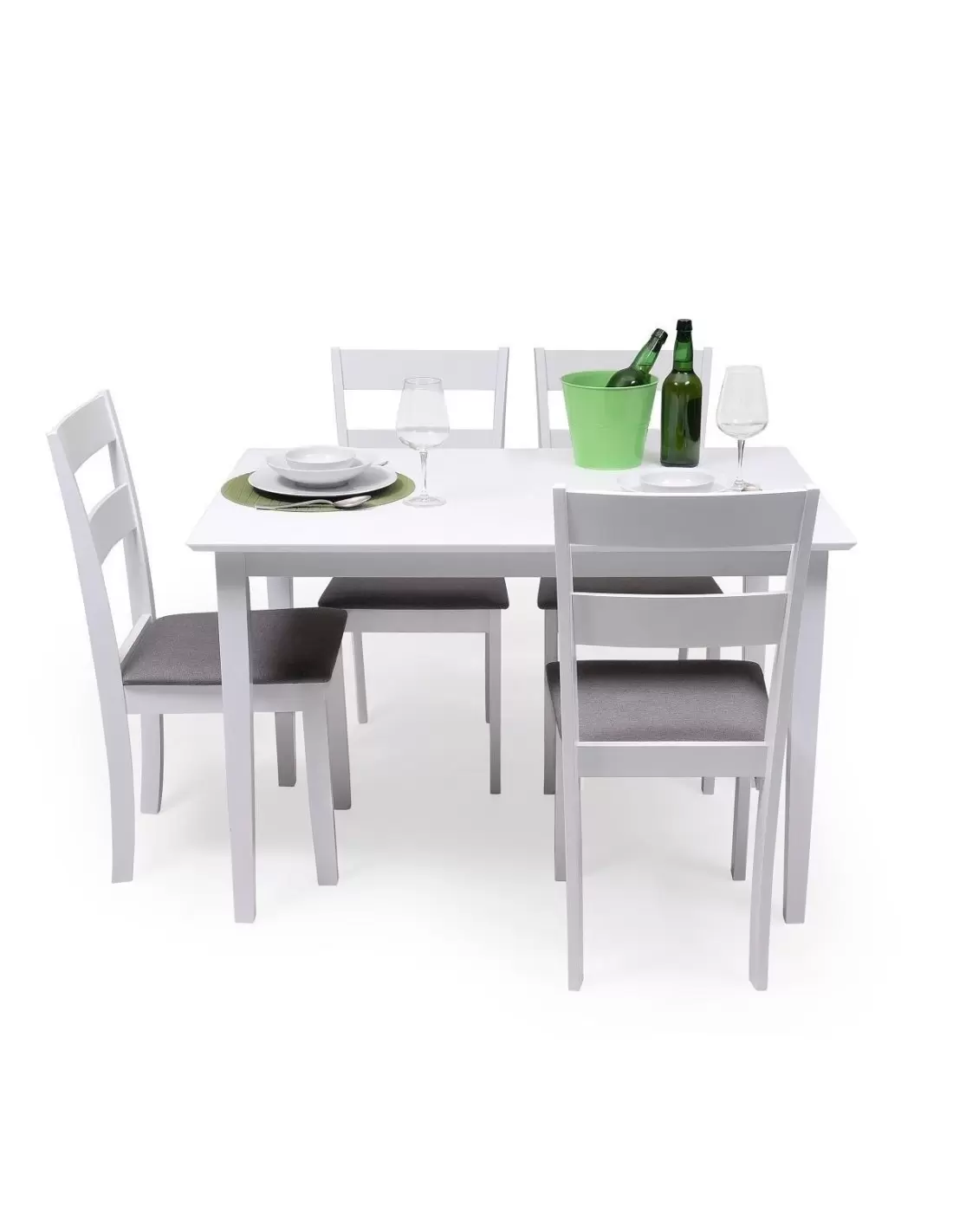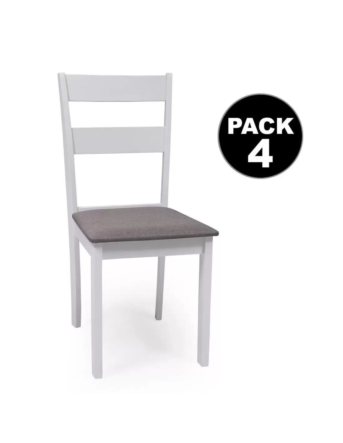 Se completa con un juego de 4 sillas de madera lacadas en blanco, con asiento acolchado y tapizado en tela gris, ideales para crear un ambiente cálido y cómodo, y con un estilo clásico que aportará buen gusto a tu hogar.