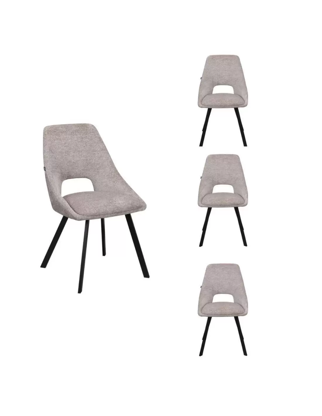 Disponible en tela beige tostado con patas metálicas negra, en tela gris claro con patas metálicas blancas y en tela gris oscuro con patas metálicas negras, lo que la convierte en una opción versátil para comedores, salones, oficinas o espacios de hostelería.