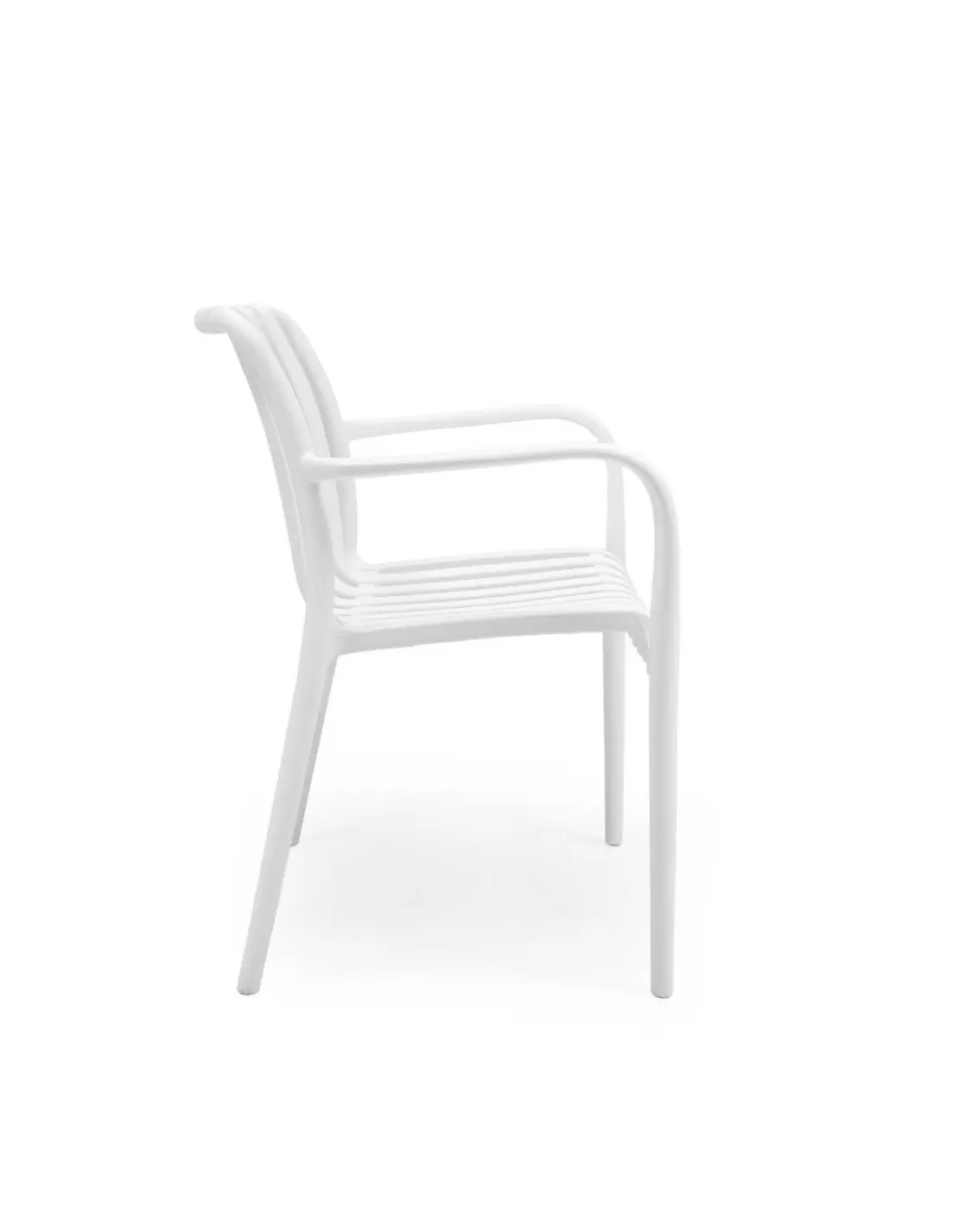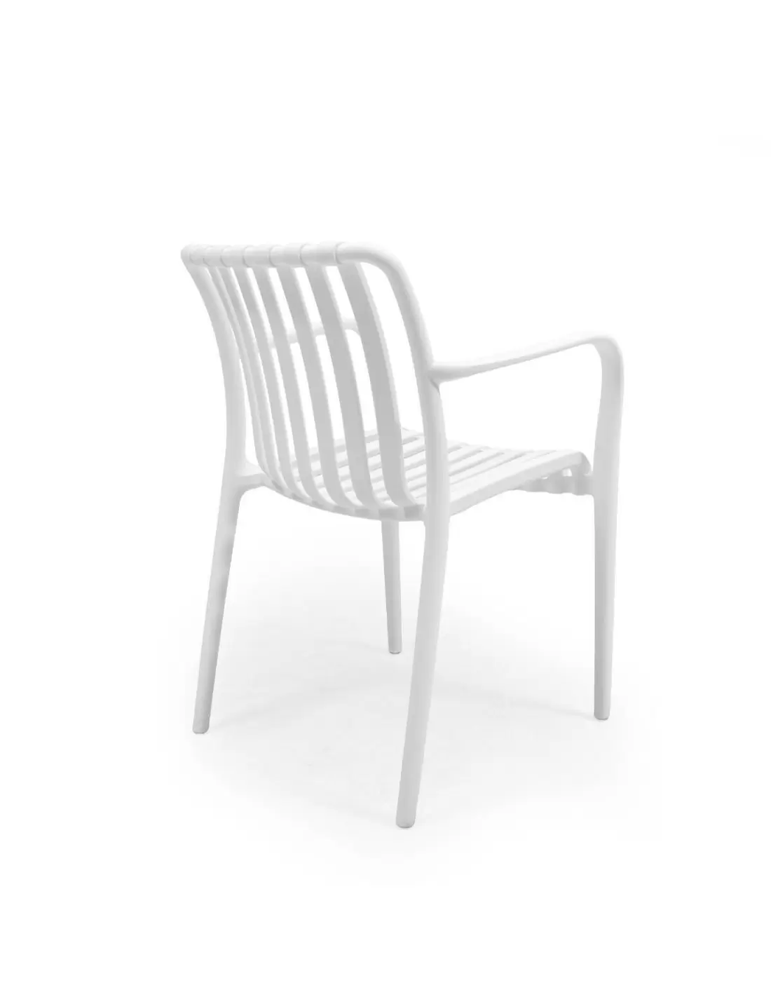Silla de jardín EMI moderna fabricada en polipropileno de alta resistencia, perfecta para su uso en exteriores e interiores. Su diseño envolvente y cómodo la hace ideal para terrazas, jardines, comedores o espacios de descanso.