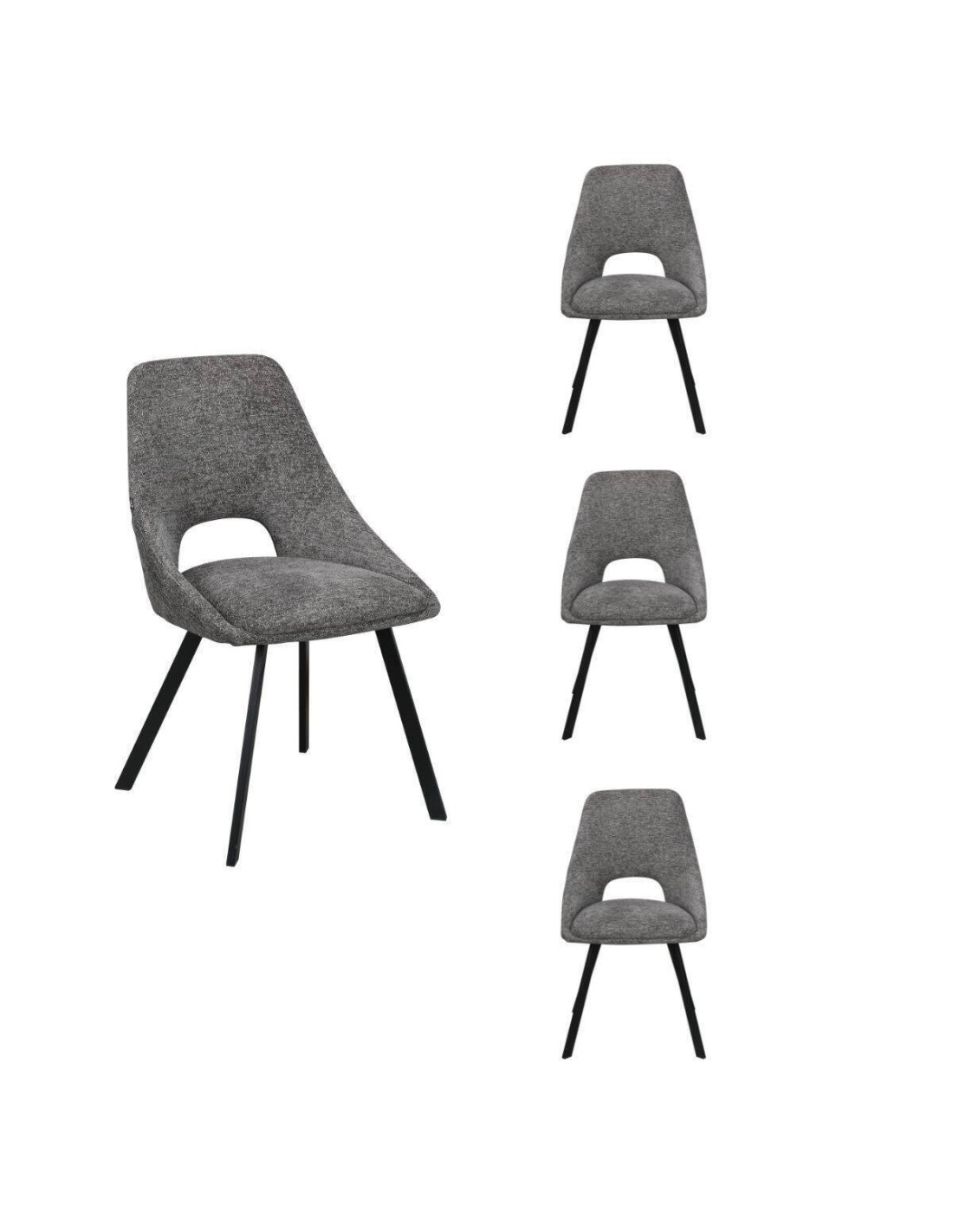 Disponible en tela beige tostado con patas metálicas negra, en tela gris claro con patas metálicas blancas y en tela gris oscuro con patas metálicas negras, lo que la convierte en una opción versátil para comedores, salones, oficinas o espacios de hostelería.