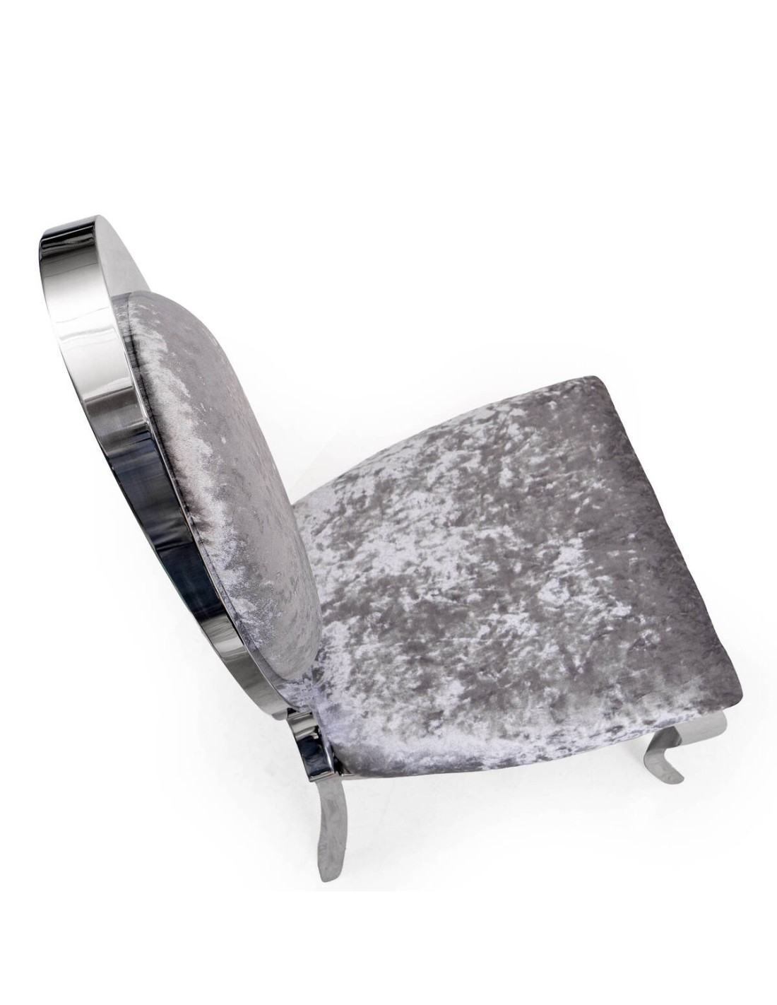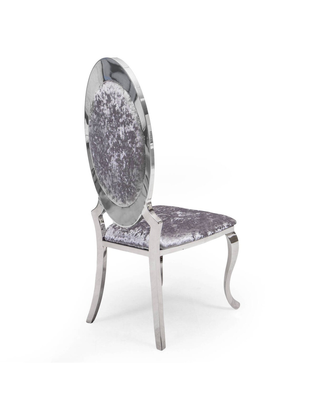 La estructura está fabricada en acero inoxidable cromado, un material resistente y duradero que aporta un acabado brillante de gran impacto visual. El asiento y el respaldo están tapizados en terciopelo gris, un tejido suave al tacto que refuerza su estética elegante y su confort diario.