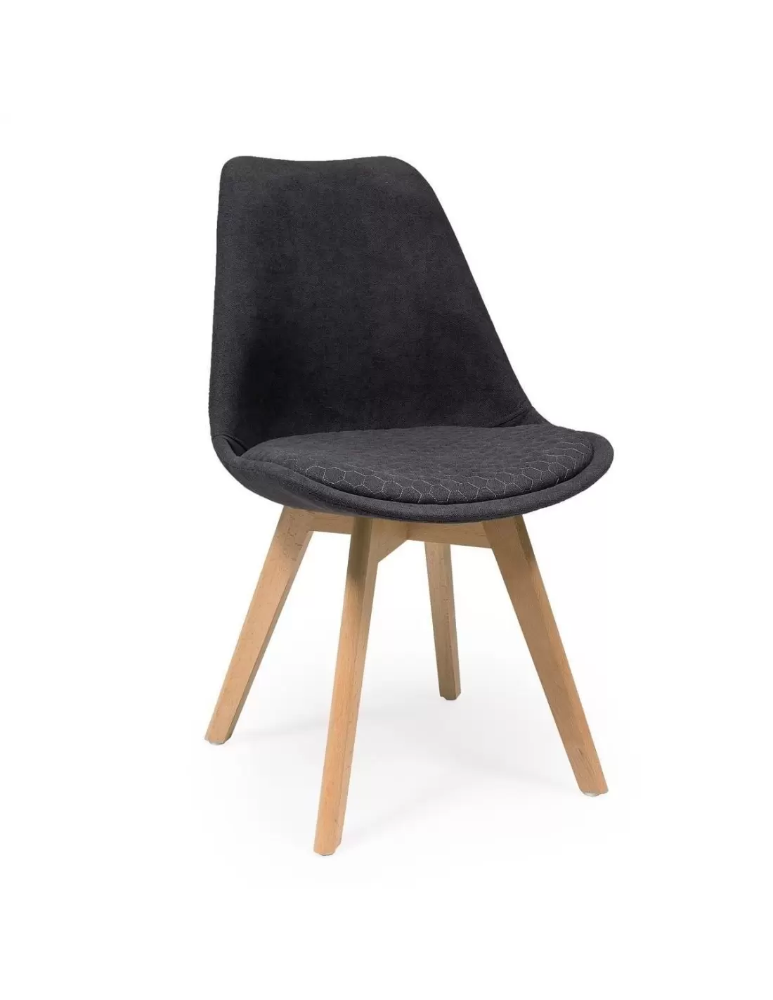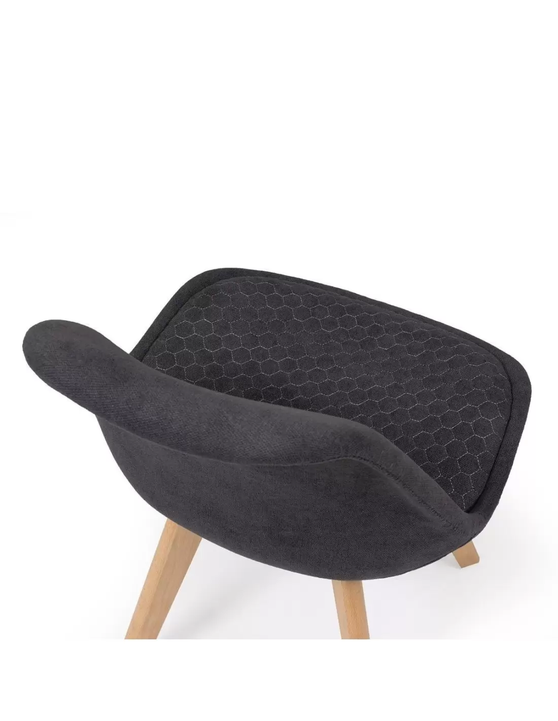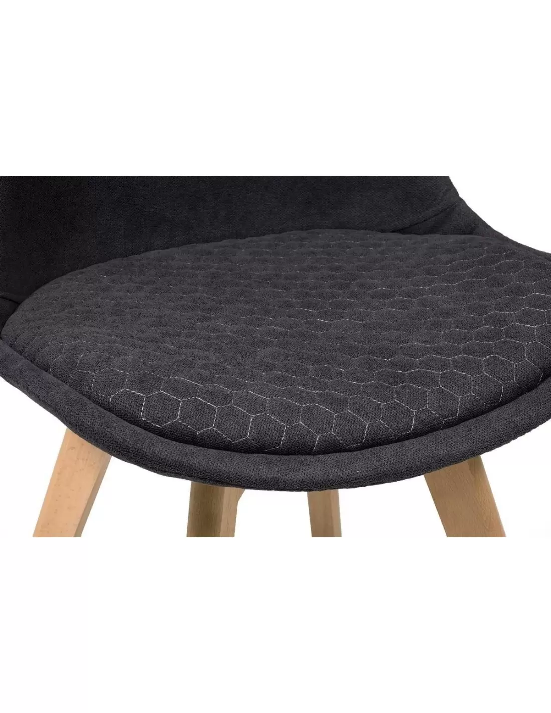 Combinan unas originales patas de madera de madera de haya, con un asiento de polipropileno tapizado en una bonita y suave tela pespunteada con dibujo hexagonal.