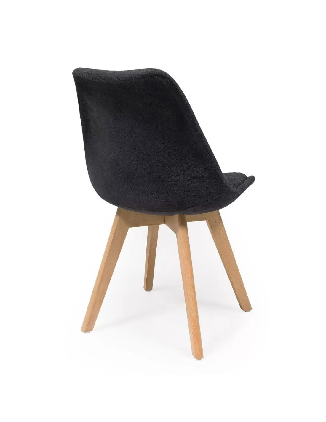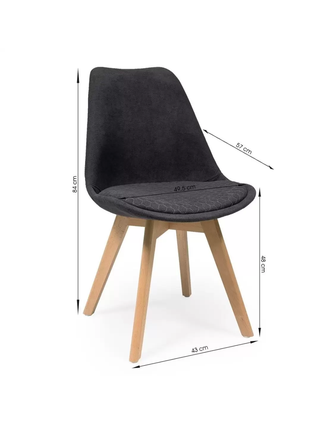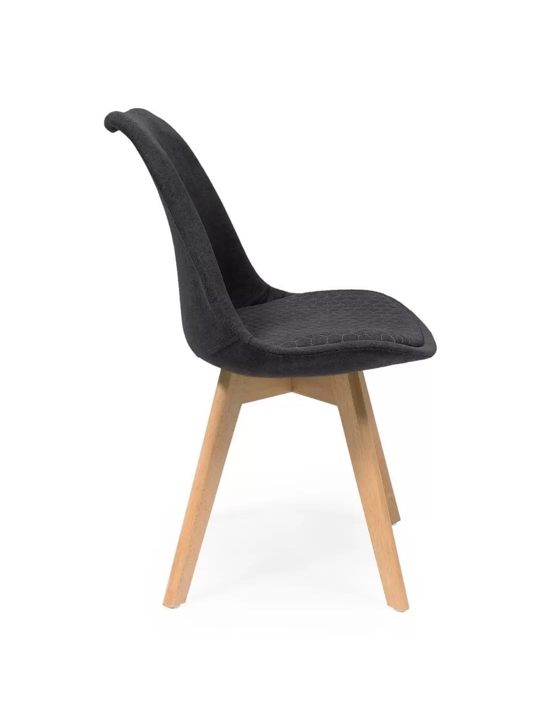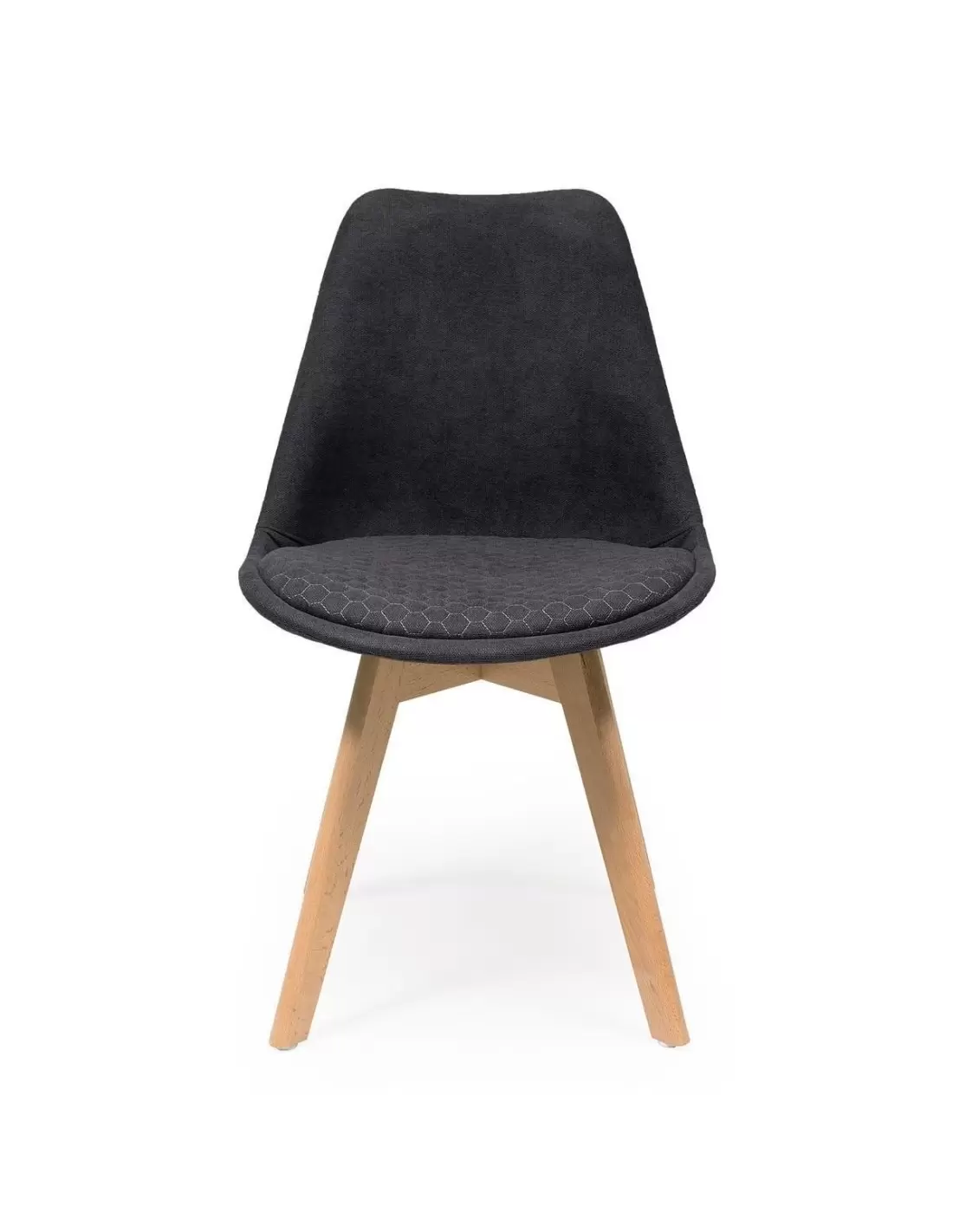 Combinan unas originales patas de madera de madera de haya, con un asiento de polipropileno tapizado en una bonita y suave tela pespunteada con dibujo hexagonal.