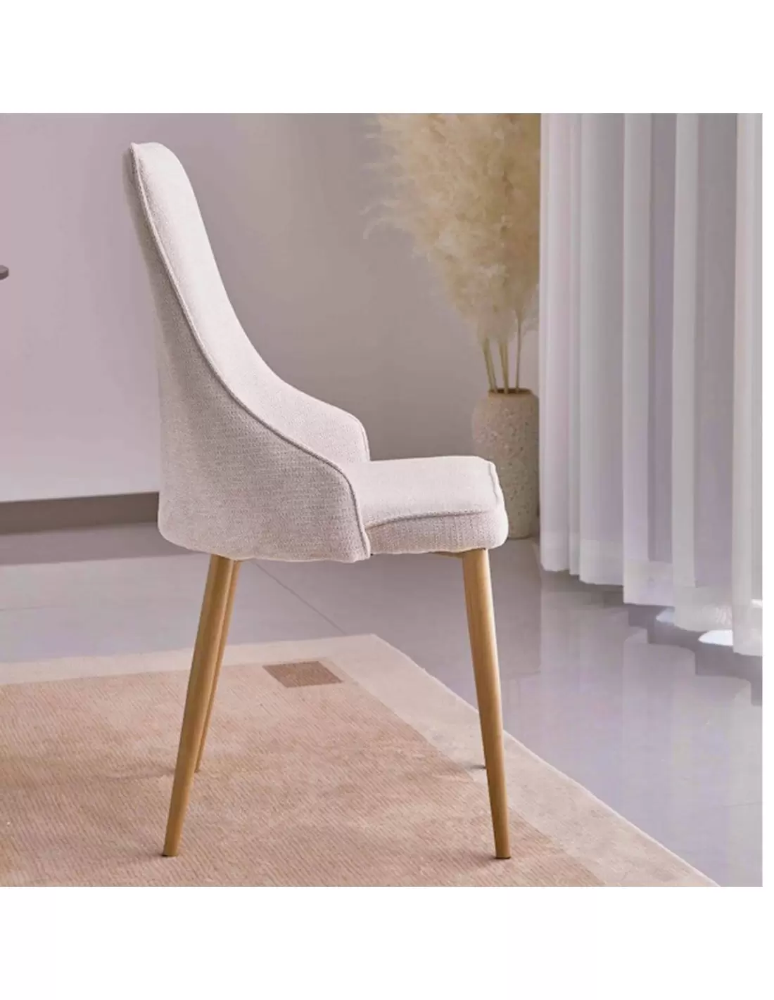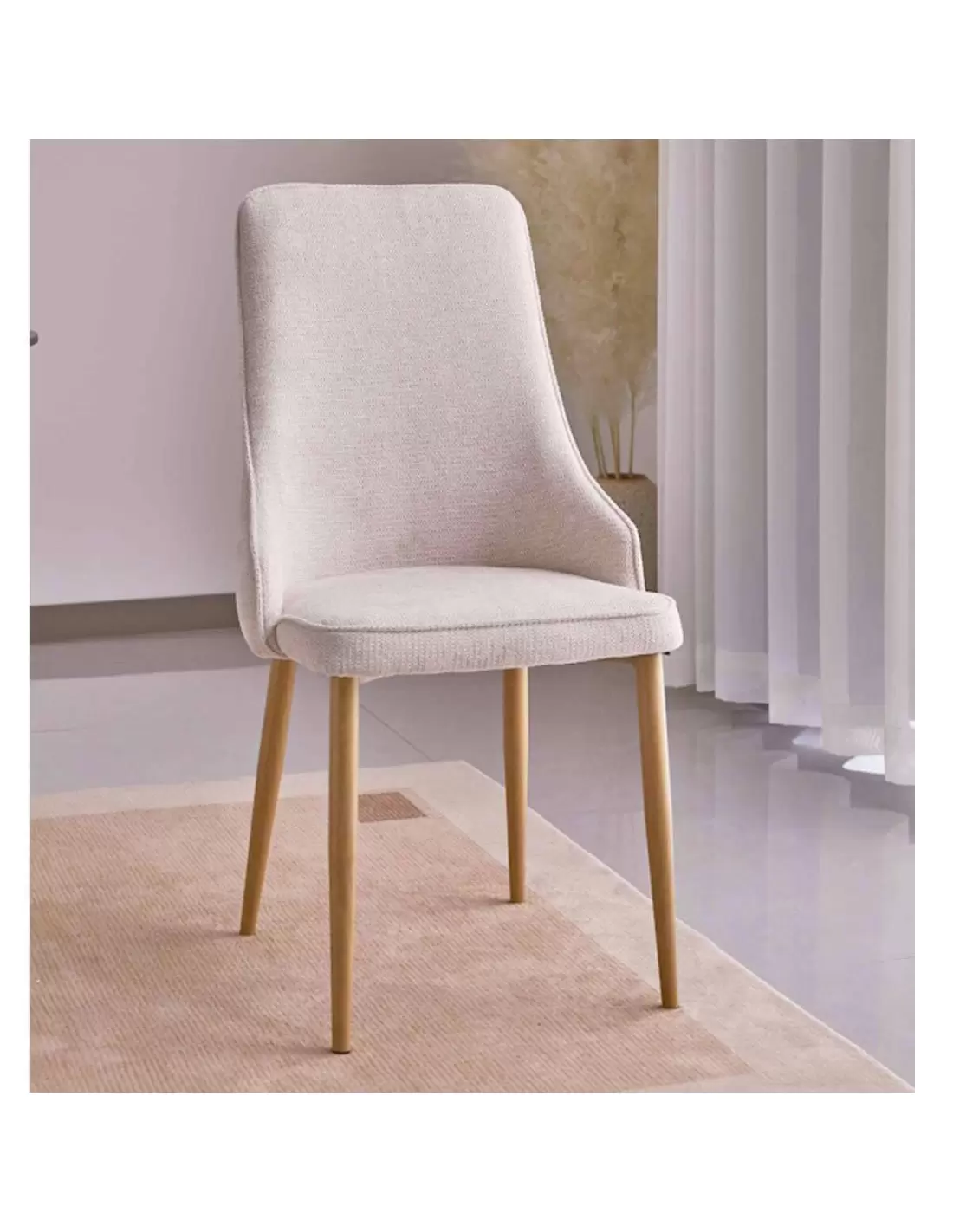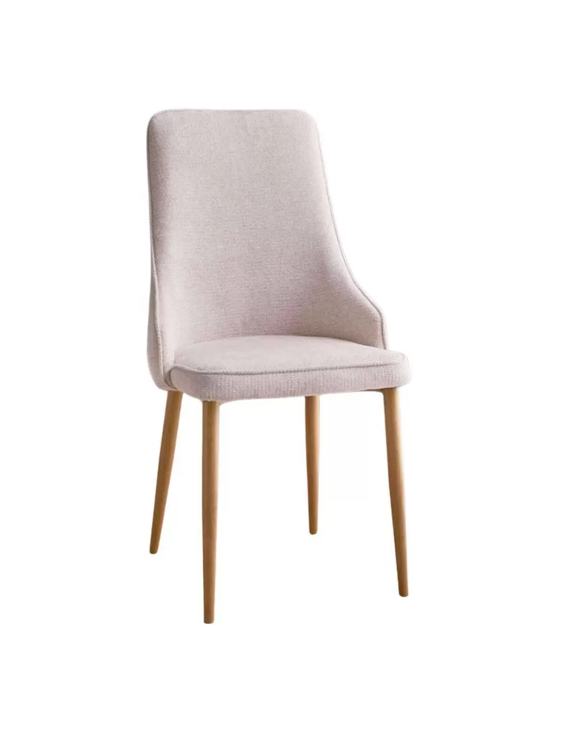 QUEEN son unas sillas tapizadas en tela disponible en dos tonos, beige y gris, con unas estilizadas patas metálicas con acabado en madera.