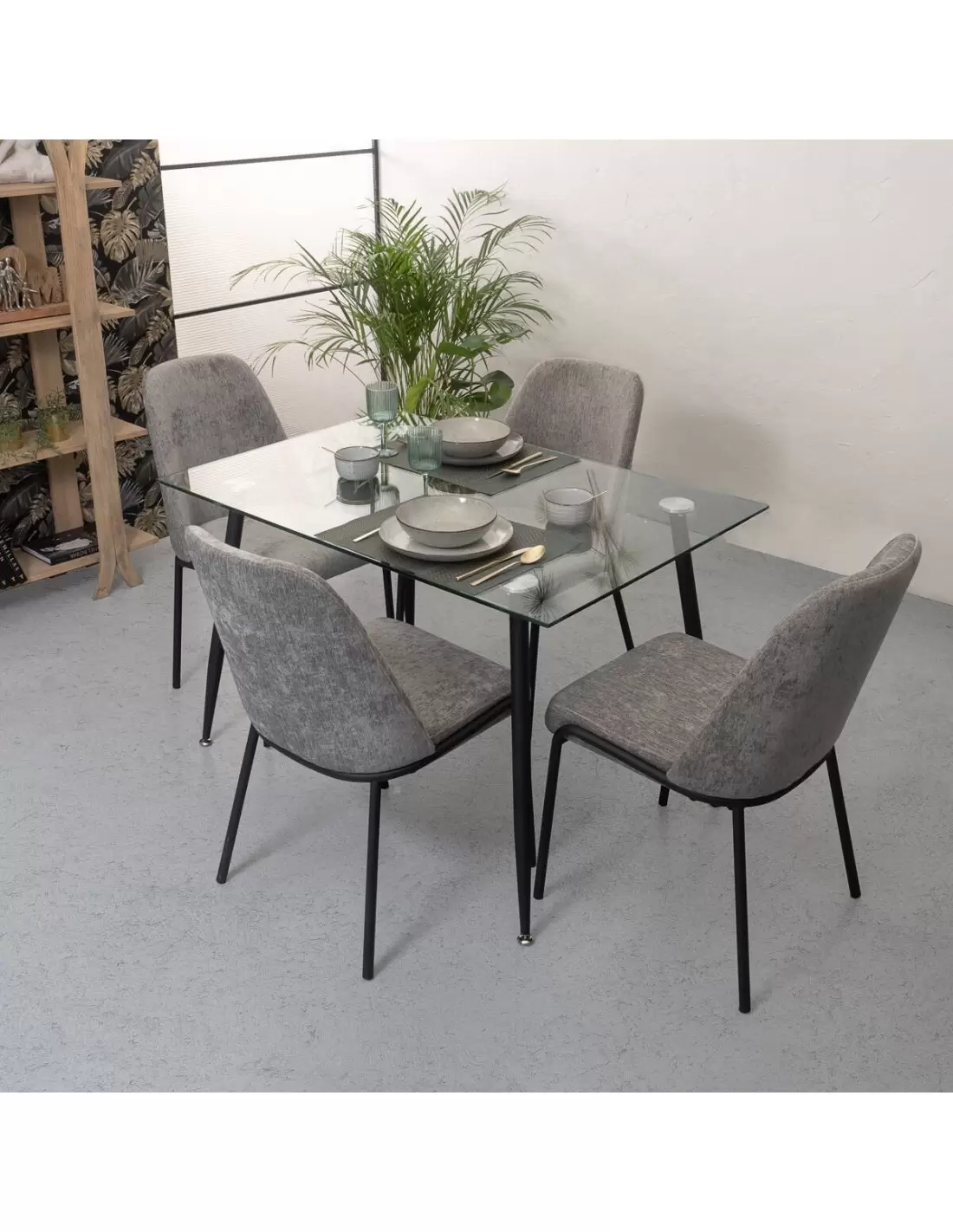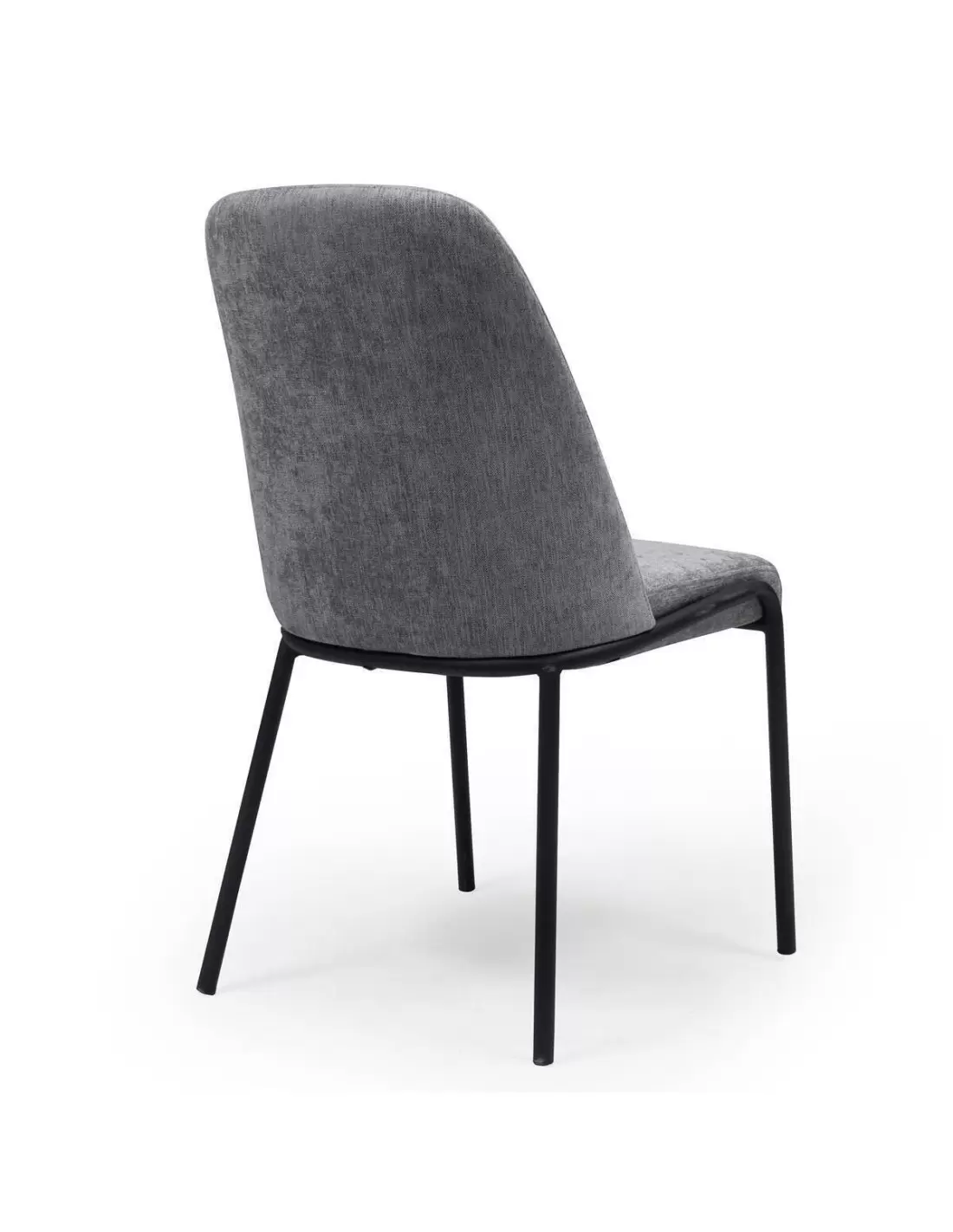 Silla de comedor DURAN, tapizada en tela jaspeada color gris o verde, patas metálicas color negro