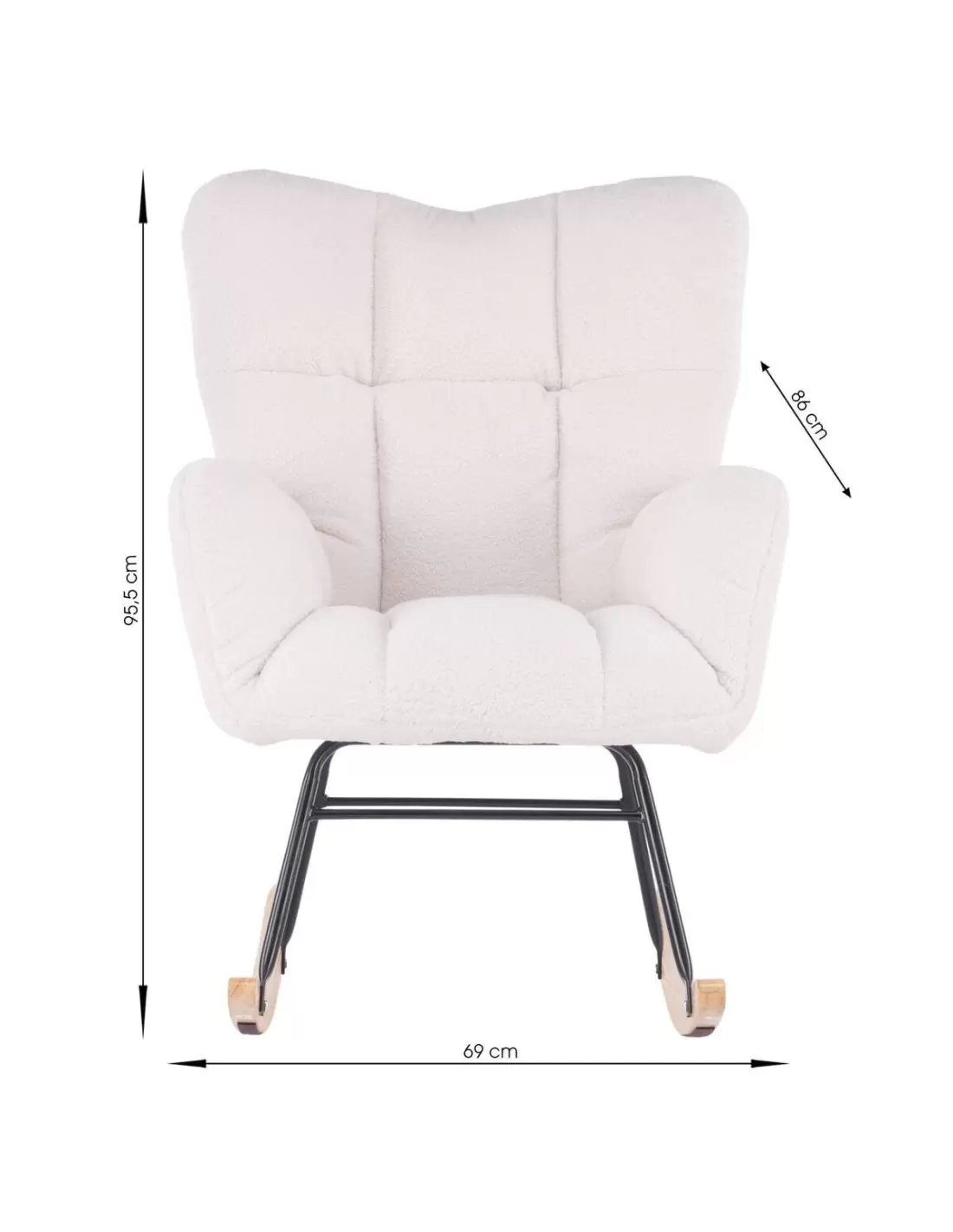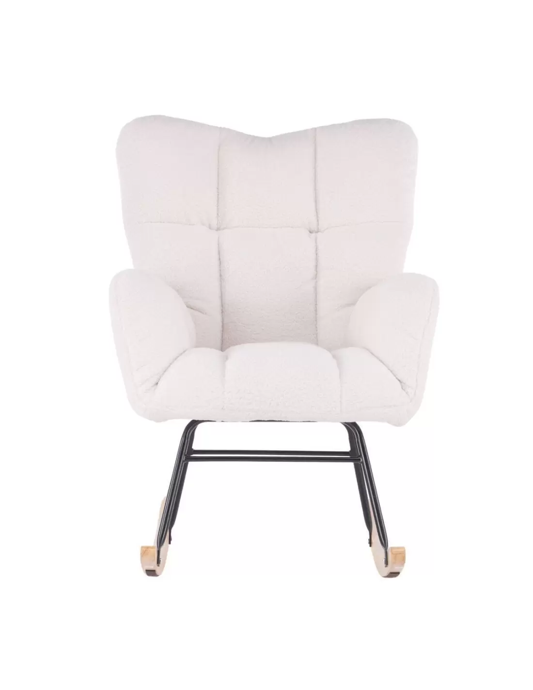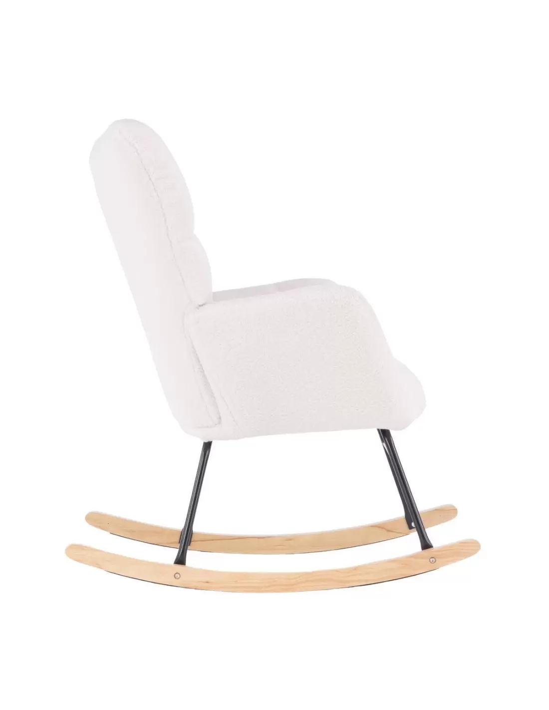 Mecedora LEYRE, tapizada en tela tipo teddy, patas metálicas color negro y patín de madera