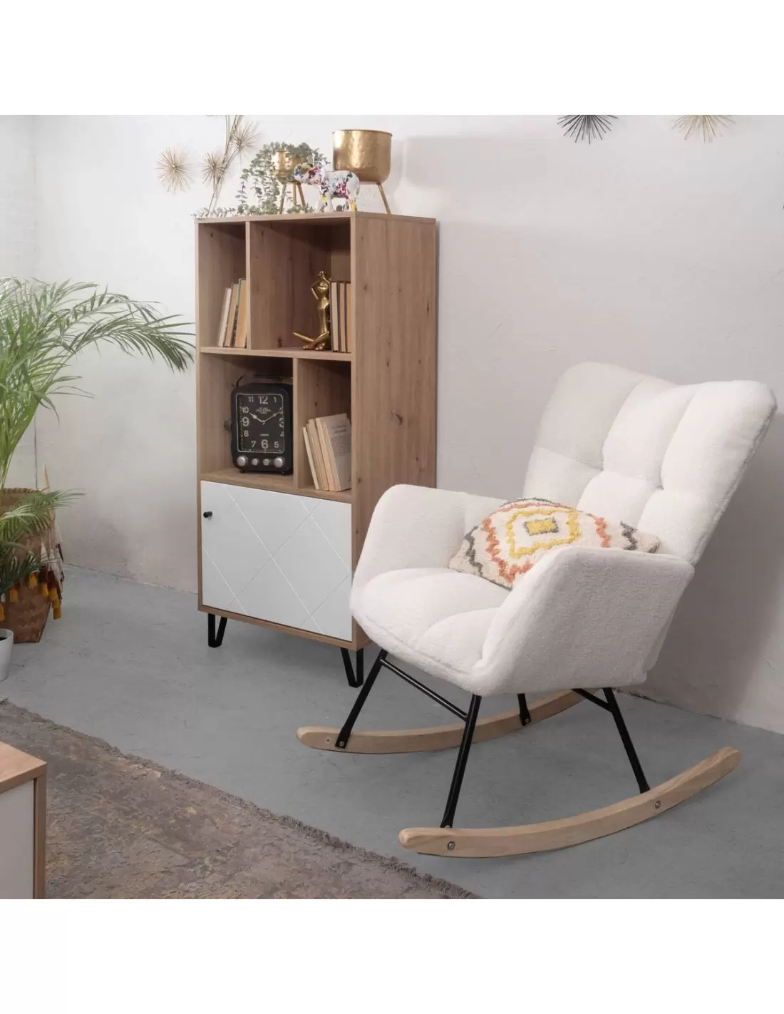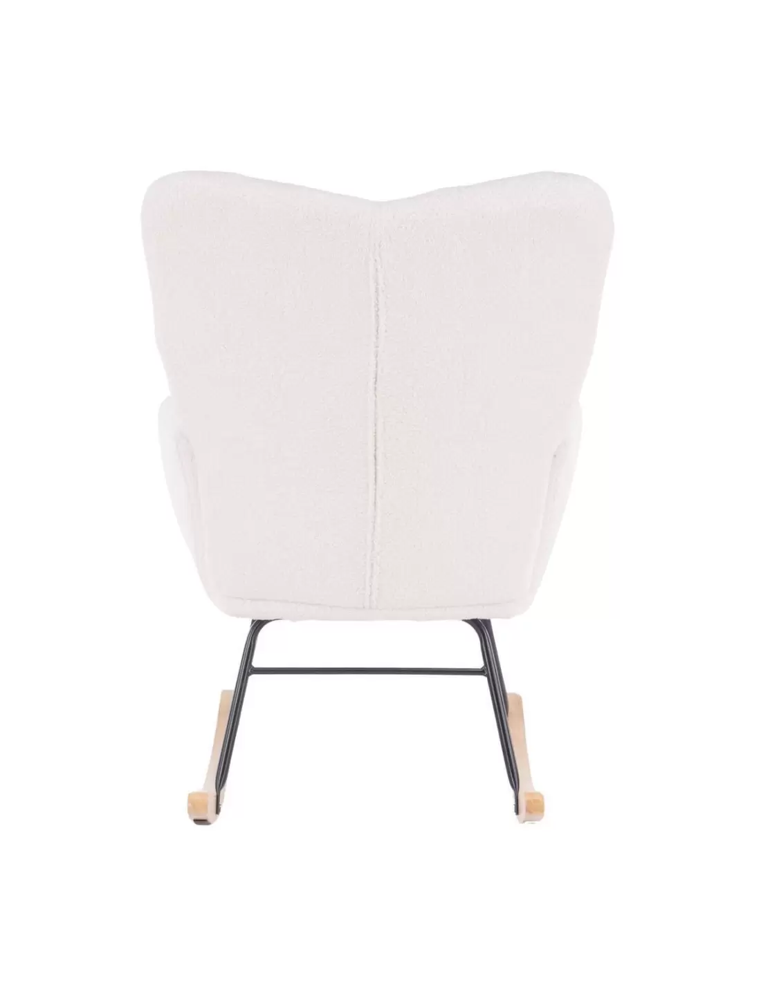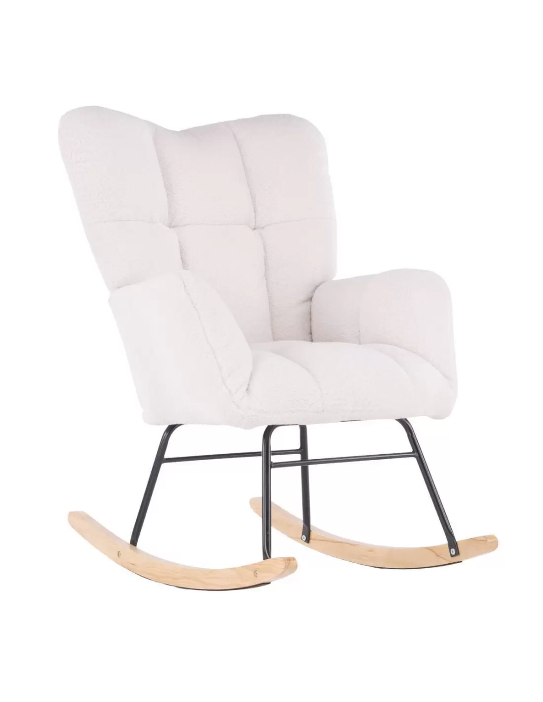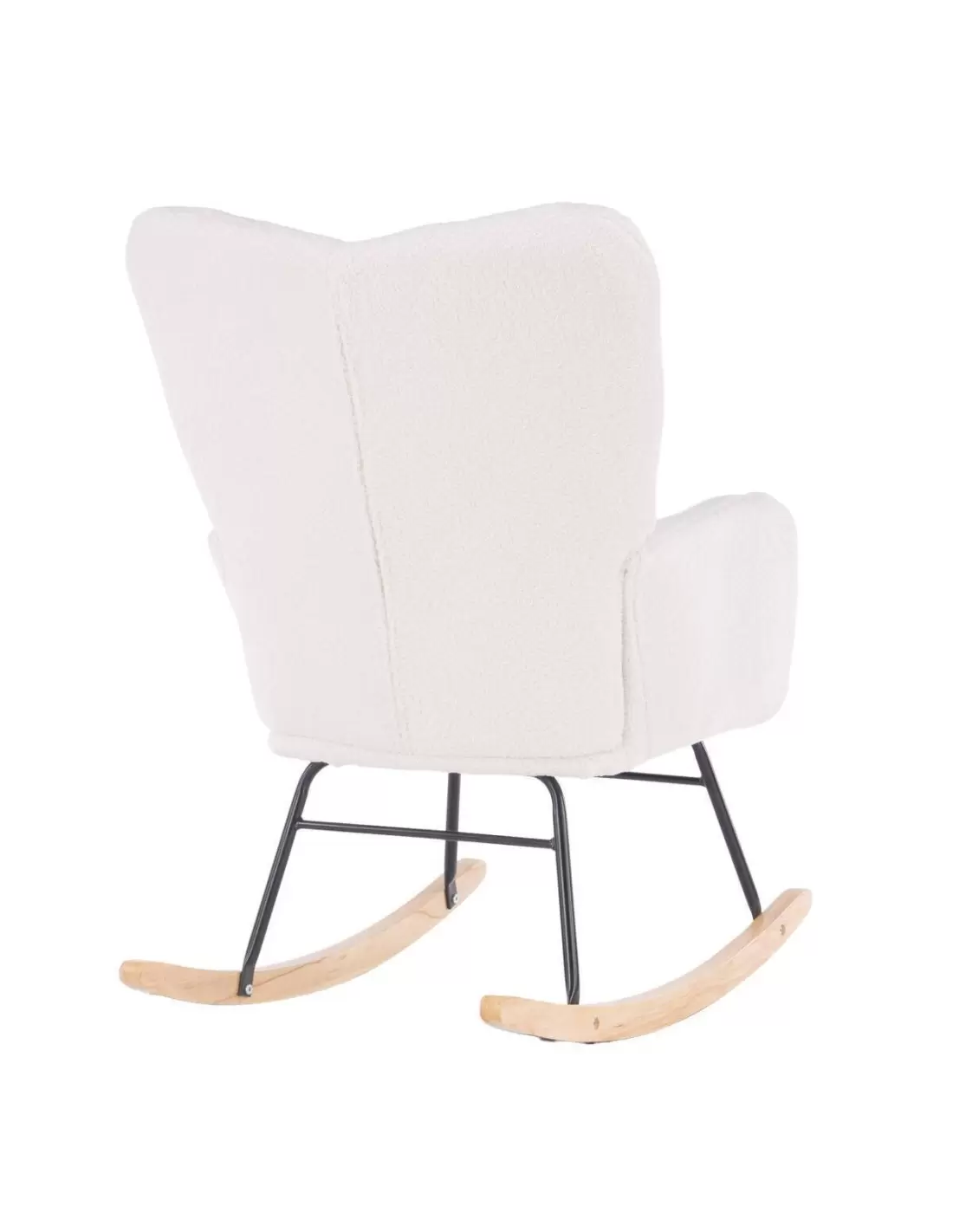 Mecedora LEYRE, tapizada en tela tipo teddy, patas metálicas color negro y patín de madera