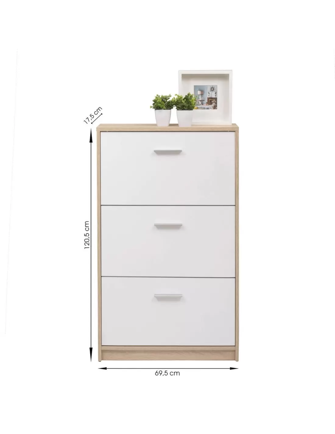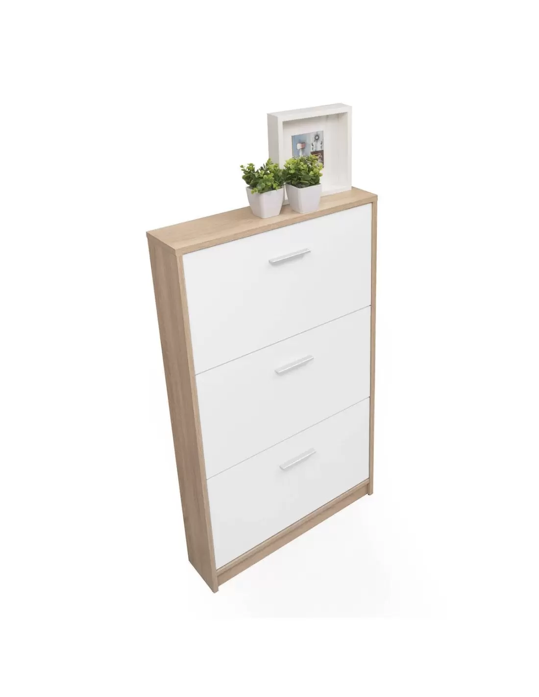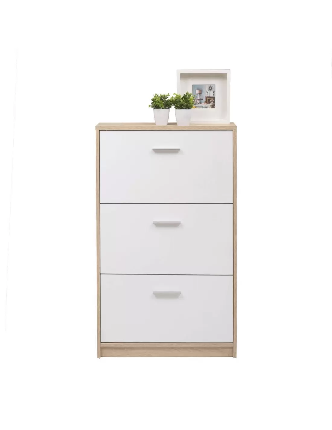 Moderno mueble zapatero con 4 puertas (3 abatibles + 1 lateral) y 5 estantes interiores, ideal para almacenar hasta 24 pares de zapatos. Fabricado con tablero de partículas melaminizado tipo E1, cantos en PVC y melamina, tiradores metálicos negros y sistema abatible ABS de alta resistencia. Color: Blanco...